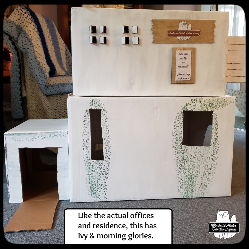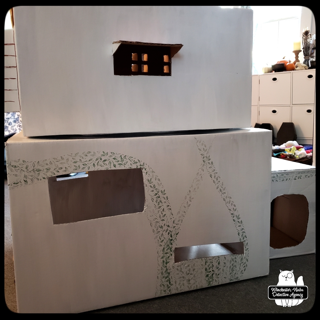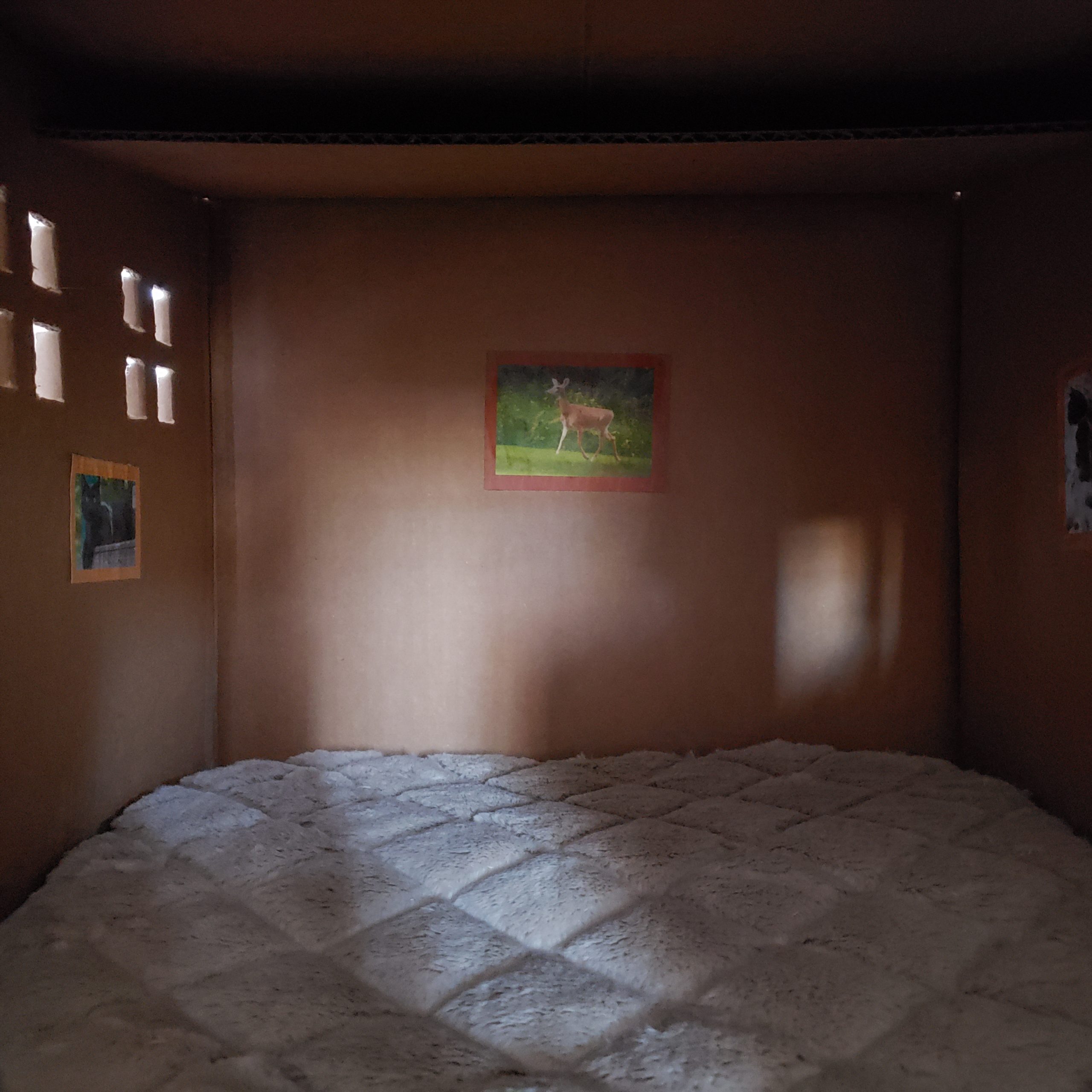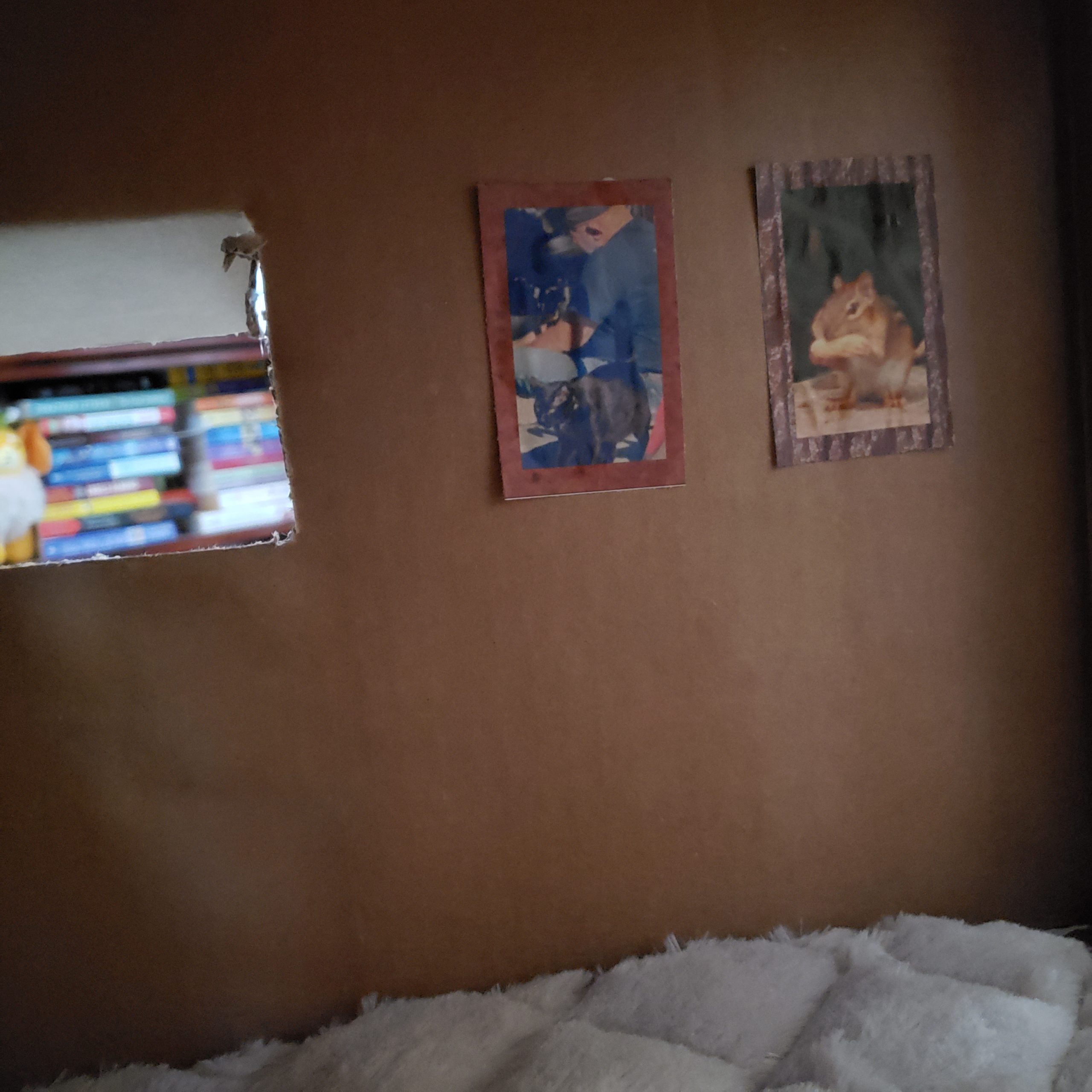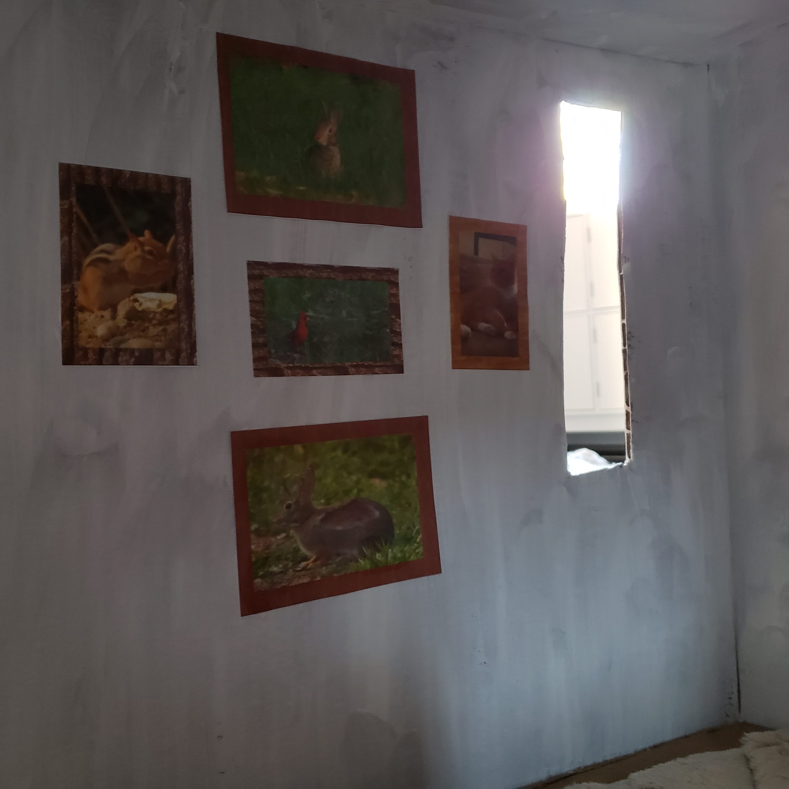 Portraits of the cats, the humans, and some of our wildlife adventures were printed and hung. This was harder than you might think. Since all the box flaps had been glued and taped, I had to reach through the doors and small windows trying to get the portraits hung. A few are crooked. Most recently I added what was a terrarium but I had killed the plant so I replaced the plant with some of the bones we’ve collected.