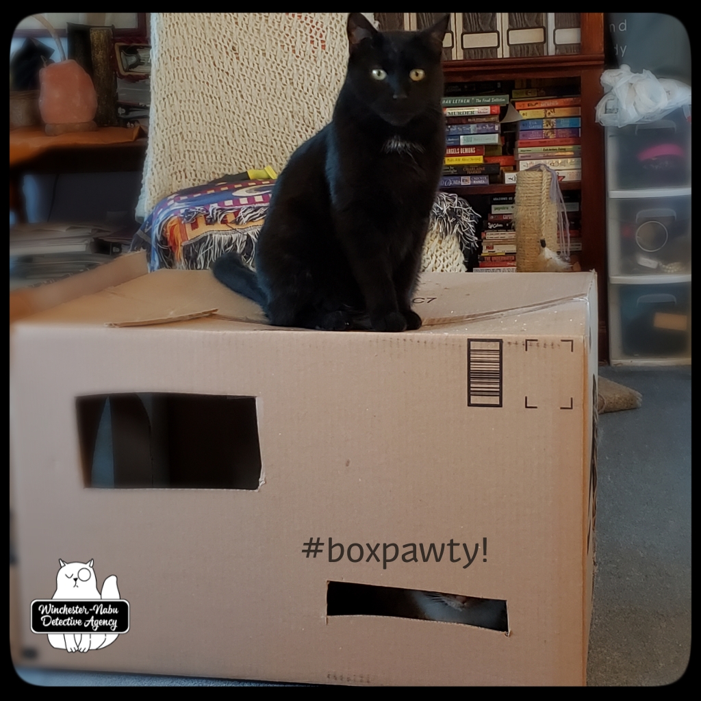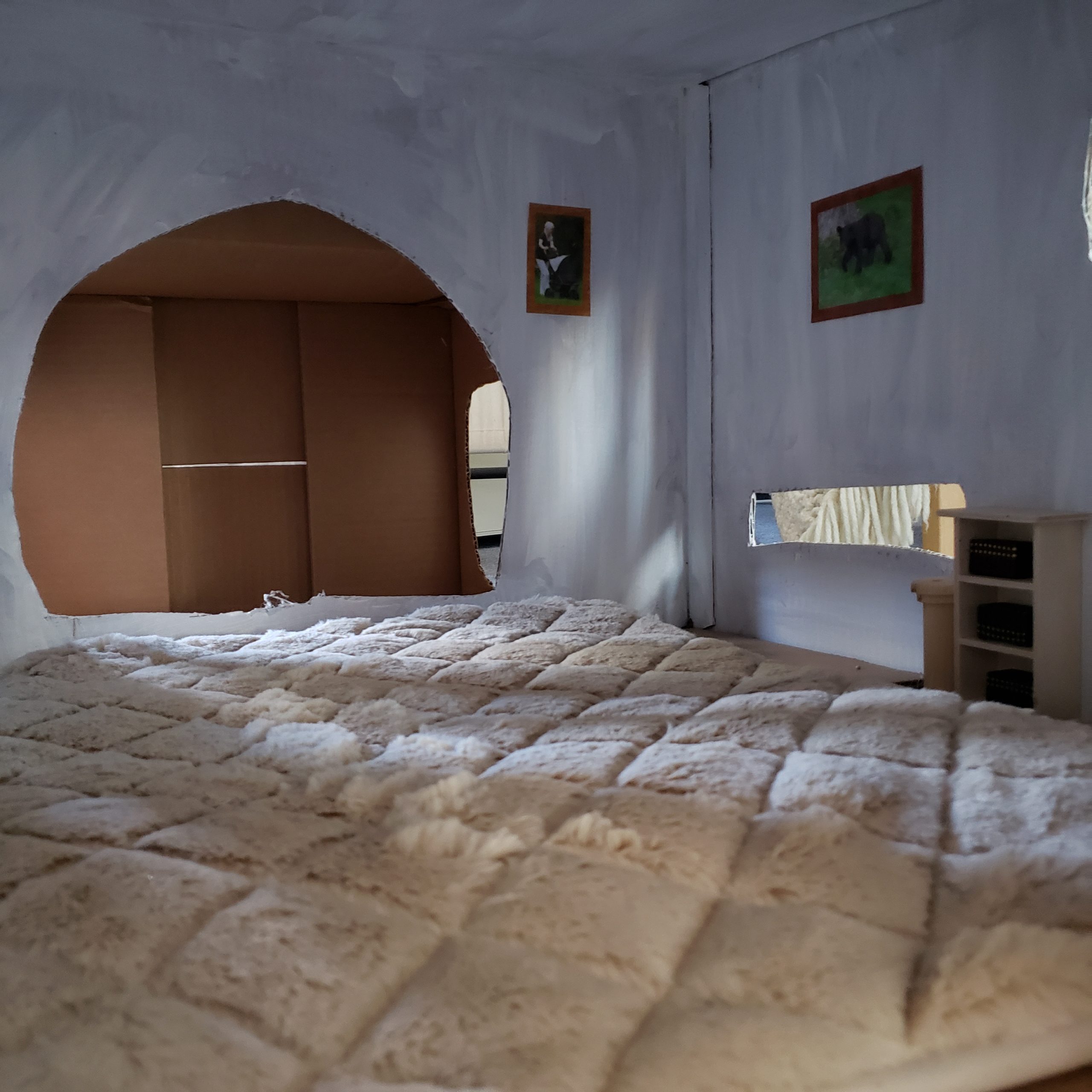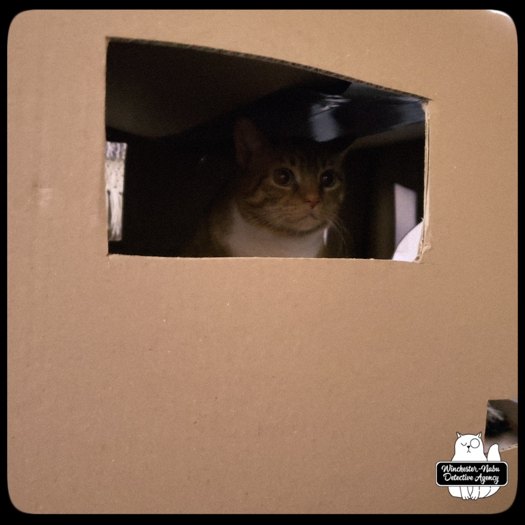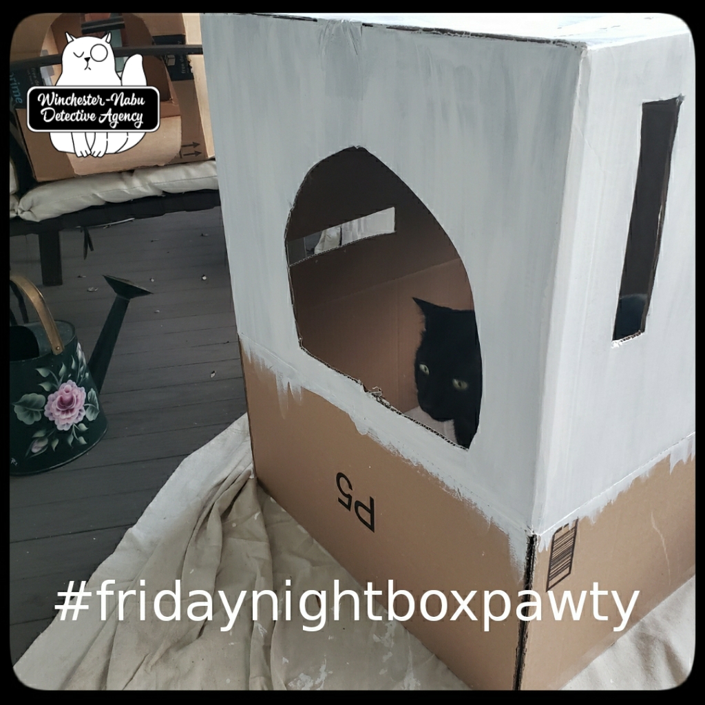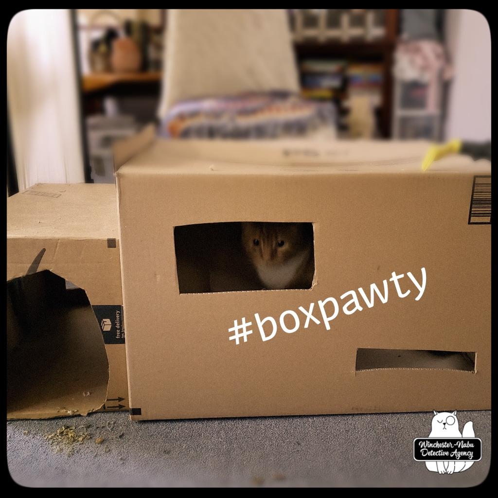 Portraits of the cats, the humans, and some of our wildlife adventures were printed and hung. This was harder than you might think. Since all the box flaps had been glued and taped, I had to reach through the doors and small windows trying to get the portraits hung. A few are crooked. Most recently I added what was a terrarium but I had killed the plant so I replaced the plant with some of the bones we’ve collected.