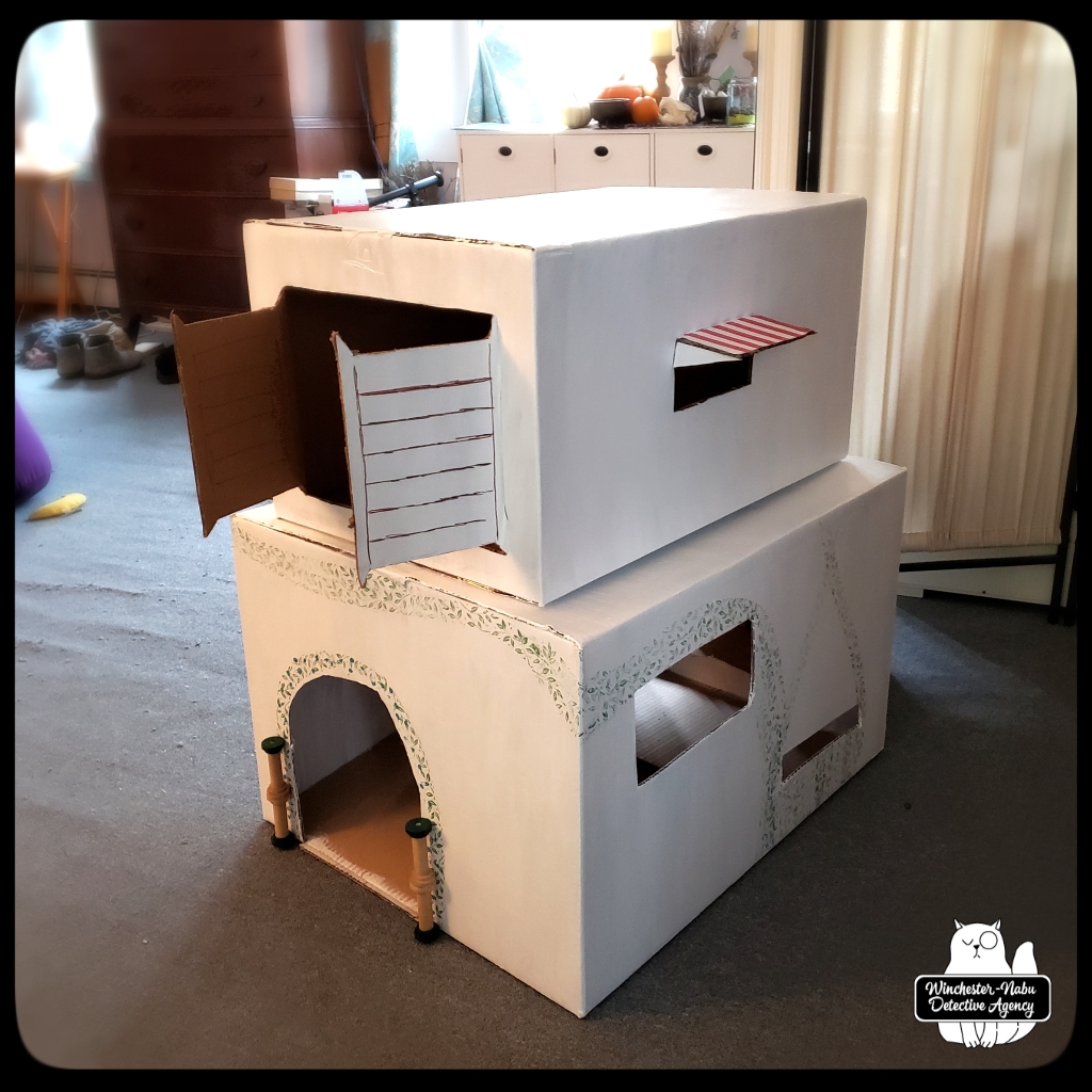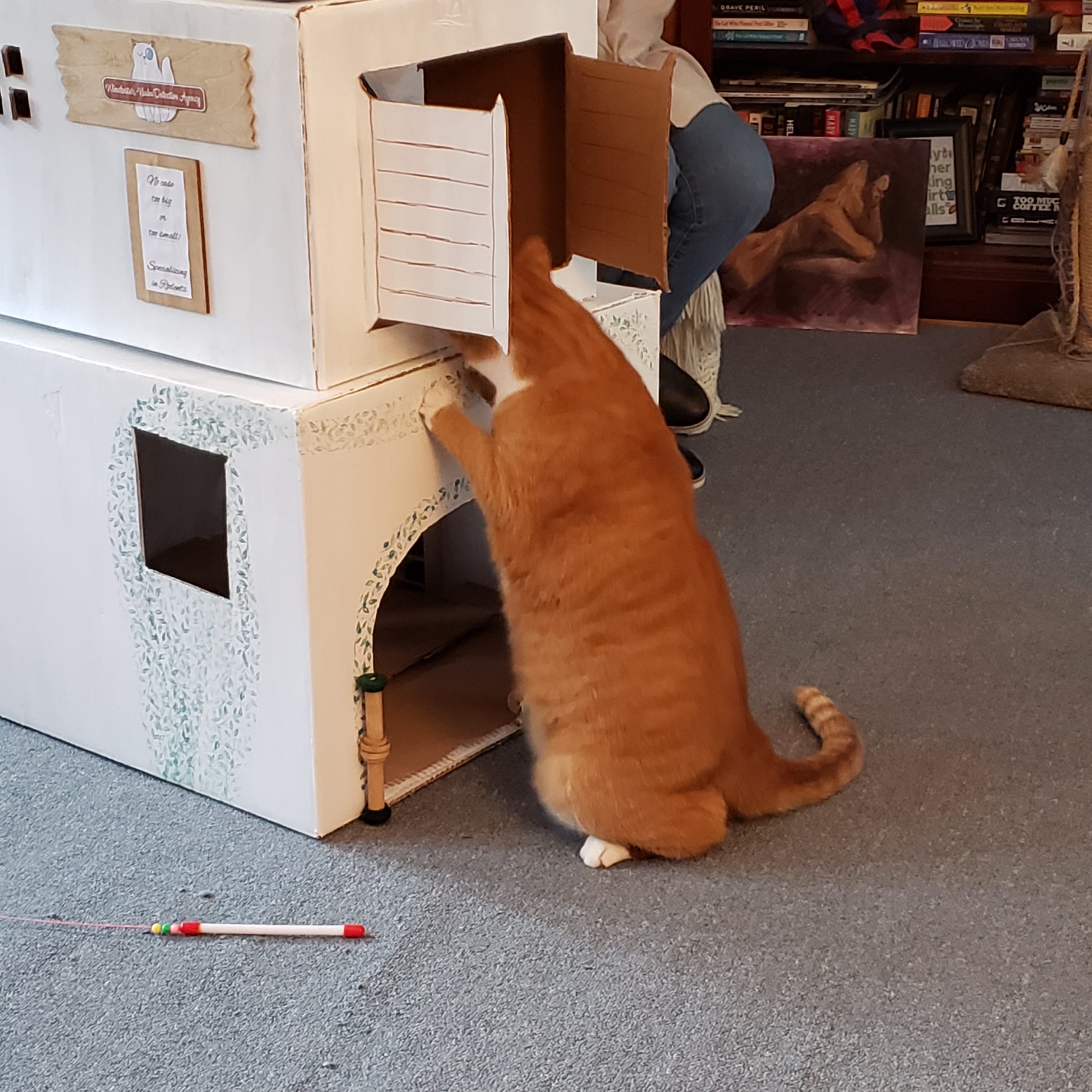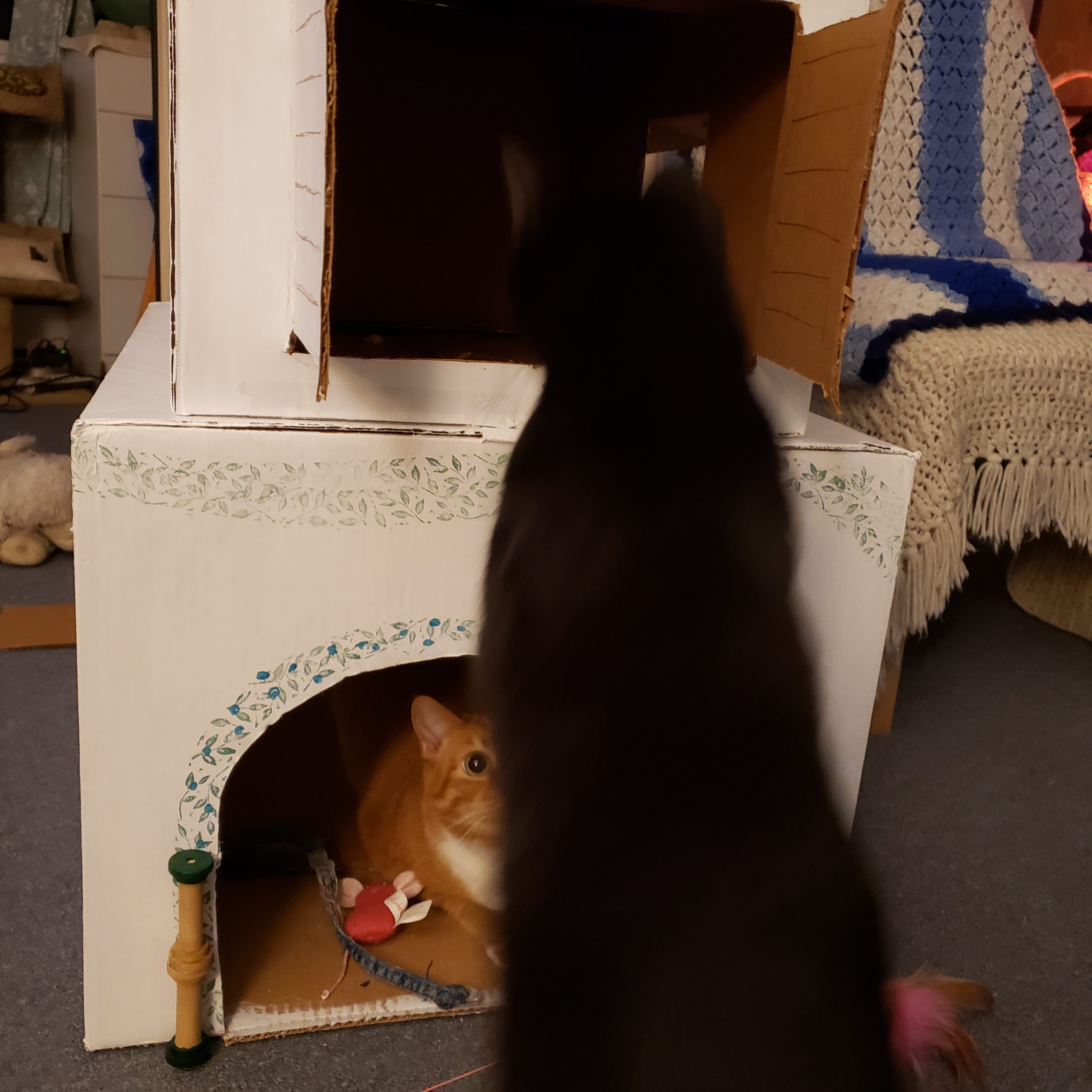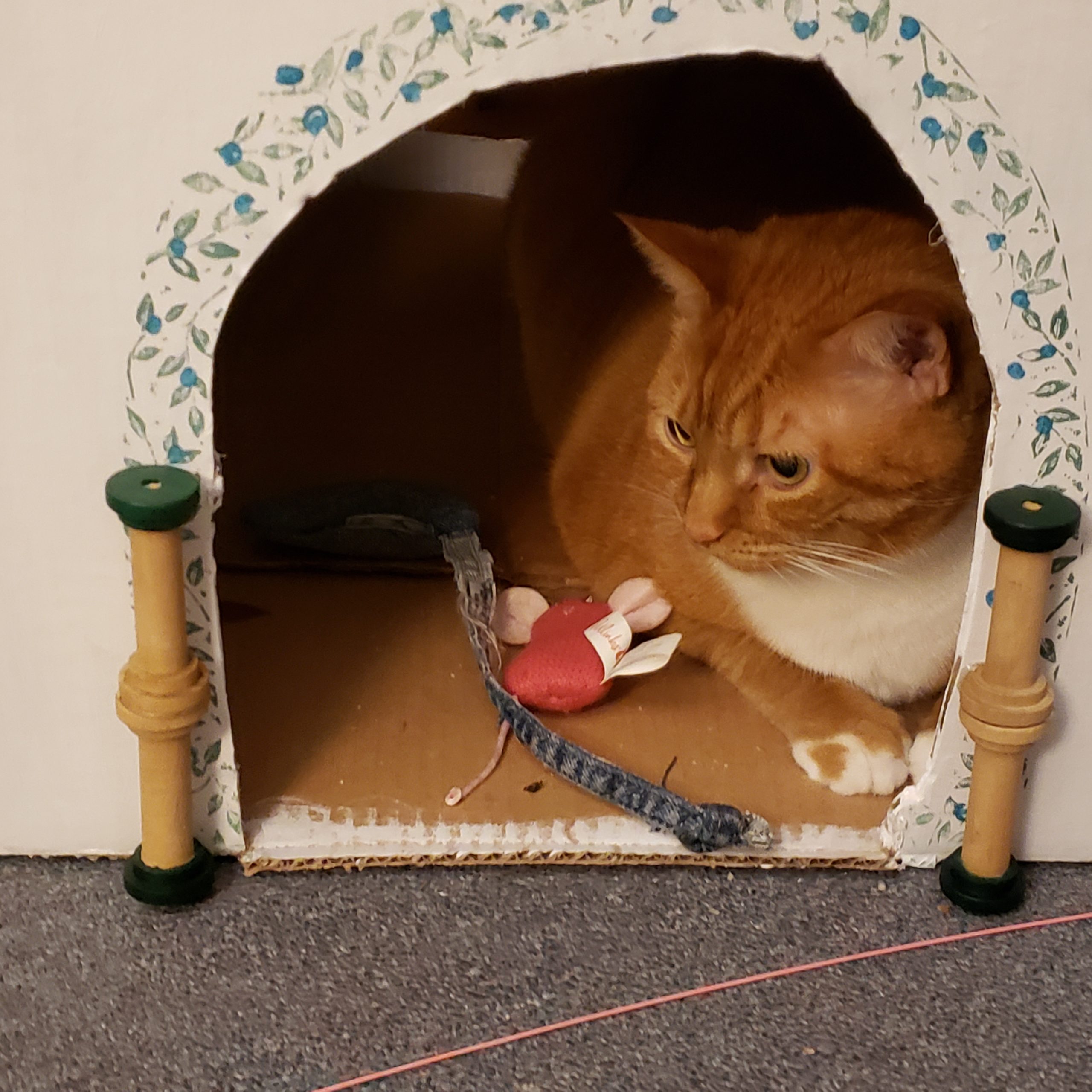 Gus was not interested at all in jumping up to the roof of this new second floor that’s supposed to be Gus’ tavern. I had to train him with treats. I bought three mats from Chewy that were cheap to be the carpets of the roof and main floors. Ollie was first hesitant because of the smell, I suspect. But he was more eager to check out the new digs. However, once treats were associated with the fort, both of them had no problem going in and on it.