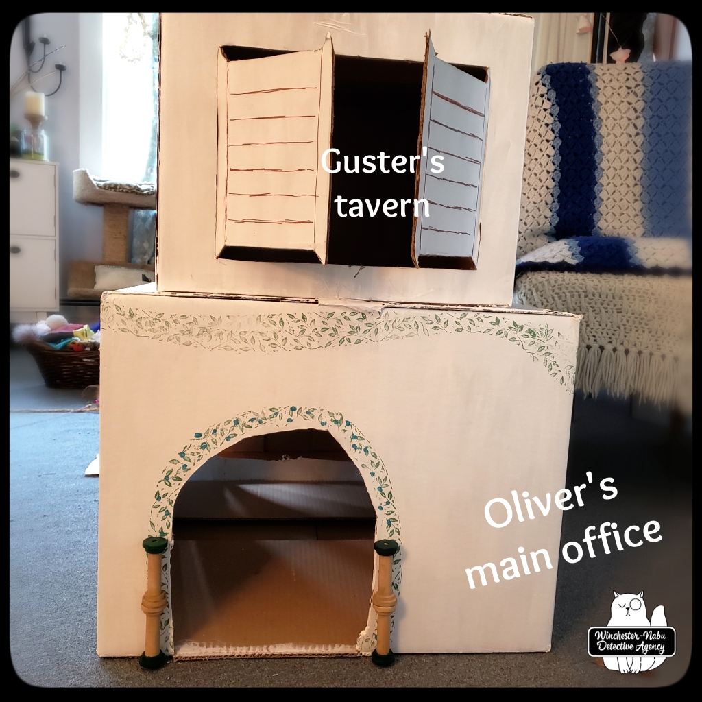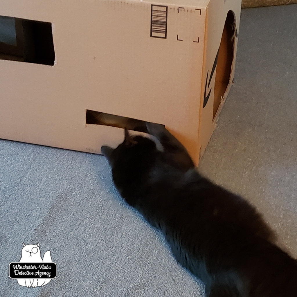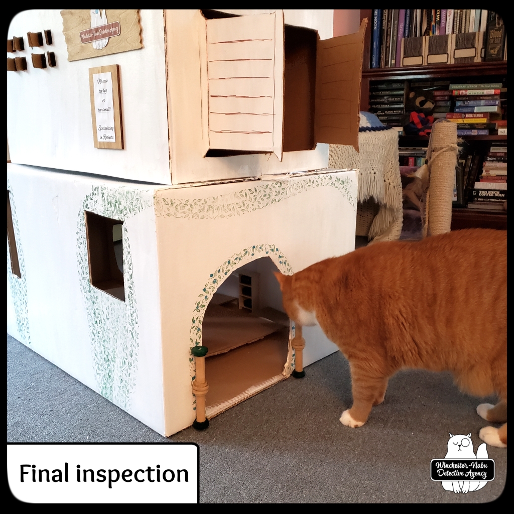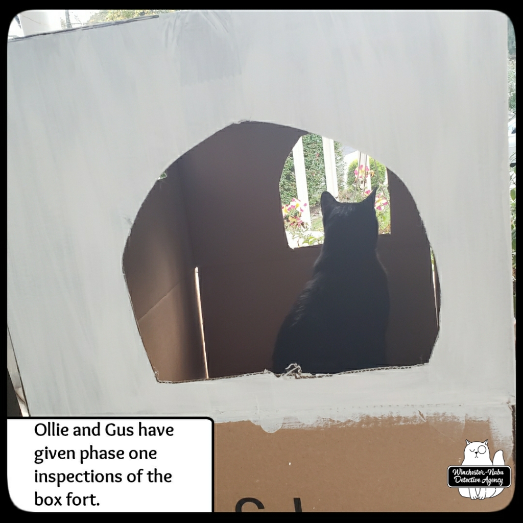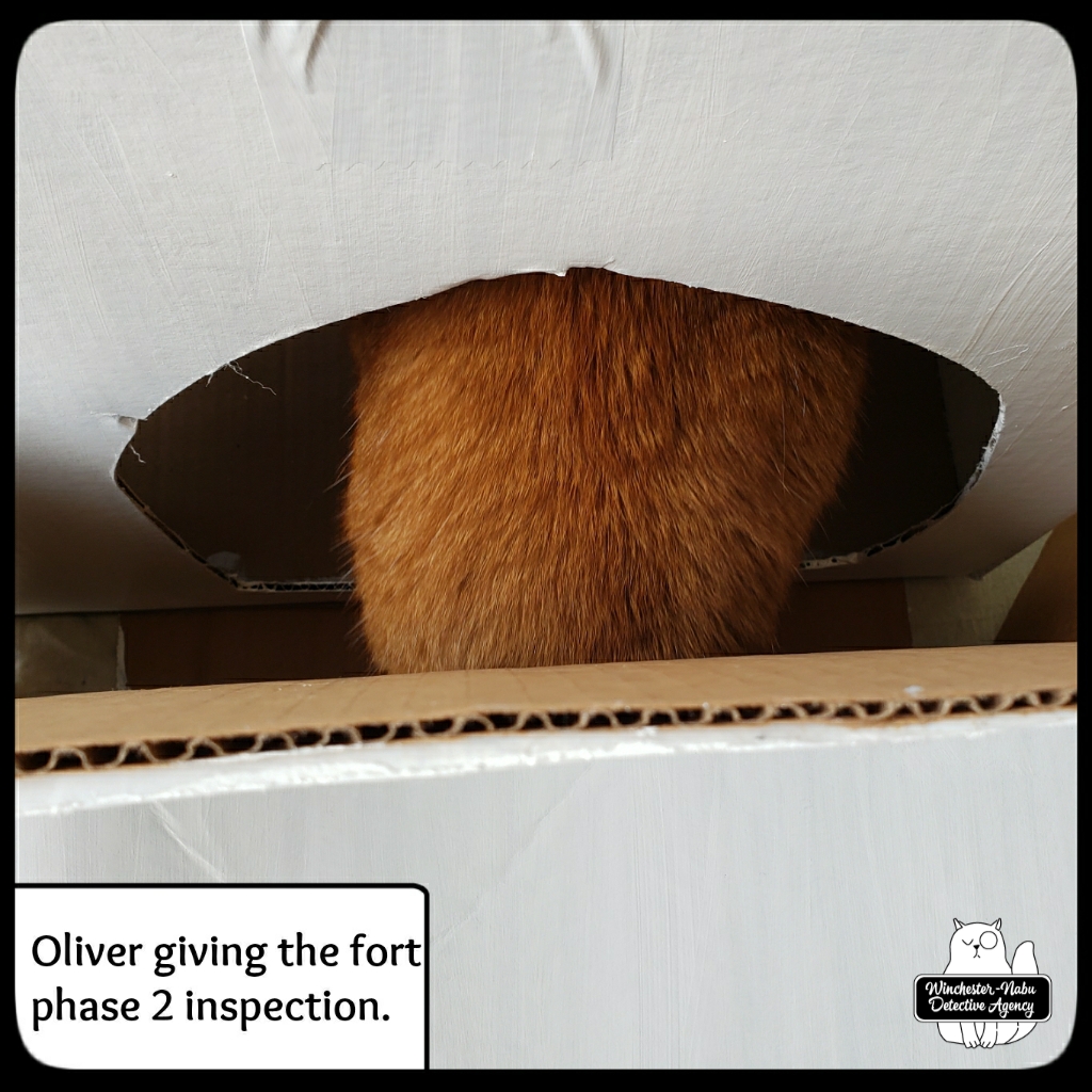 Gus was not interested at all in jumping up to the roof of this new second floor that’s supposed to be Gus’ tavern. I had to train him with treats. I bought three mats from Chewy that were cheap to be the carpets of the roof and main floors. Ollie was first hesitant because of the smell, I suspect. But he was more eager to check out the new digs. However, once treats were associated with the fort, both of them had no problem going in and on it.