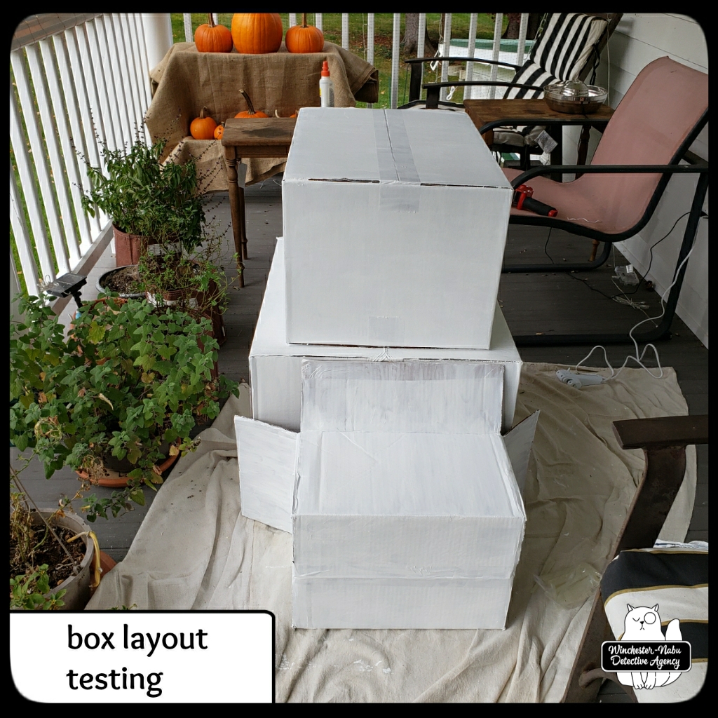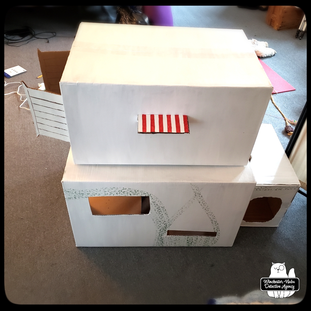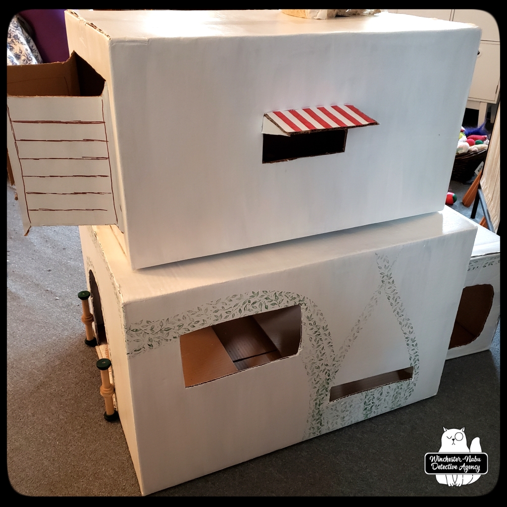 The white paint and the hot glue were drying almost instantly because of the weather. I spent two days on the painting doing the exteriors of all three boxes and the interior of the largest box which would be Oliver’s office. Once those were dry, I brought all the pieces inside to work on where the hot glue would give me a few more seconds to fit pieces together. I made the awning for the one window and used a marker for the red stripes.