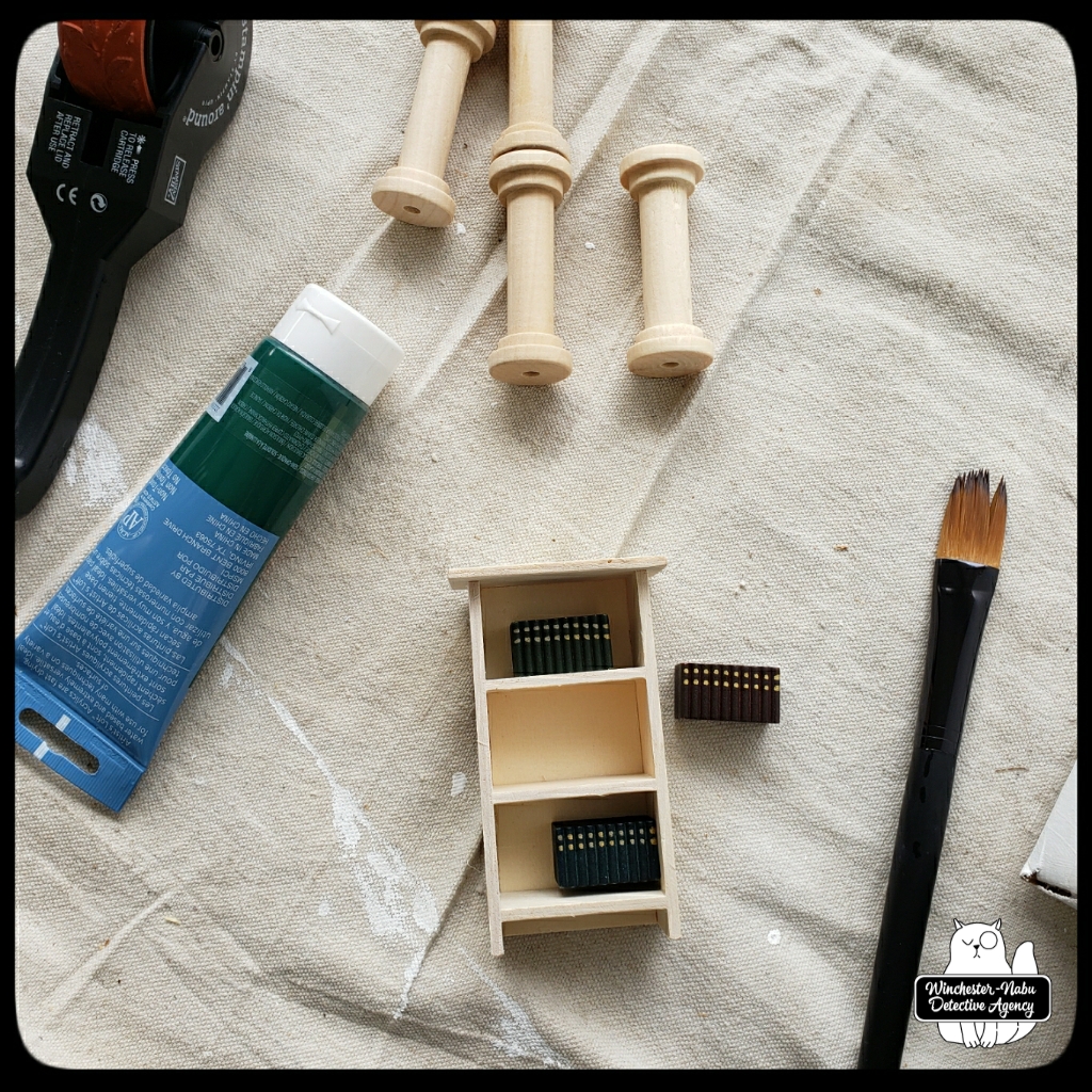 I stained the wood pieces except for the bookcase with the black walnut ink I made in October. I printed out the lettering for the signs because I know my lettering would have looked awful. I glued the paper to the wooden plaques to make the signs. I glued the pillars and painted the bases after the stain set in. Then glued them to the box on either side of the front door.