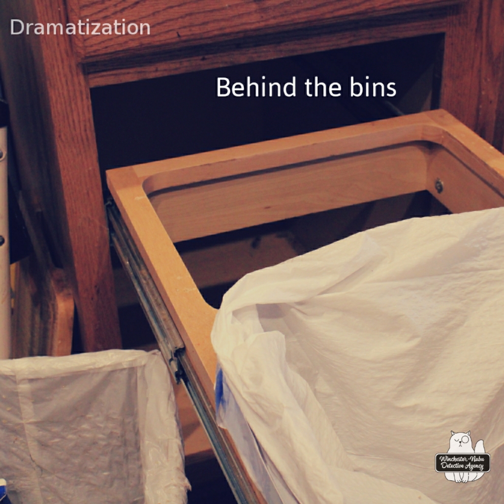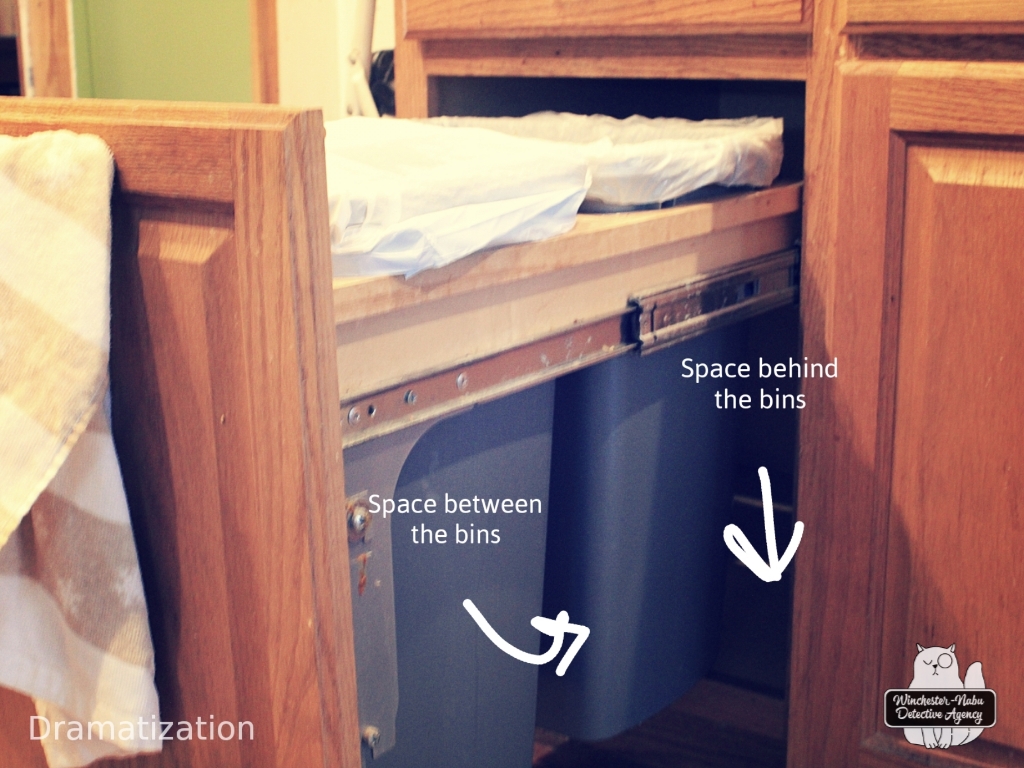 I don’t remember why I moved towards the garbage cabinet in particular. My brain was in panic mode. Whatever it was, I tried to pull the bin drawer open and it was quite stuck. I knew and could see that there was no garbage stuck at the top since the bins were virtually empty. What the hell? I put more effort into it and pulled hard.