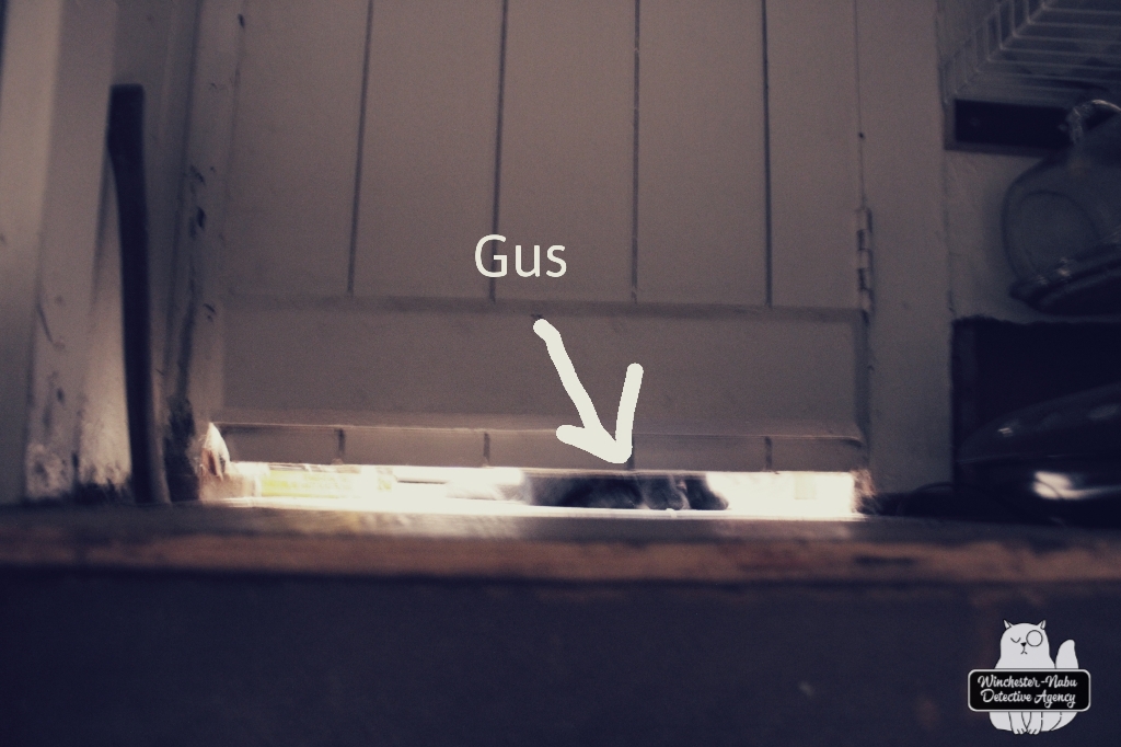 This specific drawer/cabinet is a main story element here. You should also know it’s next to the cellar door. Like other doors, the cellar door is fit for hobbits and halflings. The moulding around it has never been finished like all the other renovation projects that have occurred in this house sitting at the ninety percent completed mark on a project task bar. Around the cellar door there are holes in the floor. We’ve seen mice escape to this area during 3AM chases. Gus has become fascinated by this rustic and squeaky door. He’s not supposed to be in cellar because of all the possible places in which he could become trapped.