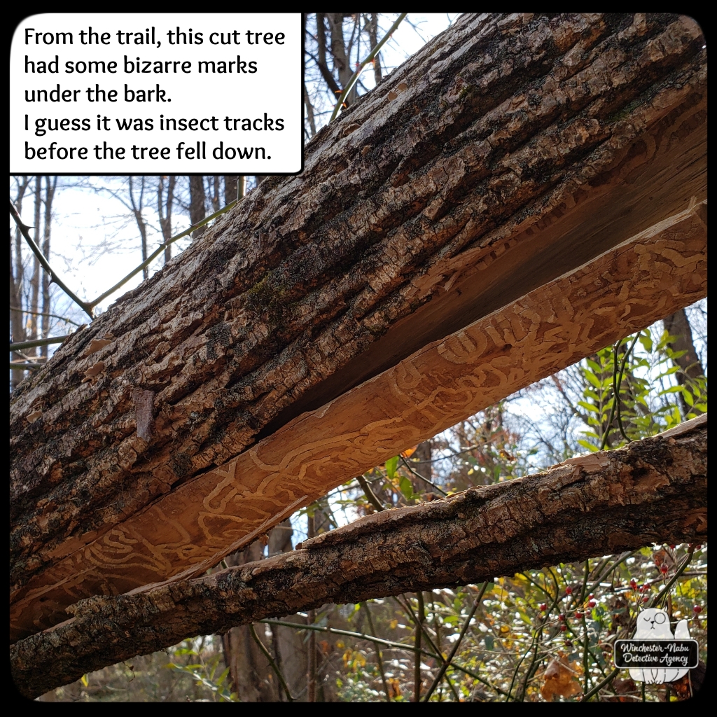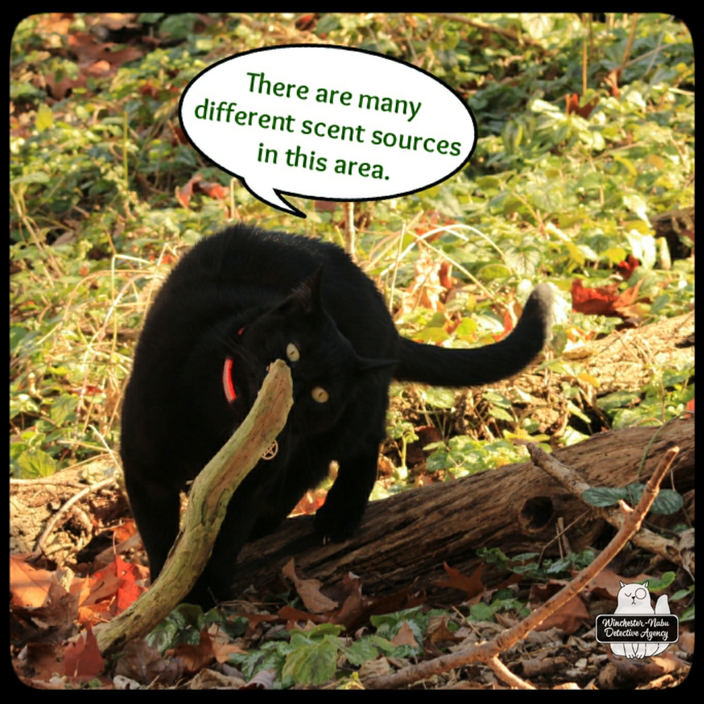 I’ve been around people who don’t understand that the entire world doesn’t need to smell their perfume, cologne, or body spray so it felt plausible that Gus could detect a creature that had been near the logs without rubbing a scent gland on them. His SuperSmeller is far superior to mine after all. As it turned out, we had two things to consider in this one investigation.