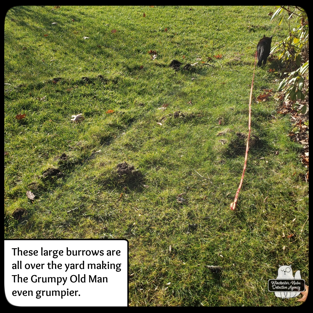 None of those were the marker that held Gus’ attention with the firewood. We know mice were living in the stack of logs because The Grumpy Old Man removed nesting material when he was putting wood into the wheelbarrow. What do mice attract? Lots of things. Certain birds, cats, snakes, and anything else that likes to eat or socialize with mice. I mean eat them as a meal not invite them over for brunch. The voles are probably willing to have brunch with them, but not the owls or hawks.
