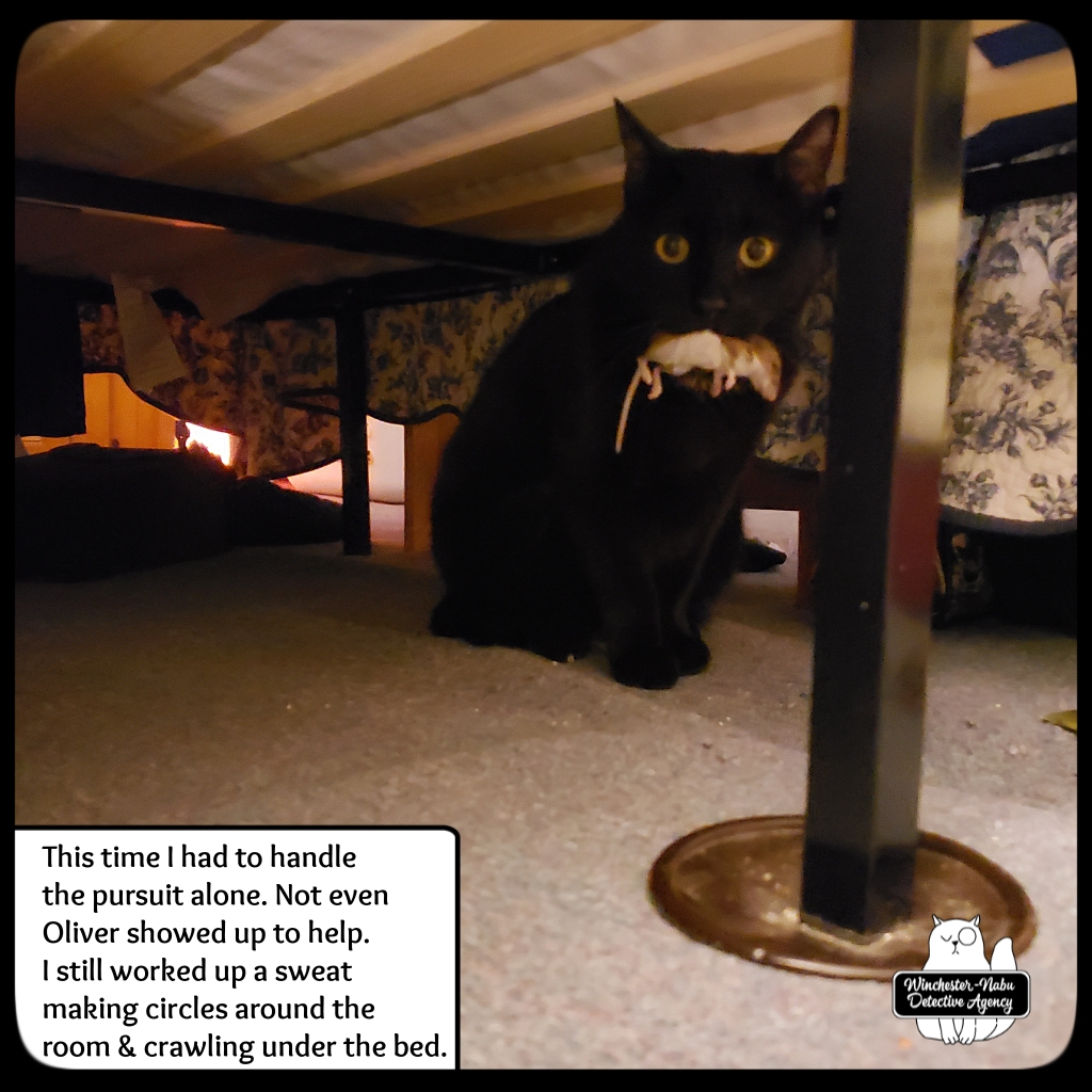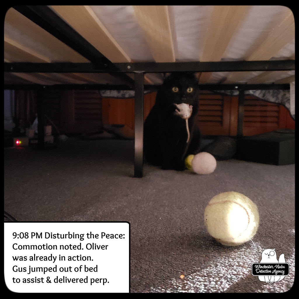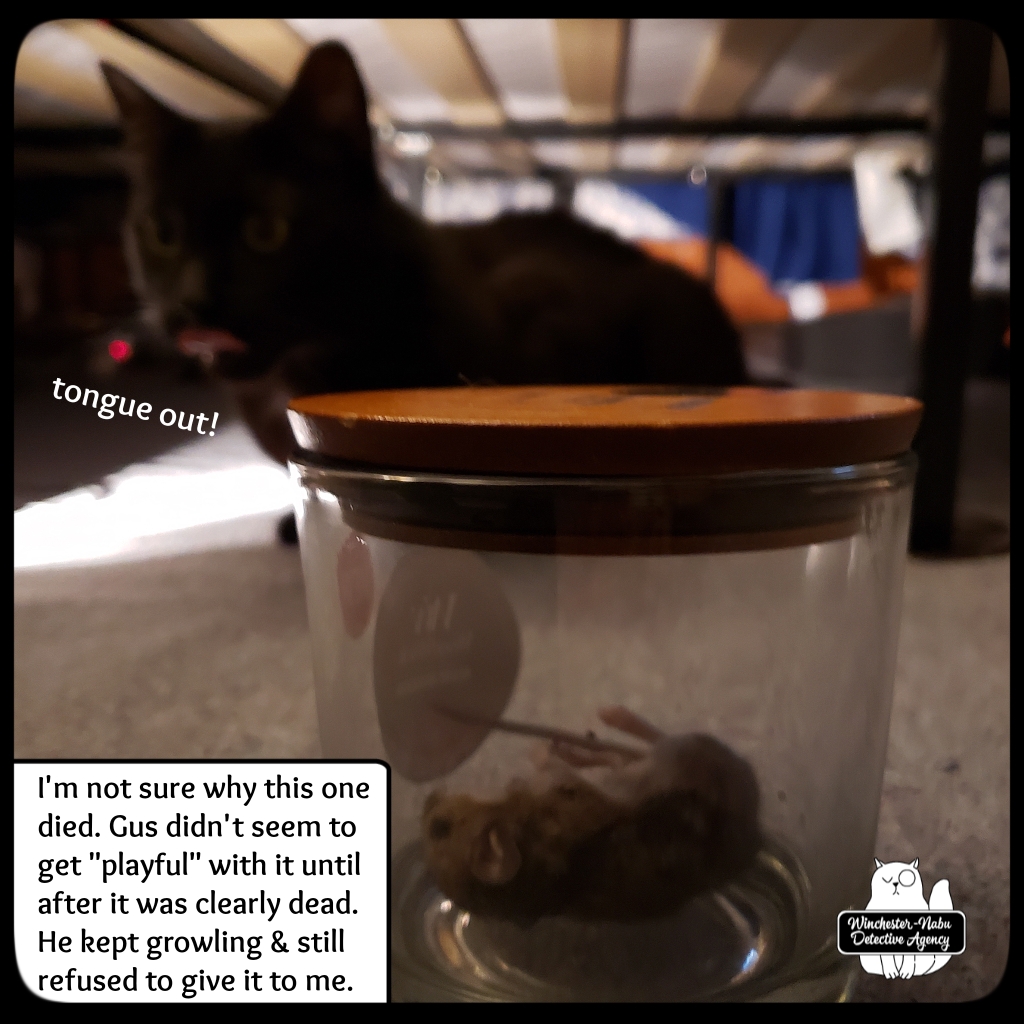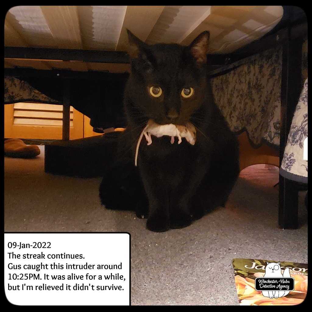 January 9th, The perp he brought to the Winchester-Nabu Detective Agency offices tonight may be the one who escaped twice, but I doubt it. That one had crazy super powers and this one wasn’t all Cross90X or whatever. Gus went through his routine of going under the bed, circling by me, getting under the desk then around to the cat fort. This happens as many times as possible in fifteen minutes. This was one instance where the critter didn’t survive the “ride” in Gus’ majestic fangs. I had to take the body away from him. I put it in the transportation jar and we walked out to the balcony.