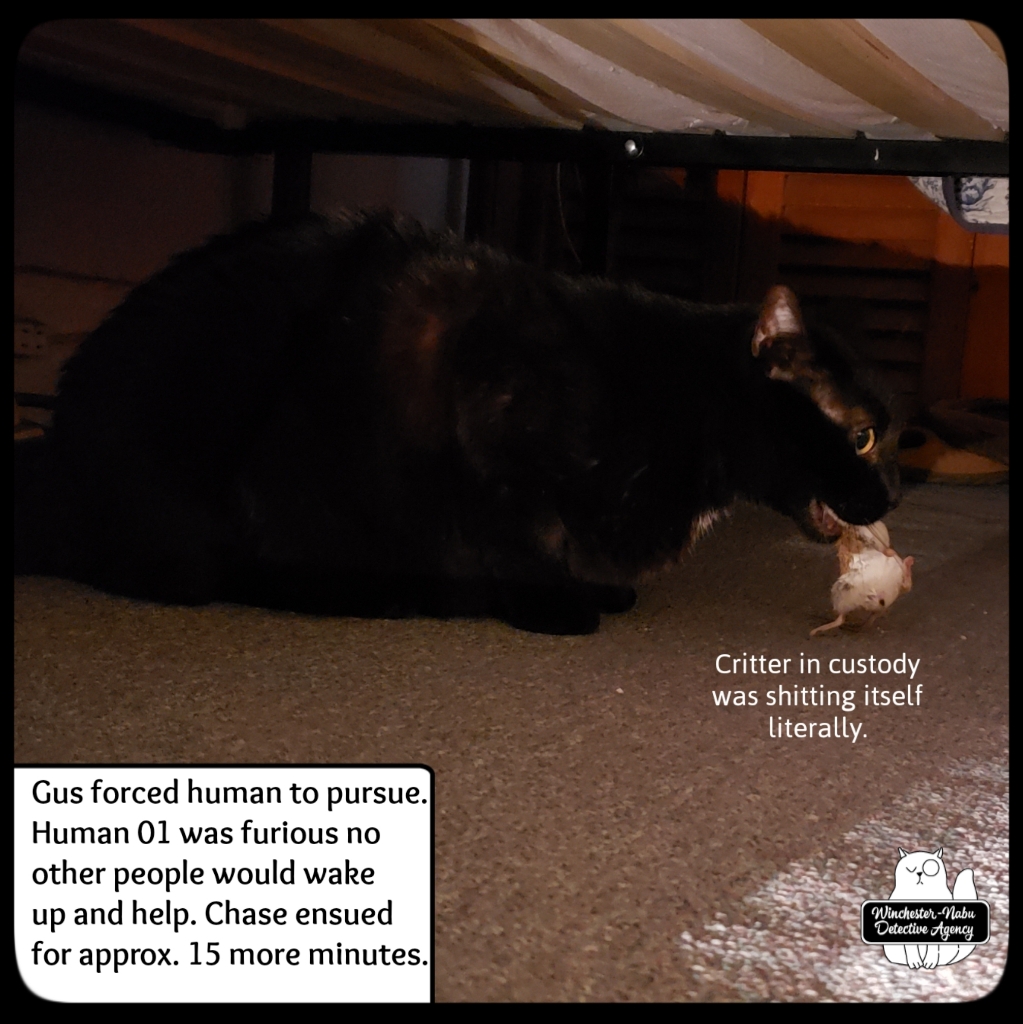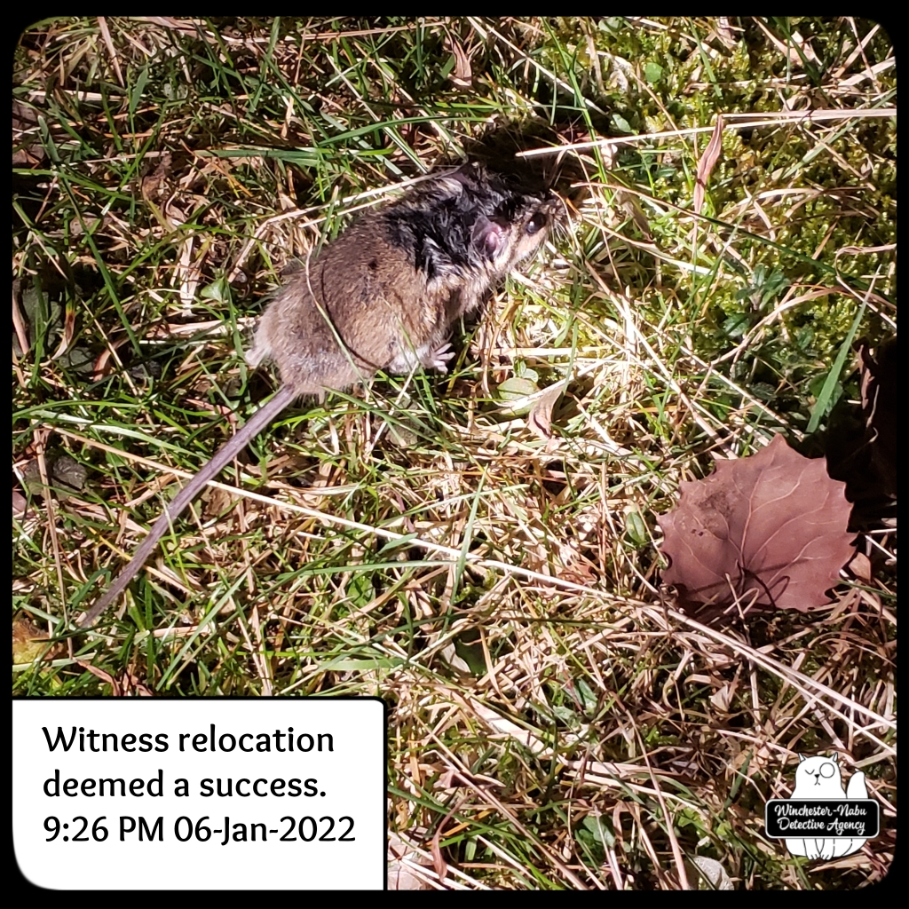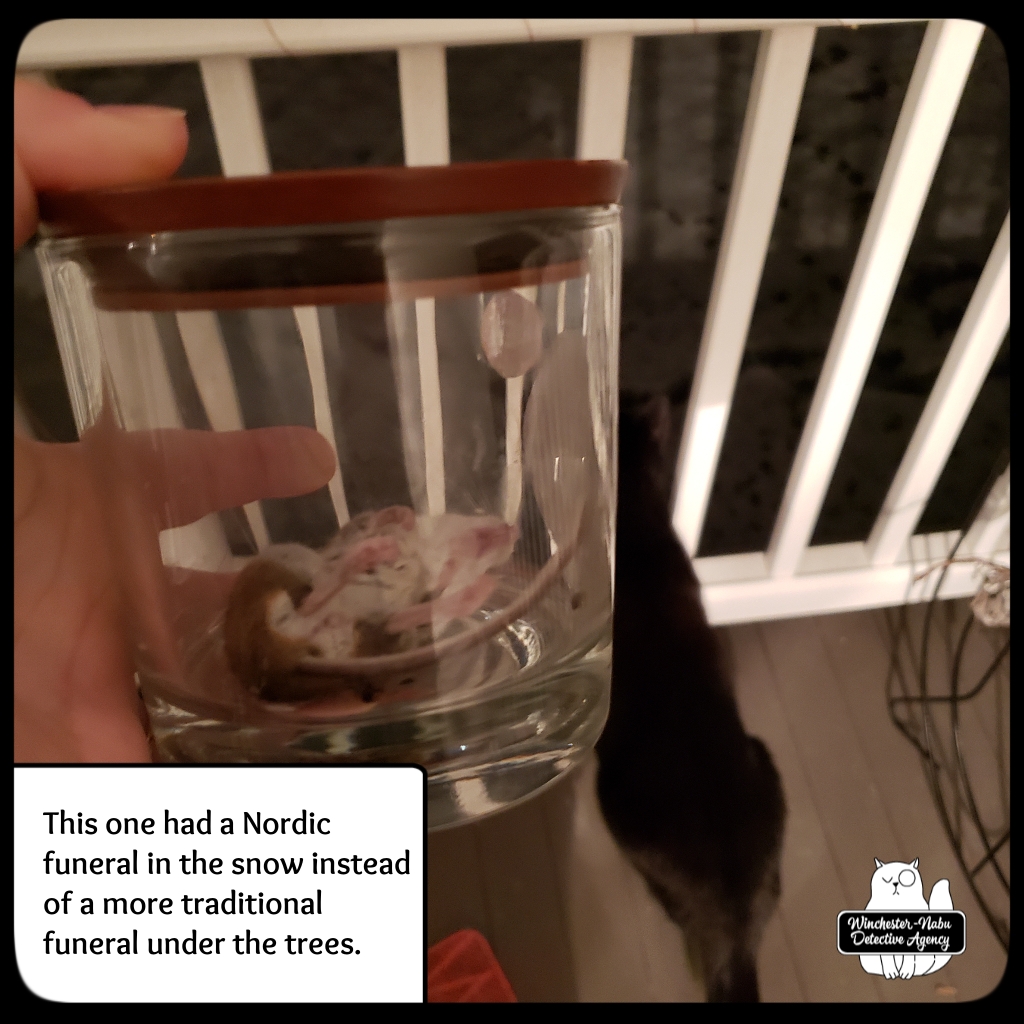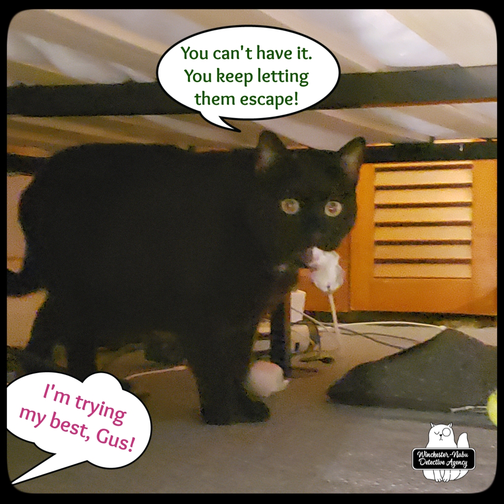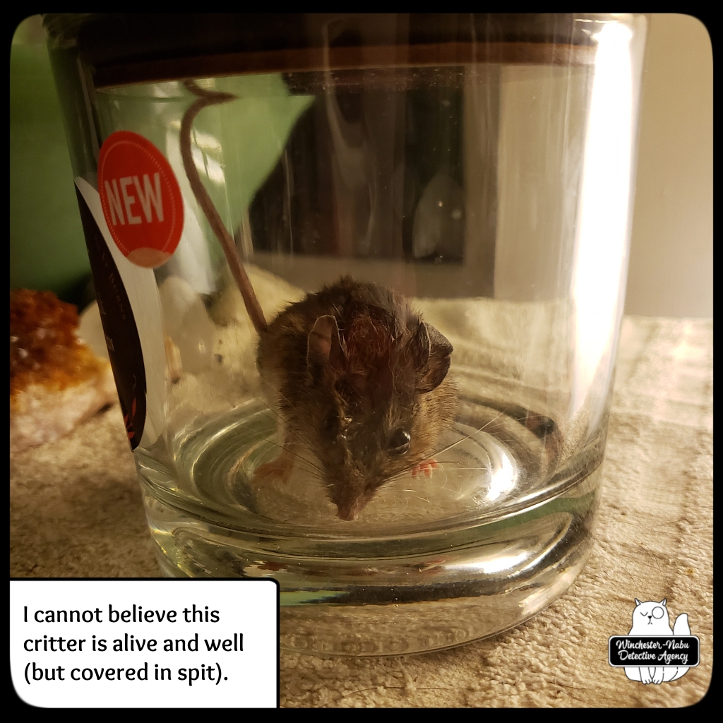 January 9th, The perp he brought to the Winchester-Nabu Detective Agency offices tonight may be the one who escaped twice, but I doubt it. That one had crazy super powers and this one wasn’t all Cross90X or whatever. Gus went through his routine of going under the bed, circling by me, getting under the desk then around to the cat fort. This happens as many times as possible in fifteen minutes. This was one instance where the critter didn’t survive the “ride” in Gus’ majestic fangs. I had to take the body away from him. I put it in the transportation jar and we walked out to the balcony.