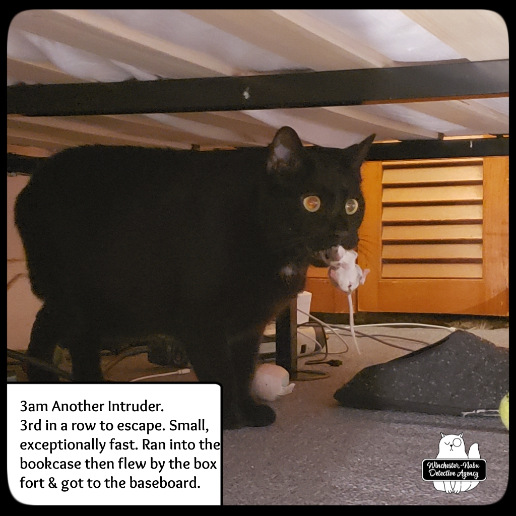 3AM. Another intruder. Another escape. This one even more elaborate. Third in a row to escape. Small, exceptionally fast. Ran into the bookcase then flew over my arm by the box fort and got to the baseboard. Might be the same Speedy Gonzales motherforker. Gus and Ollie did good work. Ollie thinks he deserves more treats than he was given.