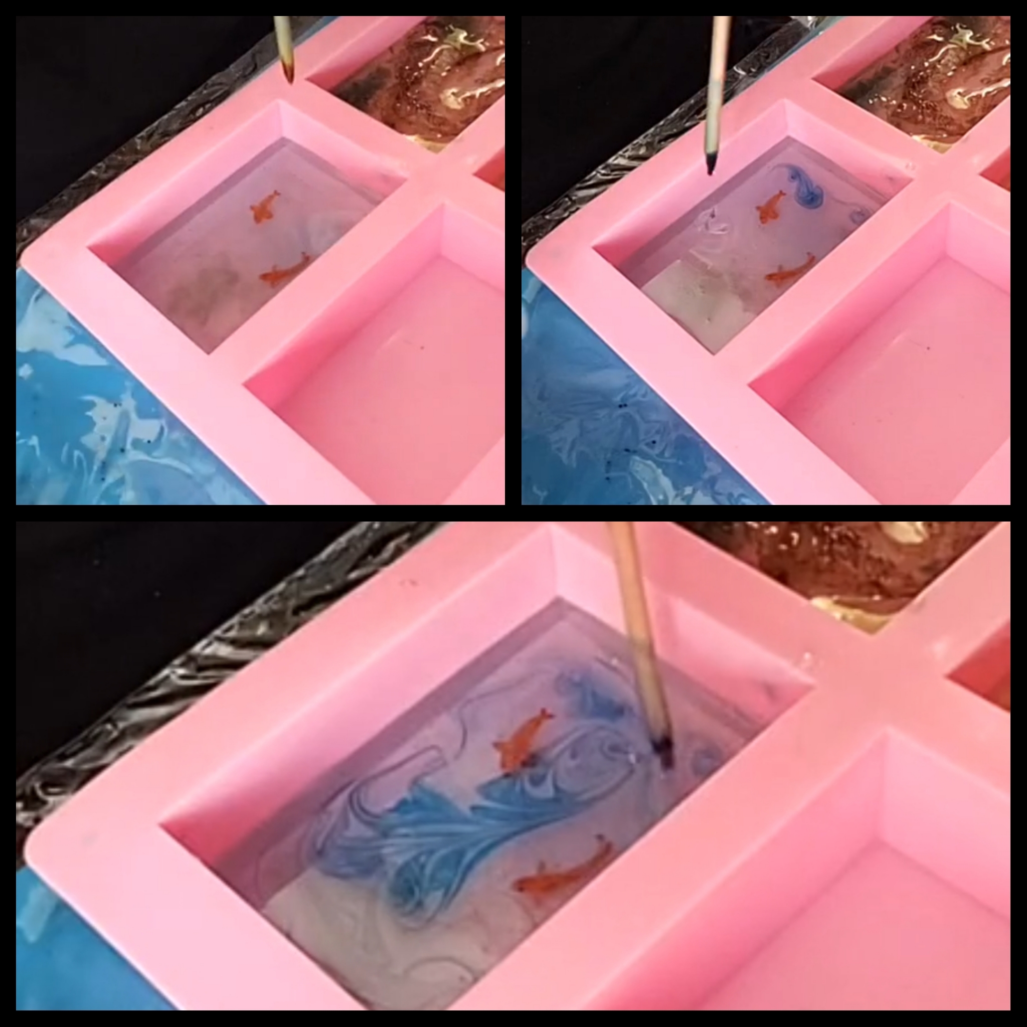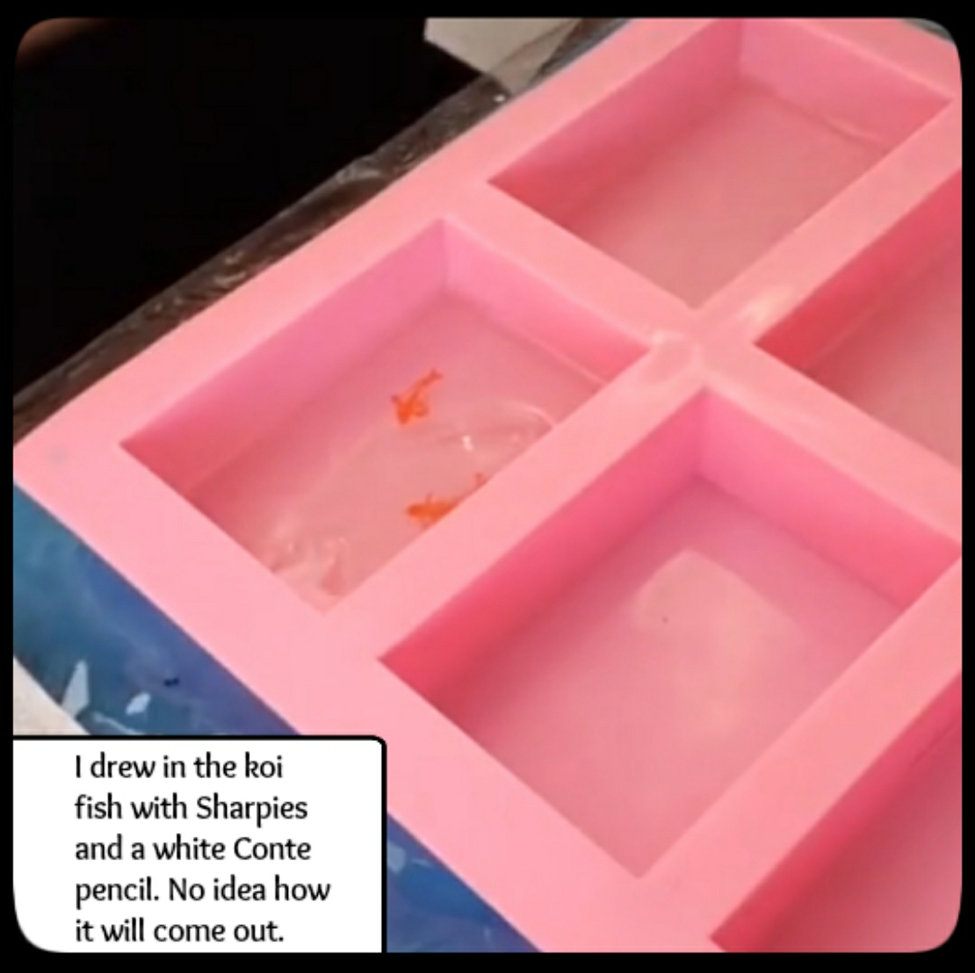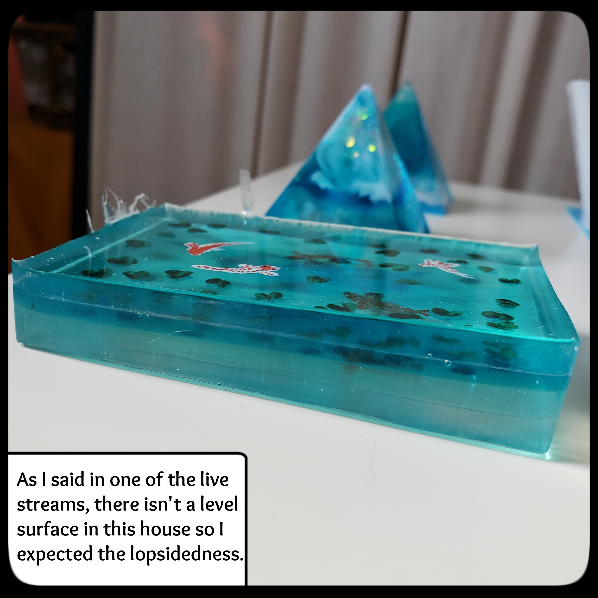 I tried coming up with other ideas besides a goldfish bowl. I watched a good number of tutorials. I looked around to see if there was anything I could cut up to make a rectangular aquarium like you might have in your house or see at a restaurant. I didn’t feel like making my own mold though. I decided to wing it. I was going to use the rectangular soap molds for other specimens. I figured if nothing else, it would be a good experiment or practice to make a water feature using that same mold. It wouldn’t be an aquarium. It could be a koi pond miniature like Oliver and Gus dream of having for real in the backyard.