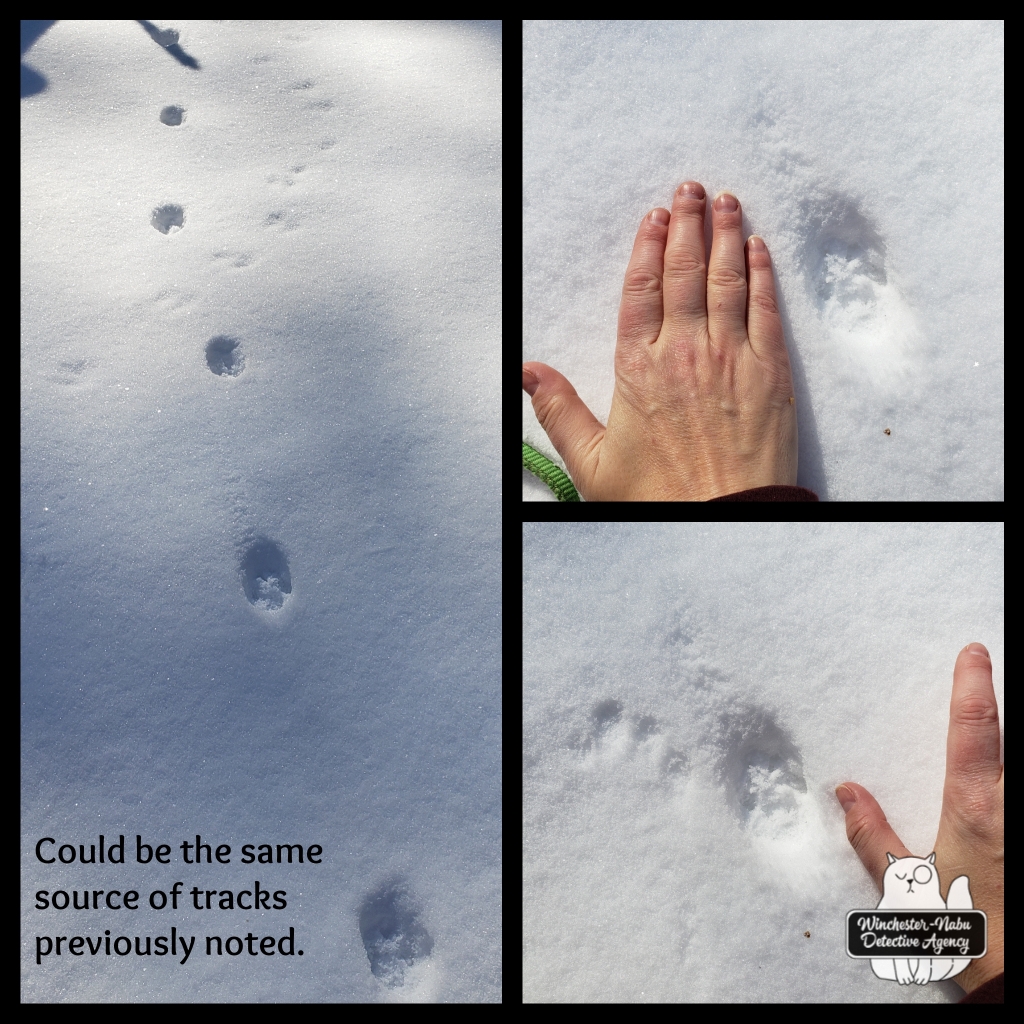 Gus and I had a couple of opportunities to search the perimeter for tracks and other evidence of visitors. We found so many tracks! Remember Mr. Valentine? I think some of them might belong to him or The Stranger. I took several measurements. There were consistent tracks of hooves, squirrels, and birds.