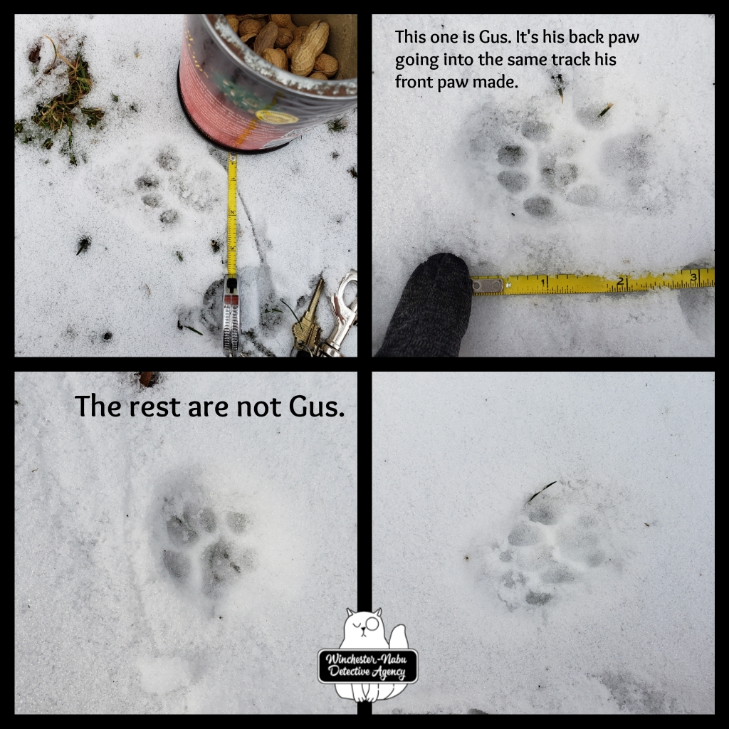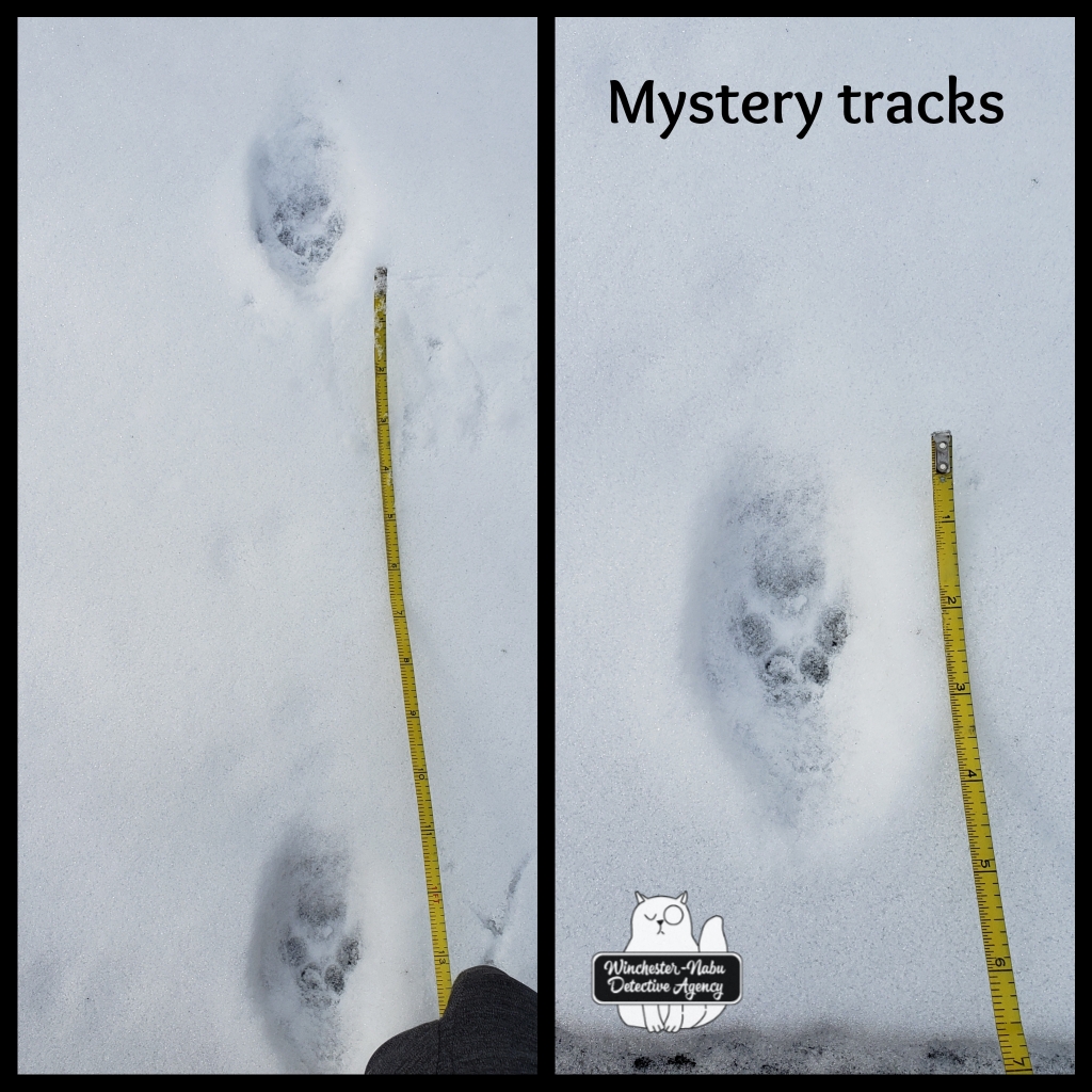 It looks like we were left choosing between a fox and a bobcat or perhaps something else like one of our local cryptids, a pumapard or pancelot. Then again, if someone owns a massive Maine Coon cat, those prints must be huge, right? We haven’t seen any, but that doesn’t mean they aren’t out there. Mr. Valentine looks like a domestic longhair tuxedo.