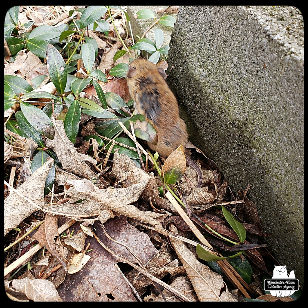 Since this critter was sporting some severe injuries – or perhaps already recovering from injuries if that bare leg was from a previous scuffle – I didn’t feel the need to walk it far away for relocation. I carried the transportation unit to the fairy garden. Again, I expected to dump the mouse out and see the body give in to death’s embrace. It did not! This survivor stumbled yet zipped through the weedy ground to reach the cinder block wall!