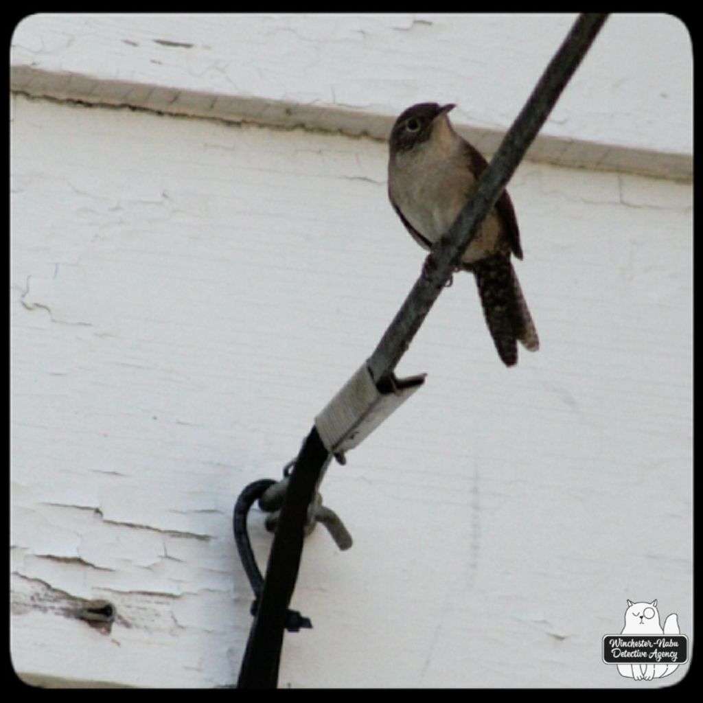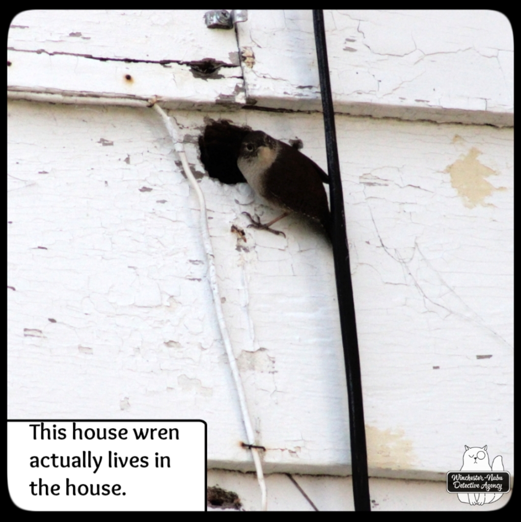 I searched around the area calling him. I sat on the trailer knowing that he often returns to the point where he left. I noticed a couple of house wrens who were fighting over a perfectly made hole in the side of the small house. It gave me something to watch while I waited to see if Gus would return to where I last saw him.