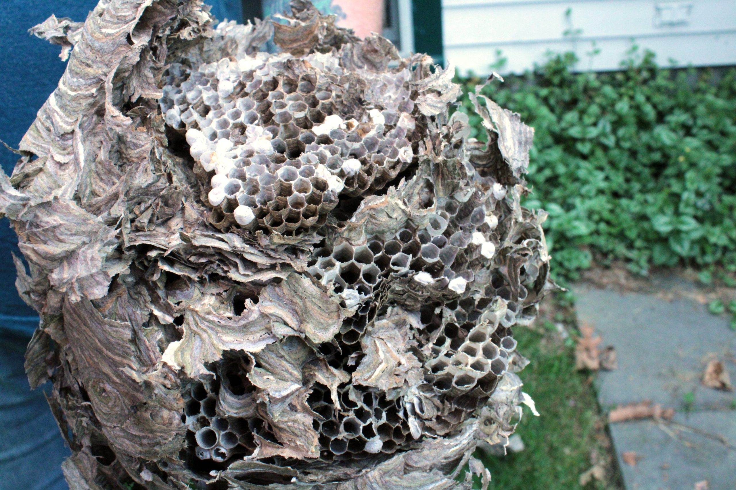 It was beautiful. The layers of the paper they created remind me of the stripes in rock faces millions of years old. The hive looked like it was carefully painted with watercolors in a subdued palette of the earth’s hard shells like a John James Audubon painting of an egret on an eastern shoreline. I don’t know what the heck settings I had my camera on because all those pictures came out with a blue overtone. Despite the hive’s natural beauty, I still didn’t want it on the house. It went into one of the many mulch piles.