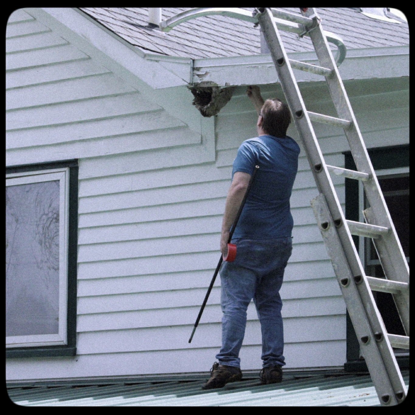 This gigantic hornet nest was over the roof where Gus used to escape during his Batman and parkour practice. The Grumpy Old Man put up a deer net so Gus can’t get to that roof now. Dave looked at the hive and said it was empty because these types of pests don’t reuse their nests year to year. He climbed up to the roof — no special suit — armed with only a long aluminum pole and a paint scraper.