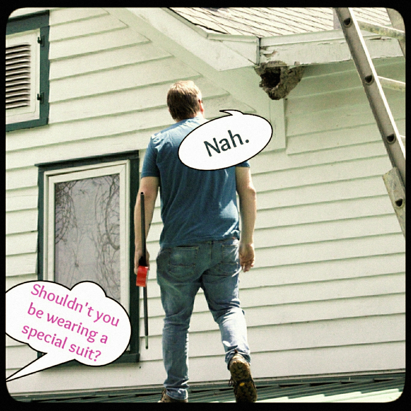 I’m sure there’s a logical reason why the buzzing bastards like to shack up on houses, but I don’t know what it is. What I do know is that people have a belief in painting under the eaves sky blue to trick the bugs into thinking it’s not a surface, but the actual sky. It doesn’t work, but kudos to The Grumpy Old Man for trying it one year.