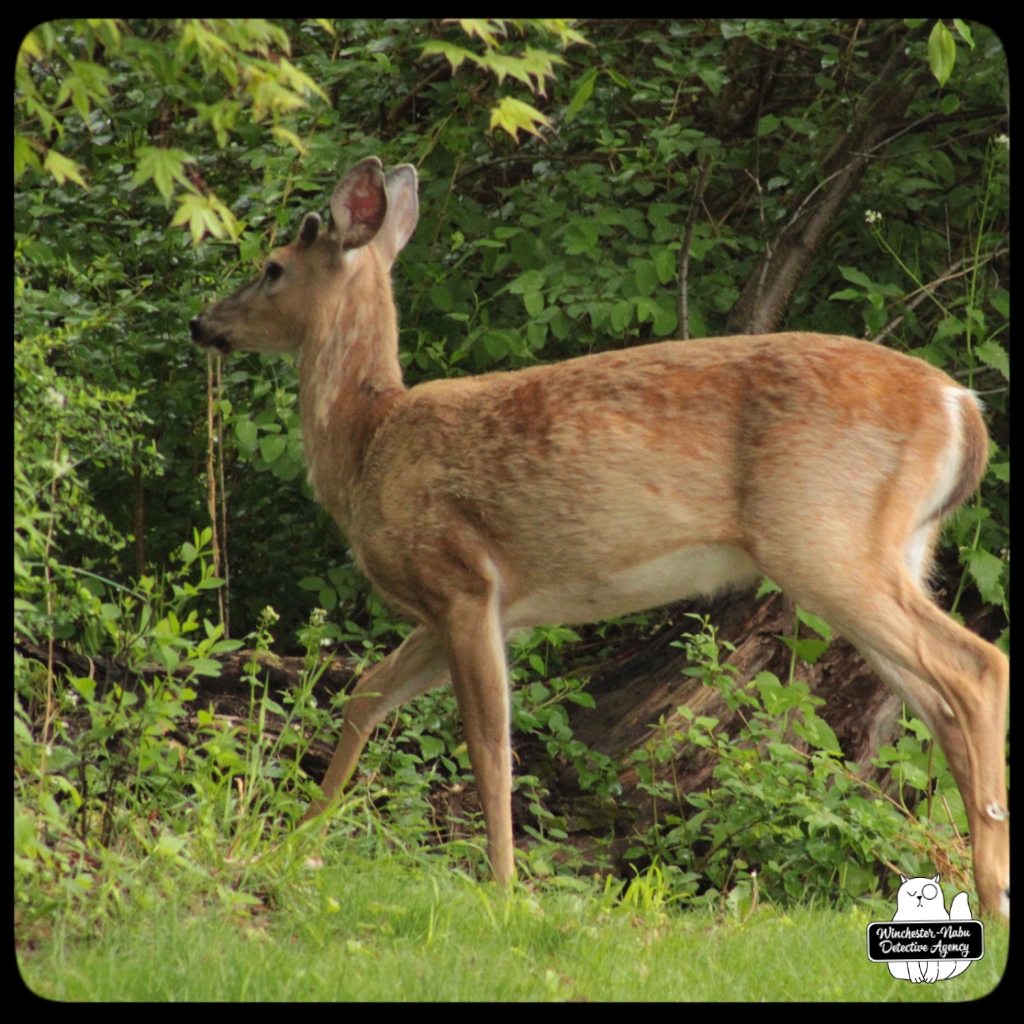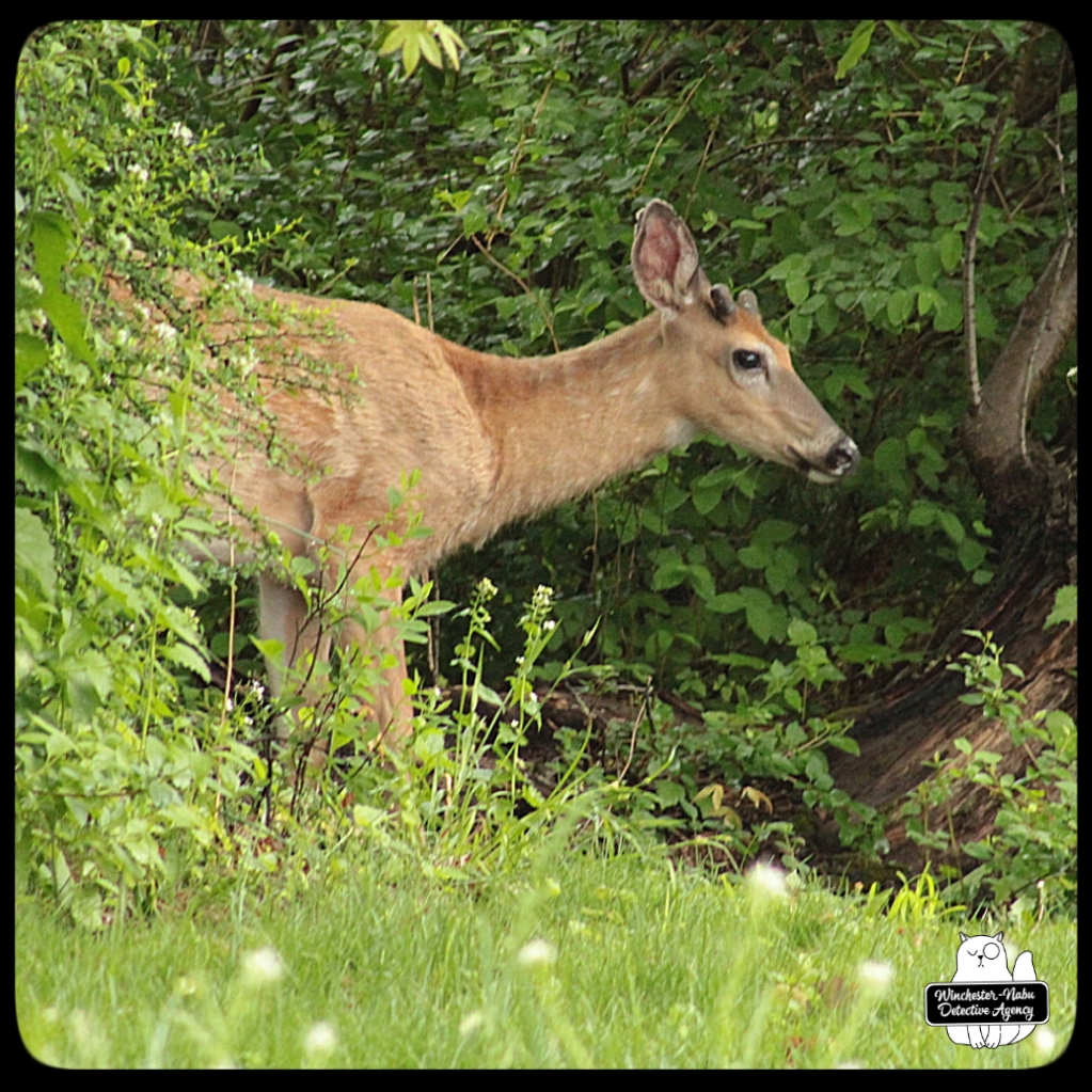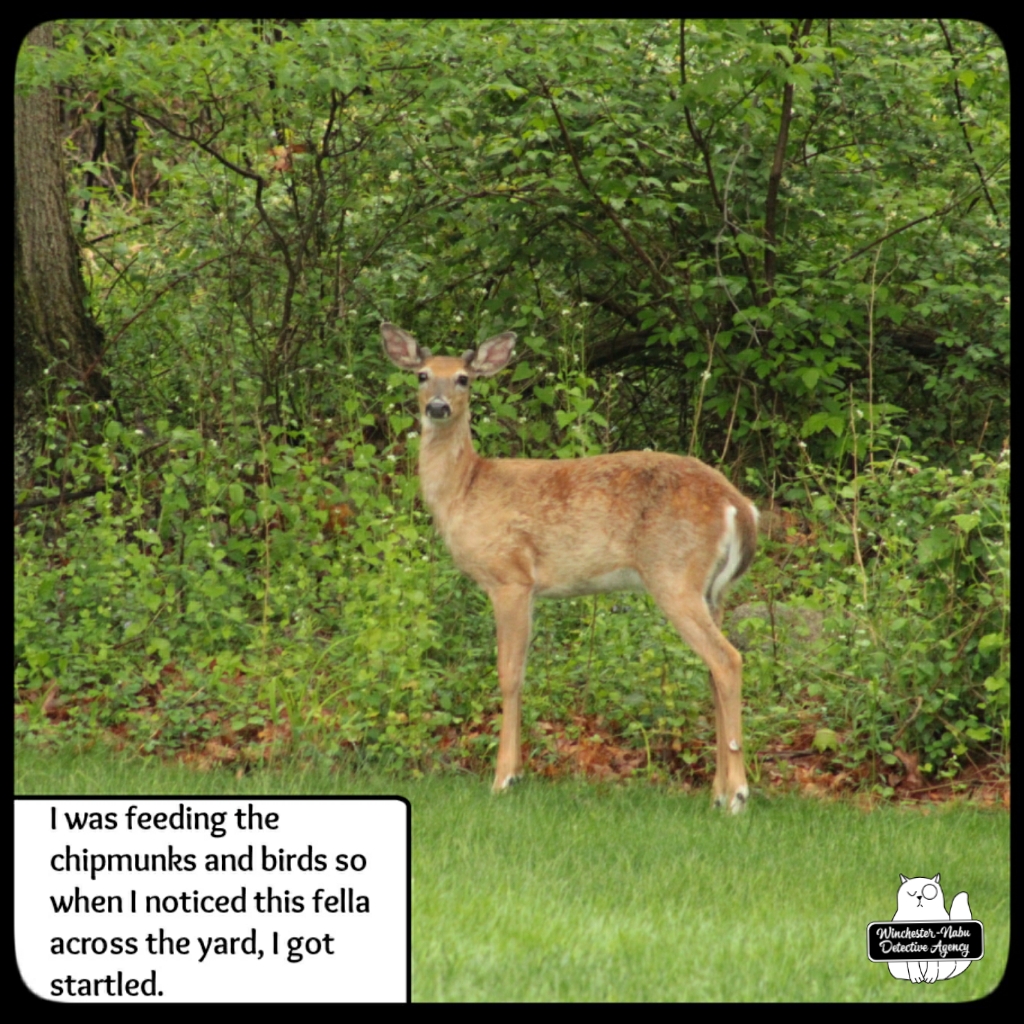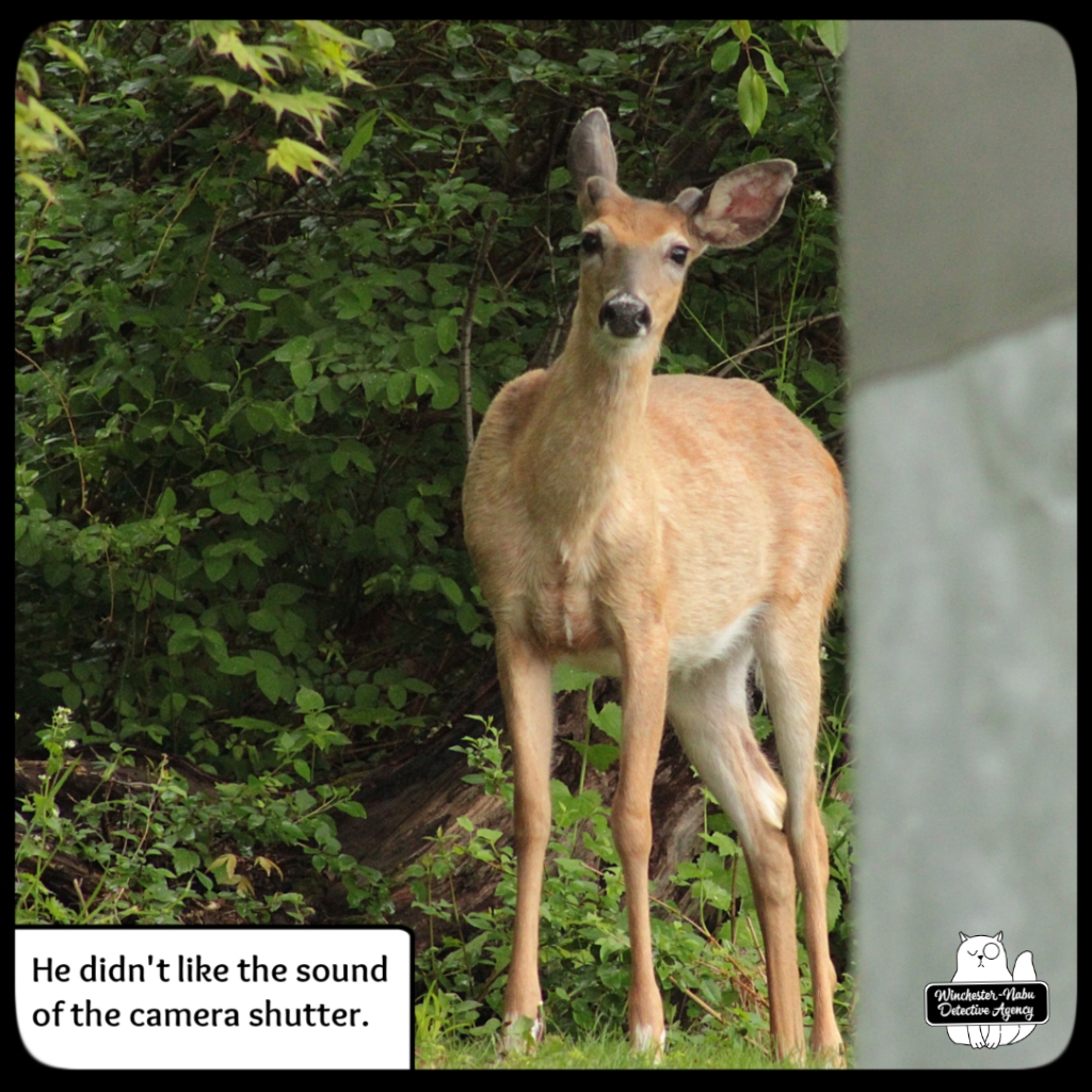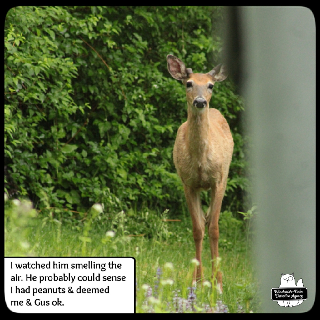 There were several times when I had no idea that a deer was nearby. Gus has his usual places to explore, hunting, and check all the scents around for strangers. One area is at the western edge of the property which borders woods. The private road does go up through, but since no one is using it, that’s been quiet. I tend to be focused on the birds and chipmunks since they want their peanuts. I’ll have my head down for small critters or looking up at the trees and then when I take a step, I end up scaring a deer. They usually run away, but a couple times, we ended up spending some time together.