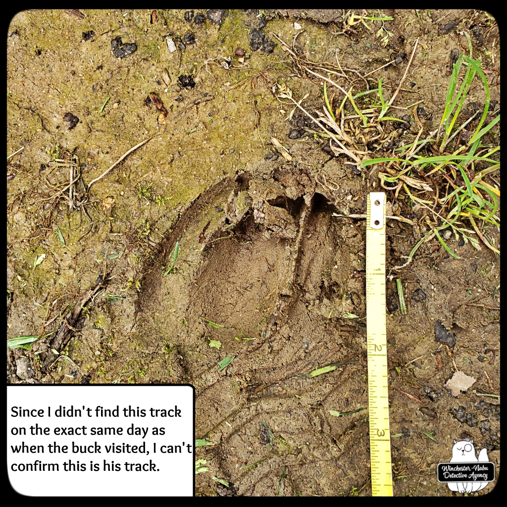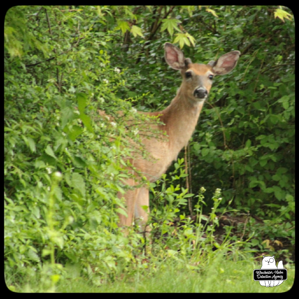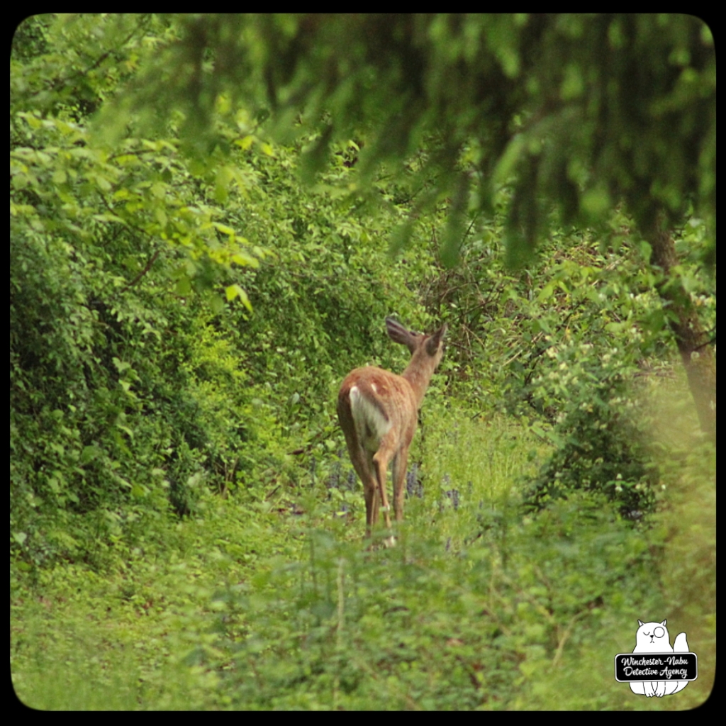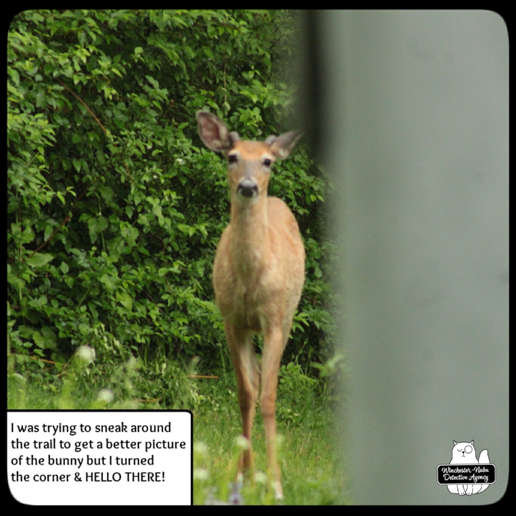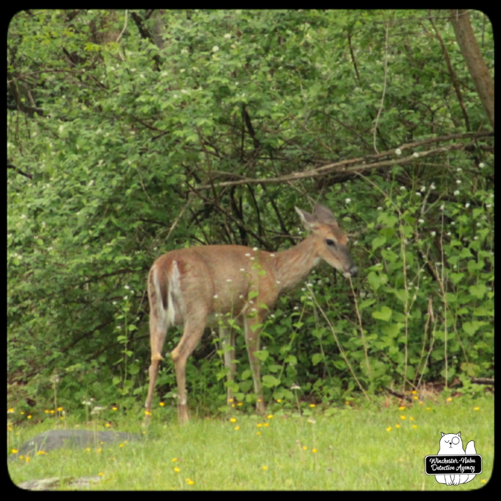 There were several times when I had no idea that a deer was nearby. Gus has his usual places to explore, hunting, and check all the scents around for strangers. One area is at the western edge of the property which borders woods. The private road does go up through, but since no one is using it, that’s been quiet. I tend to be focused on the birds and chipmunks since they want their peanuts. I’ll have my head down for small critters or looking up at the trees and then when I take a step, I end up scaring a deer. They usually run away, but a couple times, we ended up spending some time together.