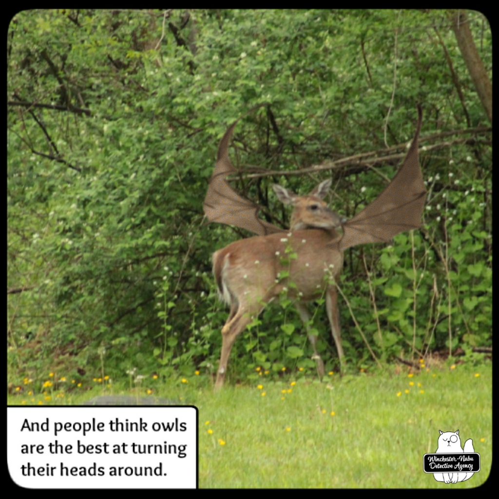 As Gus and I watched a couple of button buck devil-deer over the course of a week, we saw something extraordinary! They had wings. Awesome! We don’t see those often. But, they could also camouflage their wings!