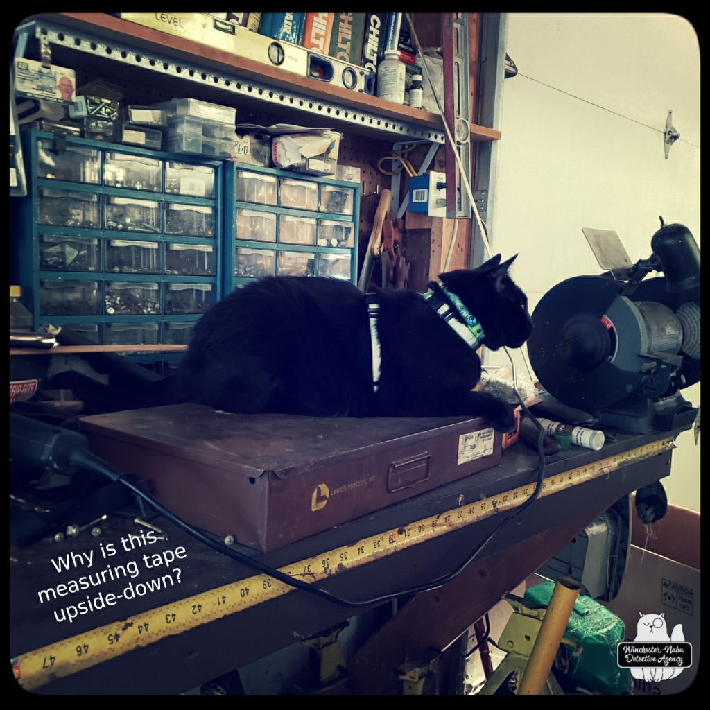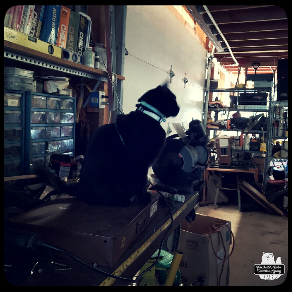 On yet another hot summer day in July, Gus and I clearly heard clawing around the work bench. Believe it or not, the situation got creepier when we saw two rulers next to a tower of ammo boxes wiggle! Gus wanted to get up to that shelf immediately. Guys, there’s so much stuff. Everywhere. I couldn’t reach the stacks of hardware, bullets, various welding masks, and books. I wheeled over one of the chairs.