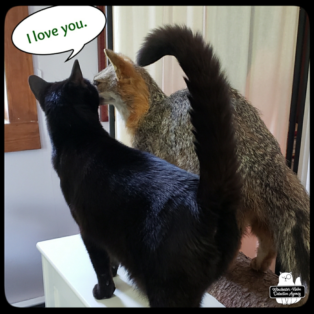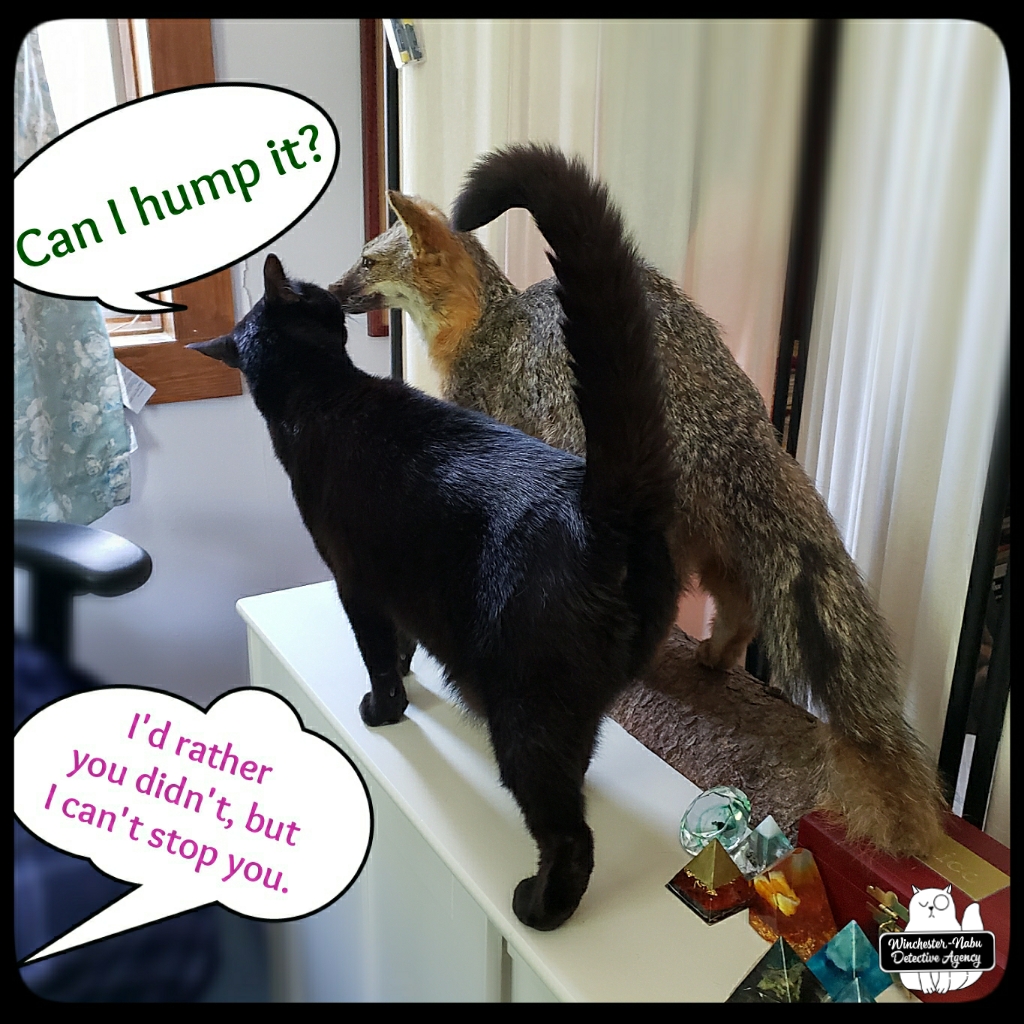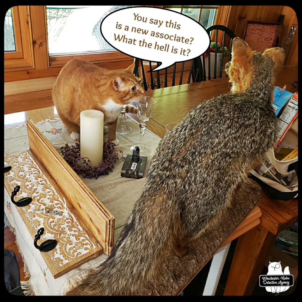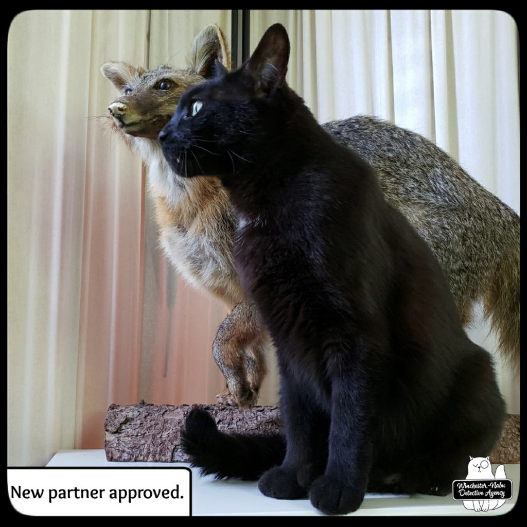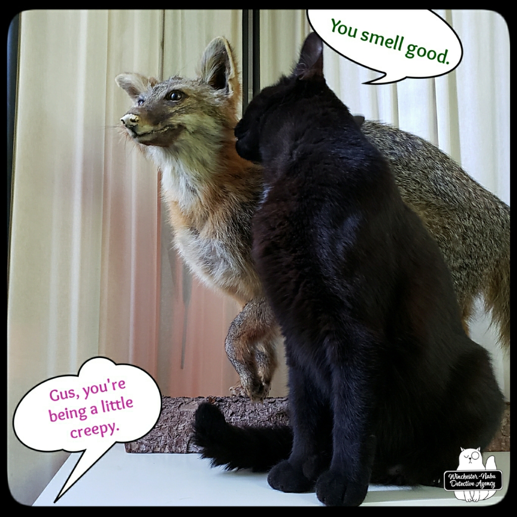 We had to see how Ollie and Gus would react to their new investigative partner at the Winchester-Nabu Detective Agency. Oliver is cautious and believes the new associate should be on a probationary period. BUT GUS LOVES IT! Gus loves butts and this new friend didn’t have any objections to butt smelling.