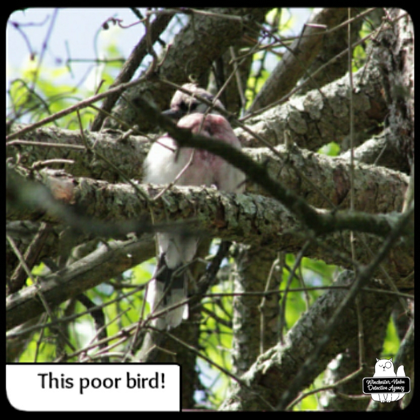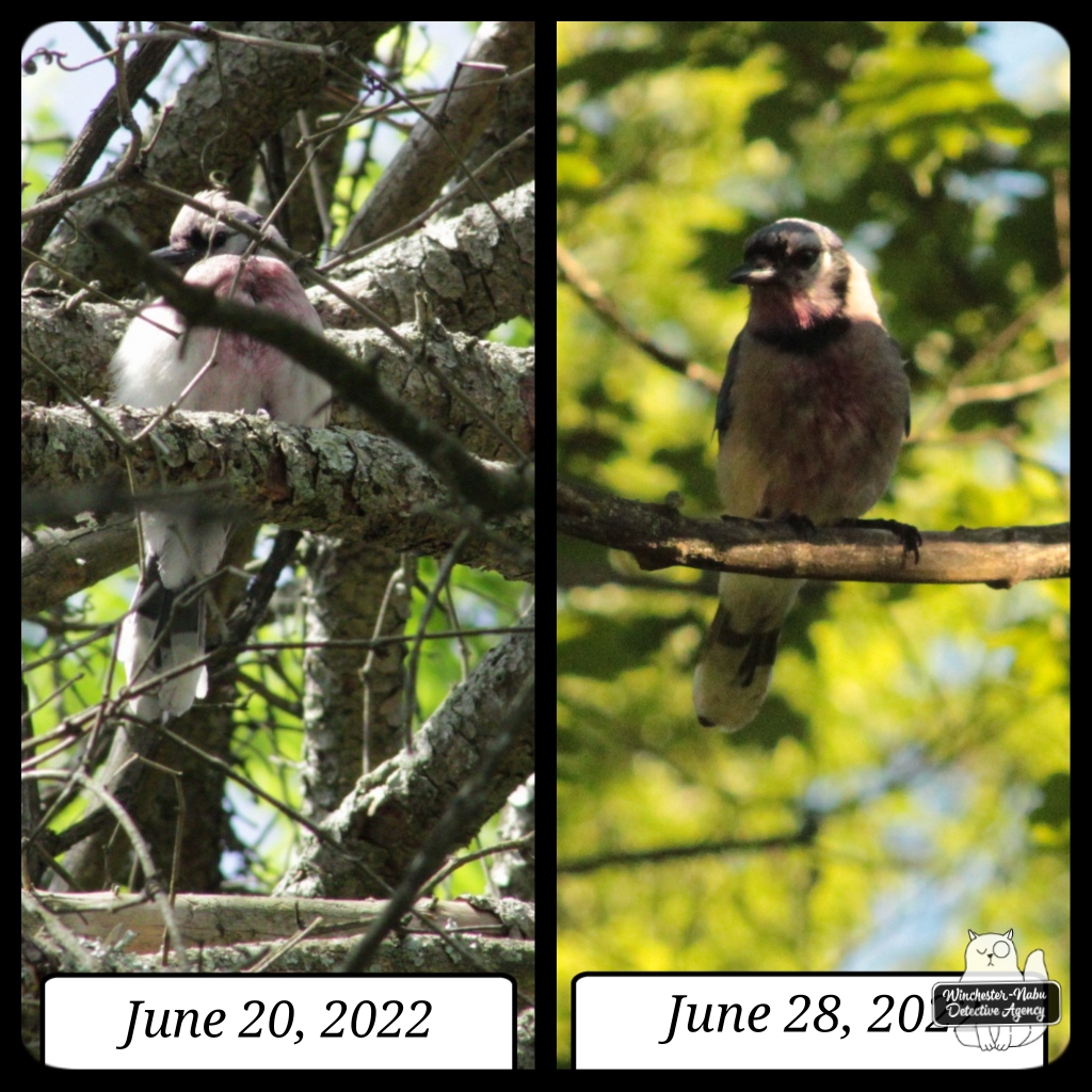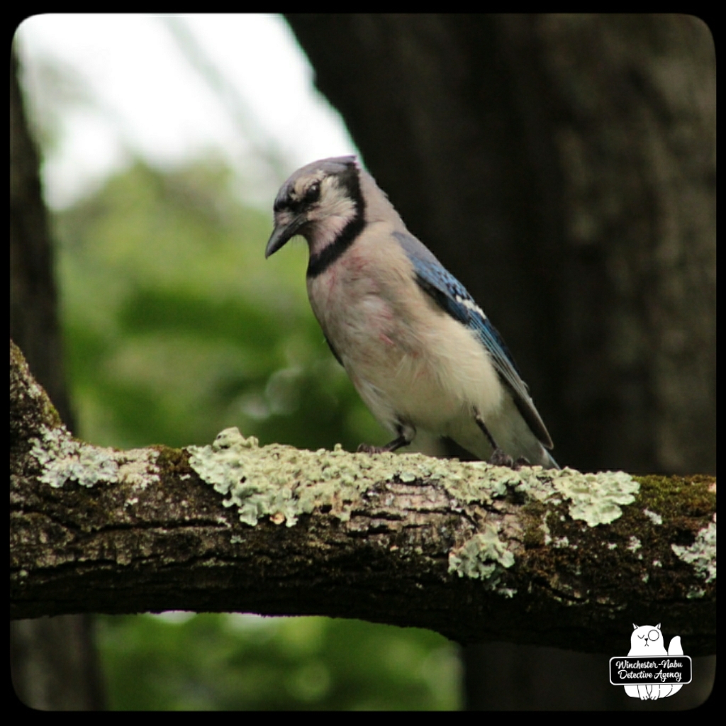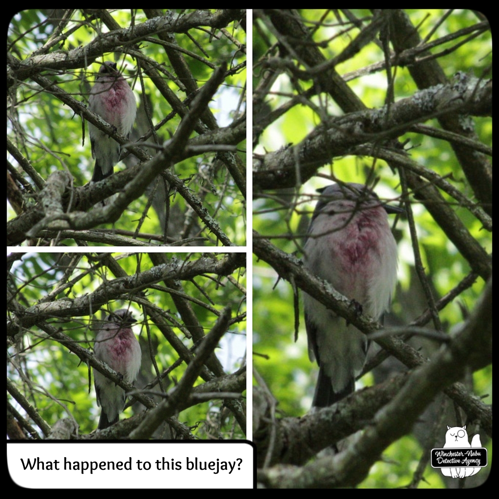 I was stricken when I saw one of our blue jays was covered in a red stain. This lasted for several weeks. The red stain was impossible to miss. I wanted to believe it was caused by something like berries. The reason I had doubts about that was because of a suspicious indent in the bird’s breast.