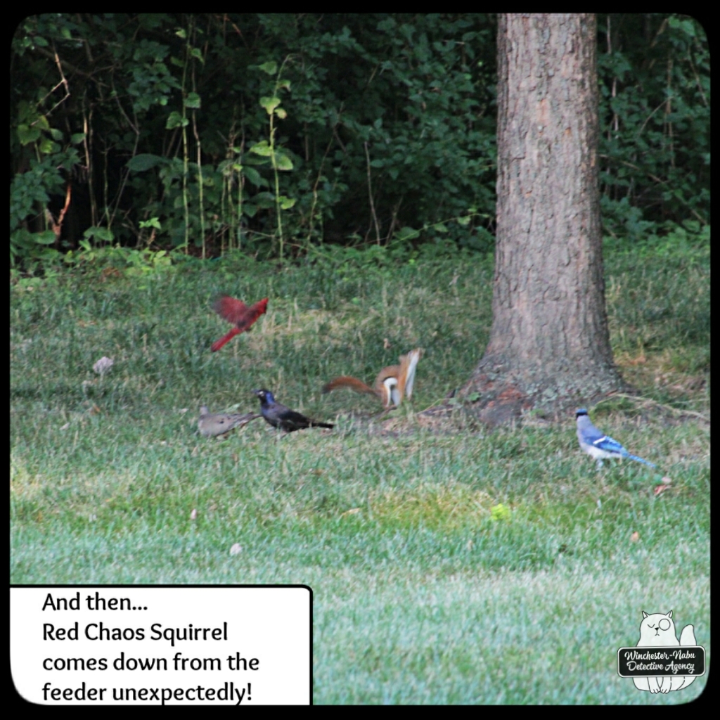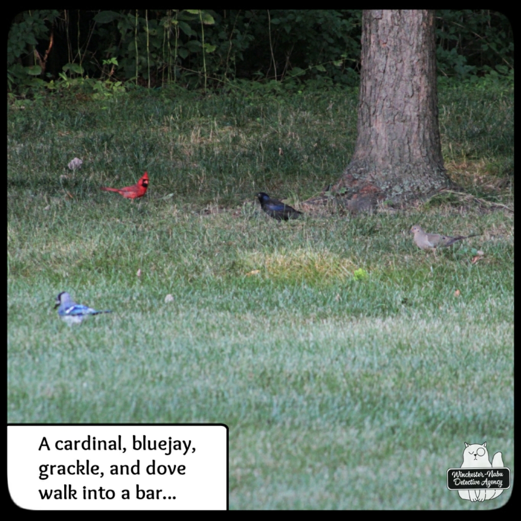 The victim was able to fly and perch. He seemed to be “taking it easy” as far as a bird that needs to eat and drink can. None of the others were going to nurse it. There’s some kind of baseball saying that claims the great ones play hurt. In my opinion, they’re not the smart ones. Bodies need to heal. We kept tabs on this fellow to make sure it was coming back to the yard and eating well.