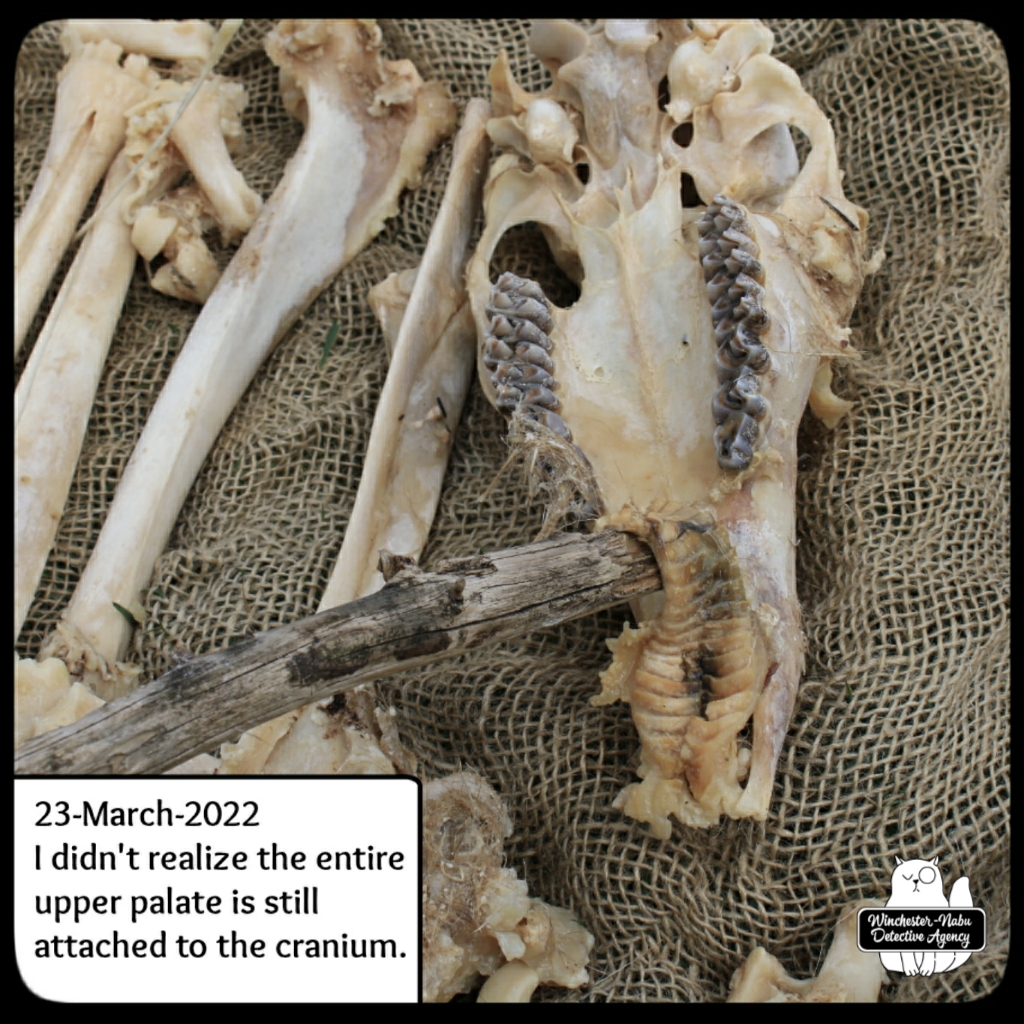 This case file may be the last set of bones we find. I’m not interested in transporting roadkill back to our yard. That’s messy and disgusting and I don’t have the vehicle for it. Moving bodies dripping blood in a wheelbarrow is probably where I can draw the line at bone collecting.