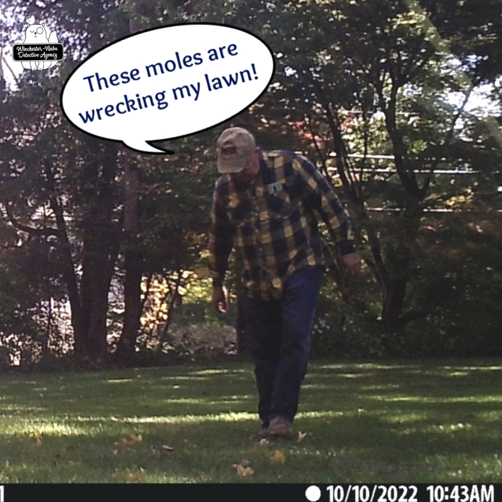 This fall, he invested in devices I feel would be used as some kind of military POW torture. They’re solar-powered – okay, good. You stick them in the ground – okay, easy installation but will you mow over them? And they make a grating alarm sound every 49 seconds! Audible to everyone! Not just to the voles, moles, and mice. There are six devices incessantly blaring outside so my patrols with Gus are now quite unpleasant unless we get far enough away.
