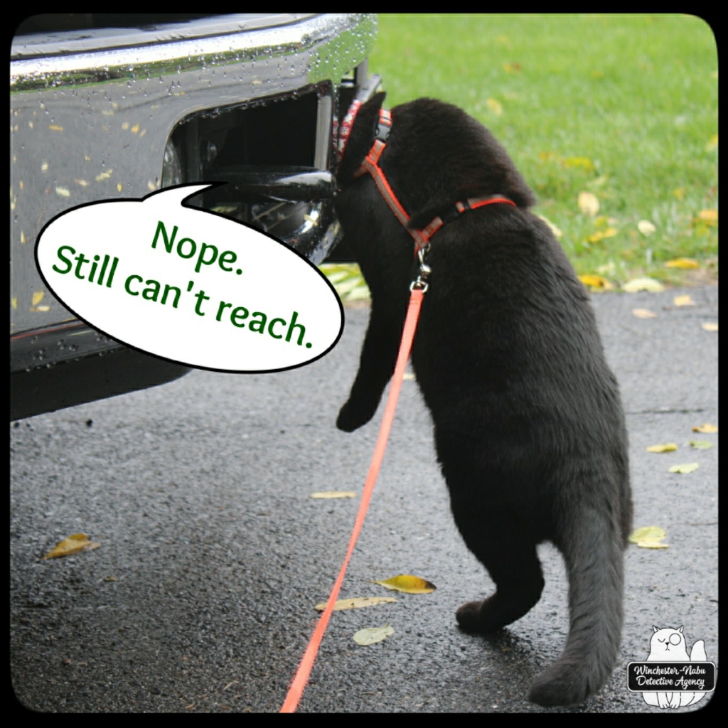 The tiny panther made a sharp pivot to leave Pietro’s chipmunk hole in the ground. Did he see something? I thought I saw a blur dart across the pavement too. I couldn’t tell what it was, the size of it, or even if I actually saw something. Gus was the only way to confirm that something had indeed zipped by and headed for the truck. Gus was not about to allow something to invade his favorite truck! No, sir! He doesn’t care that things have crawled into my own car and died. Thanks, Guster.