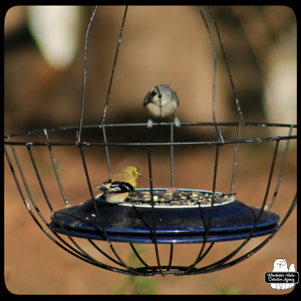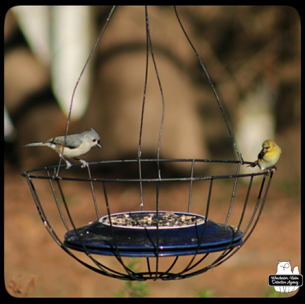 Gus and I will distribute peanuts and bird seeds in other places plus there’s an actual bird feeder in the front. It’s a short flight for the birds to hit up all these locations. The tufted titmice are among these happily fed birds. I love them and find them absolutely adorable despite them having one of the worst singing voices of the songbirds (the catbirds aren’t very pleasant to the ears either).