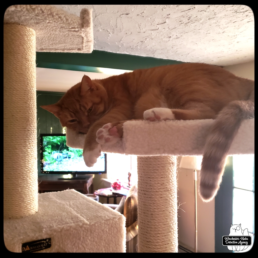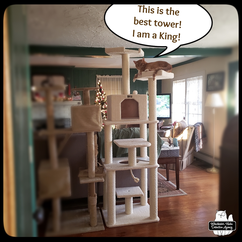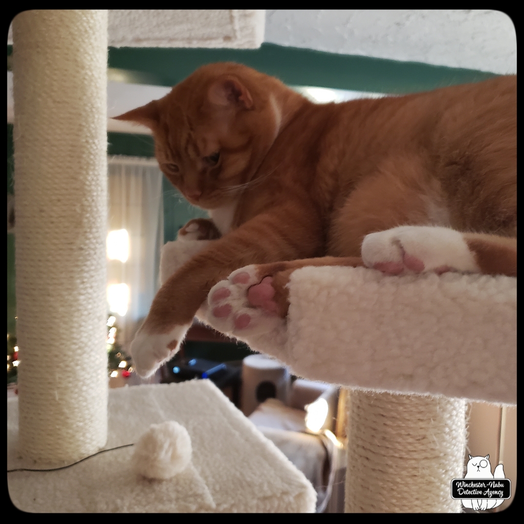 Since Ollie’s outdoor patrols don’t often happen in the winter, he has enjoyed watching critters through the windows. Sometimes Gus has to accept that’s all he’s going to do too. They will also visit the balcony for short stints which gives them the opportunity to watch small birds flutter from the hedges to the feeding stations. One of the best locations for watching the outdoors from safe inside is Oliver’s suite which he shares with the elder humans.