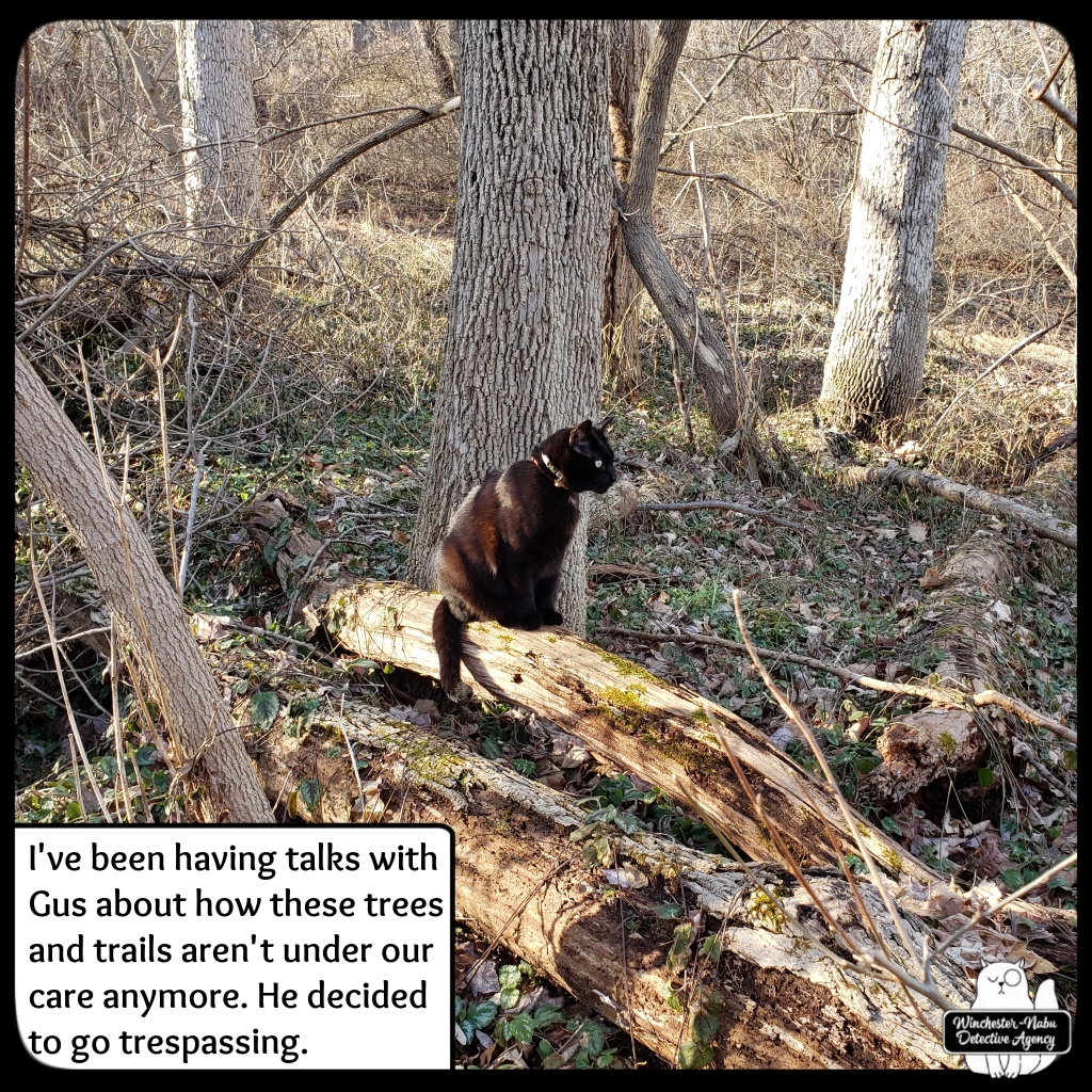 The “Gus Superhighway of Trees” is in a part of the woods right next to Fort Winchester. It’s not near the neighbors’ house. I don’t know if they intend to put up trail cameras, but for now, I’m still going over there to climb trees with Gus. I noticed a few of the birds following us and watching me since I had the can of birdseed. Even if it’s empty, they keep watching me to see if I’ll set up another snack bar for them.