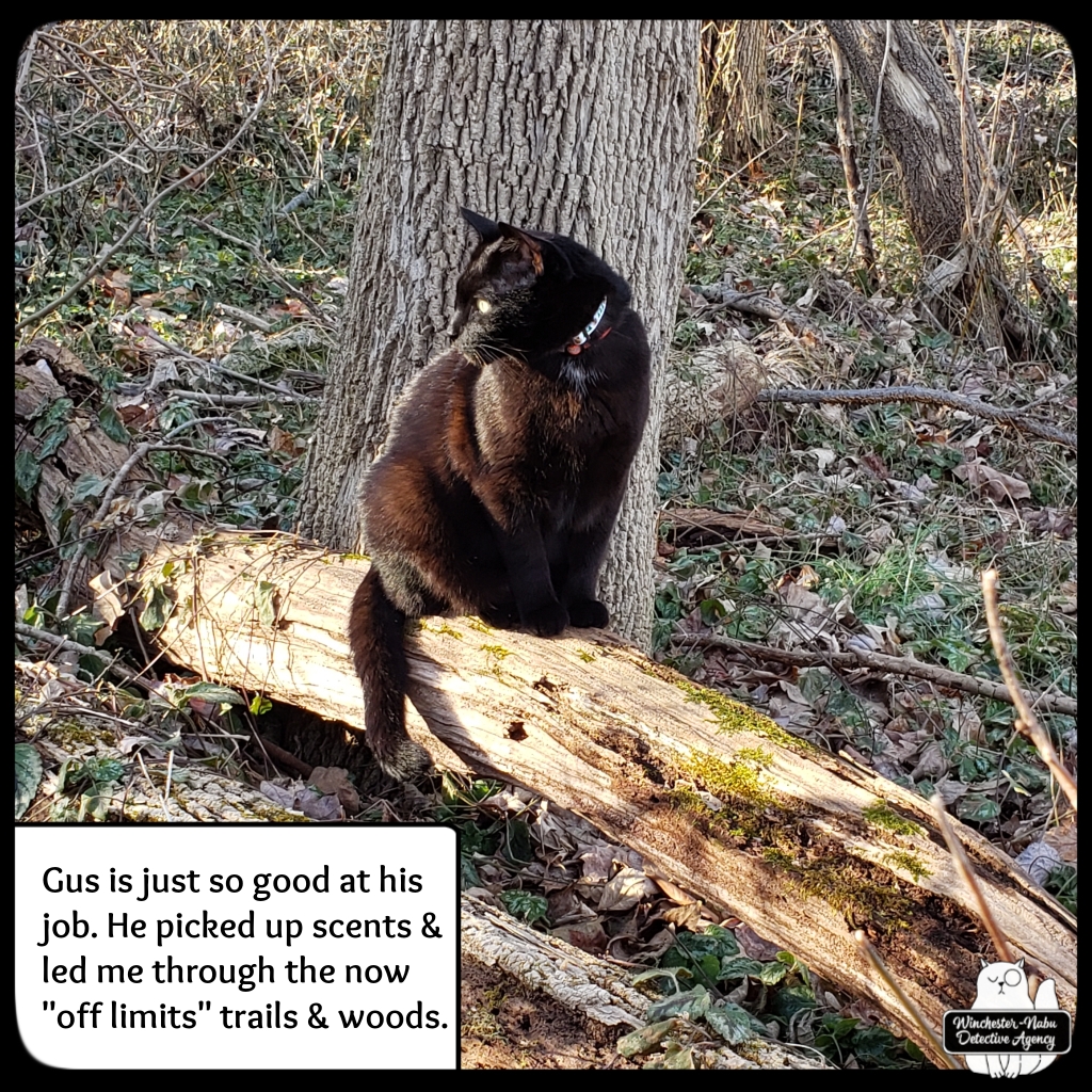 Gus doesn’t pay attention to the birds here which is an interesting note. He’s all about the underground critters and the bigger creatures who leave scent trails. If he’s not hunting, he’s tracking and gathering intel. We know the volepyres are still active under their precious soil and blanket of leaves. Even I can hear them with my limited sense of hearing compared to Gus.