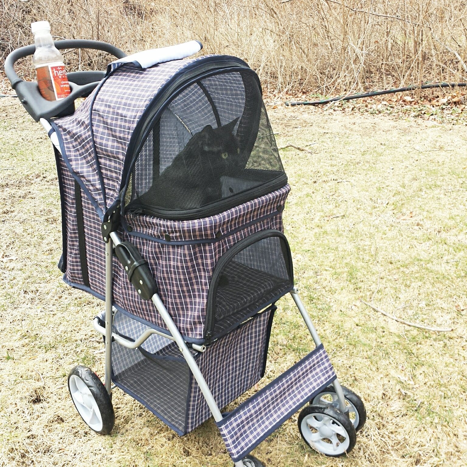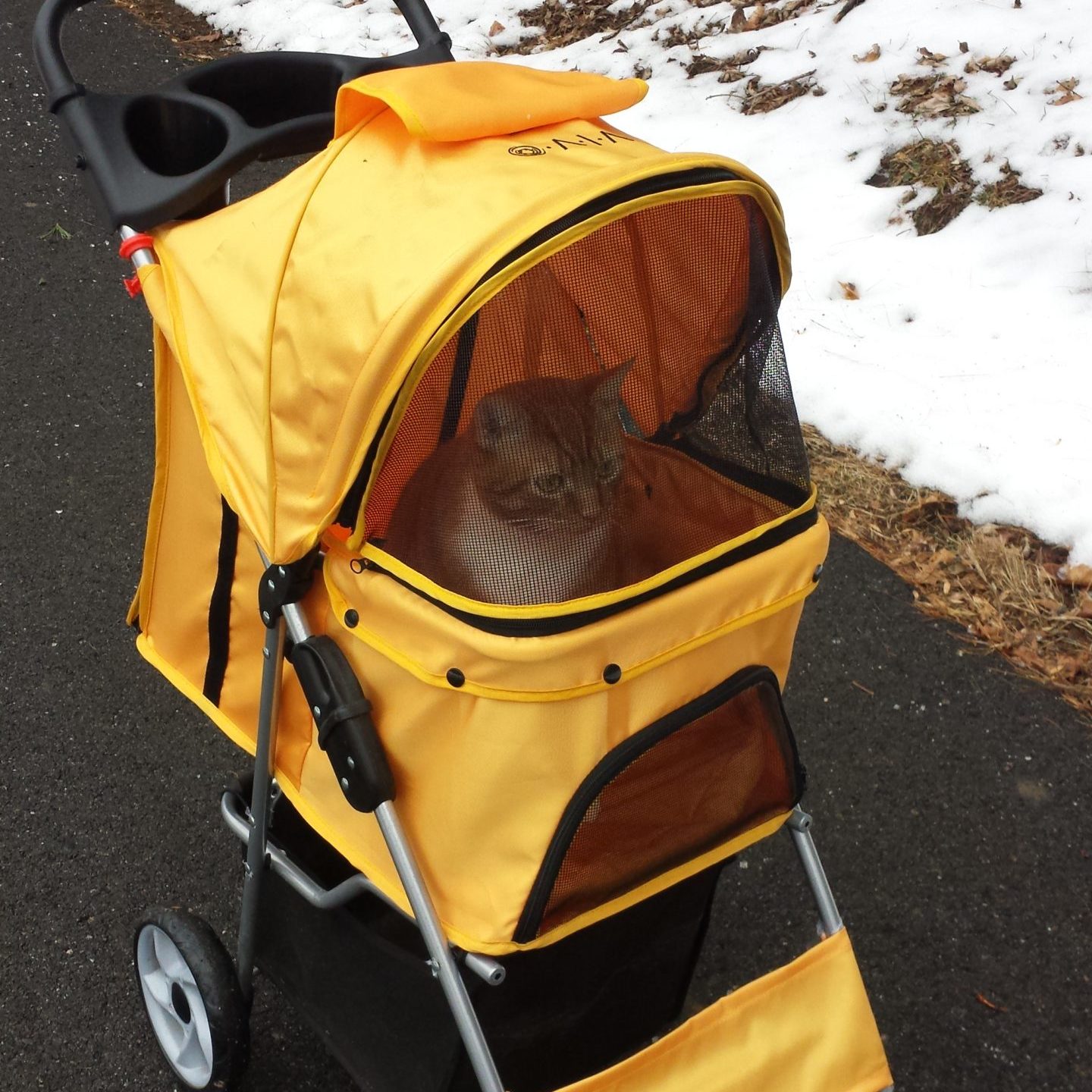 - Once the cat realizes the stroller is a supercool place where they can see the outside world and still get treats, try small trips. I walked Gus back and forth over and over across a porch. I also did this when I was injured and needed to do required walking for physical therapy. Having the stroller helped and served to get Gus comfortable.