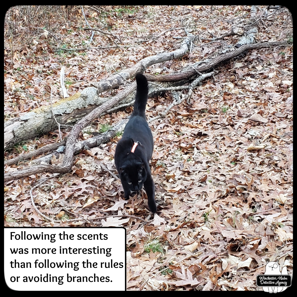 The winds had knocked down more twigs and branches. I swear, everyday there are more branches on the ground to clean up. I followed Gus to the corner entrance of the woods. I studied the ground for tracks until I caught up to Gus where the ground changed from the grassy yard to the dead leaves carpeting the woods. I reminded Gus that we were no longer the caretakers of the trails and officially trespassing. His SuperSmeller didn’t recognize the block and lot border that the municipality delineated. Gus simply doesn’t care about such things.