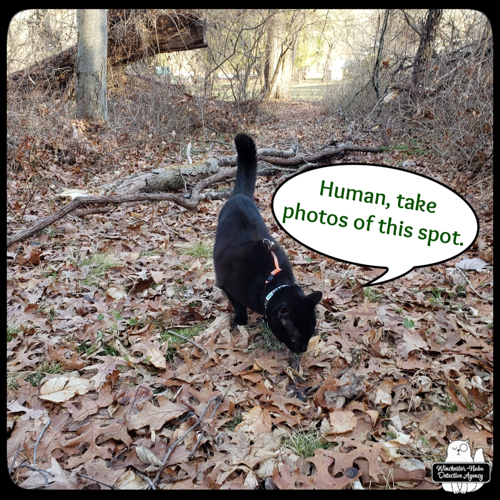 I saw the suspicious wet marks on the dead leaves. Gus was right. I needed to get photos. I squatted down and used my phone to take the pictures. It looked like blood. Gus had already moved on and found something else. I was caught up in my own visual observations of the apparent blood puddle, but eventually he pulled my attention away to see what new thing he discovered. There was a log of mystery poop.