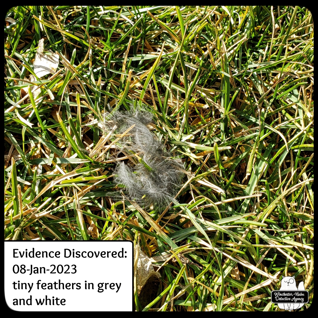 Gus and I were outside distributing bird seed to our designated snacking spots for the critters. While Gus carefully checked around the sundial and Cheeks Moretti’s rock fortress, I stood nearby in the grass. I looked down and saw fluffy feathers.