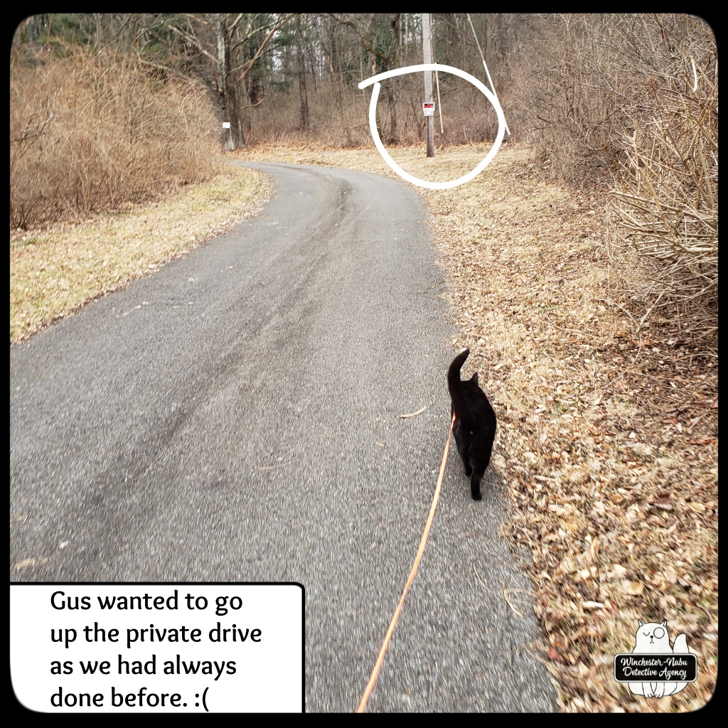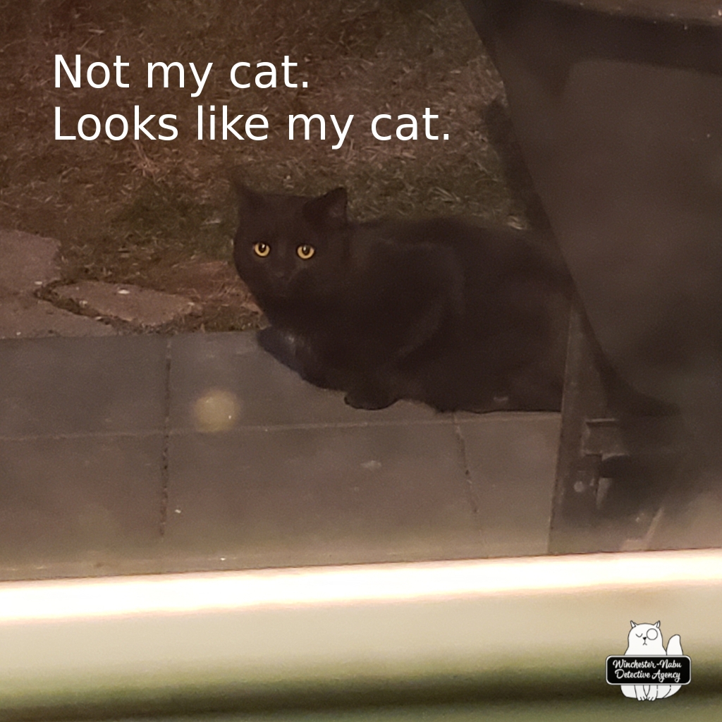 Back in Case File No. 35-295, I introduced the folklore of doppelgängers and lookalikes. We determined Gus didn’t have an actual doppelgänger; but there is a stray who looks an awful lot like him lurking right here! The second week of February 2023, I finally got a couple of photos of this lookalike.