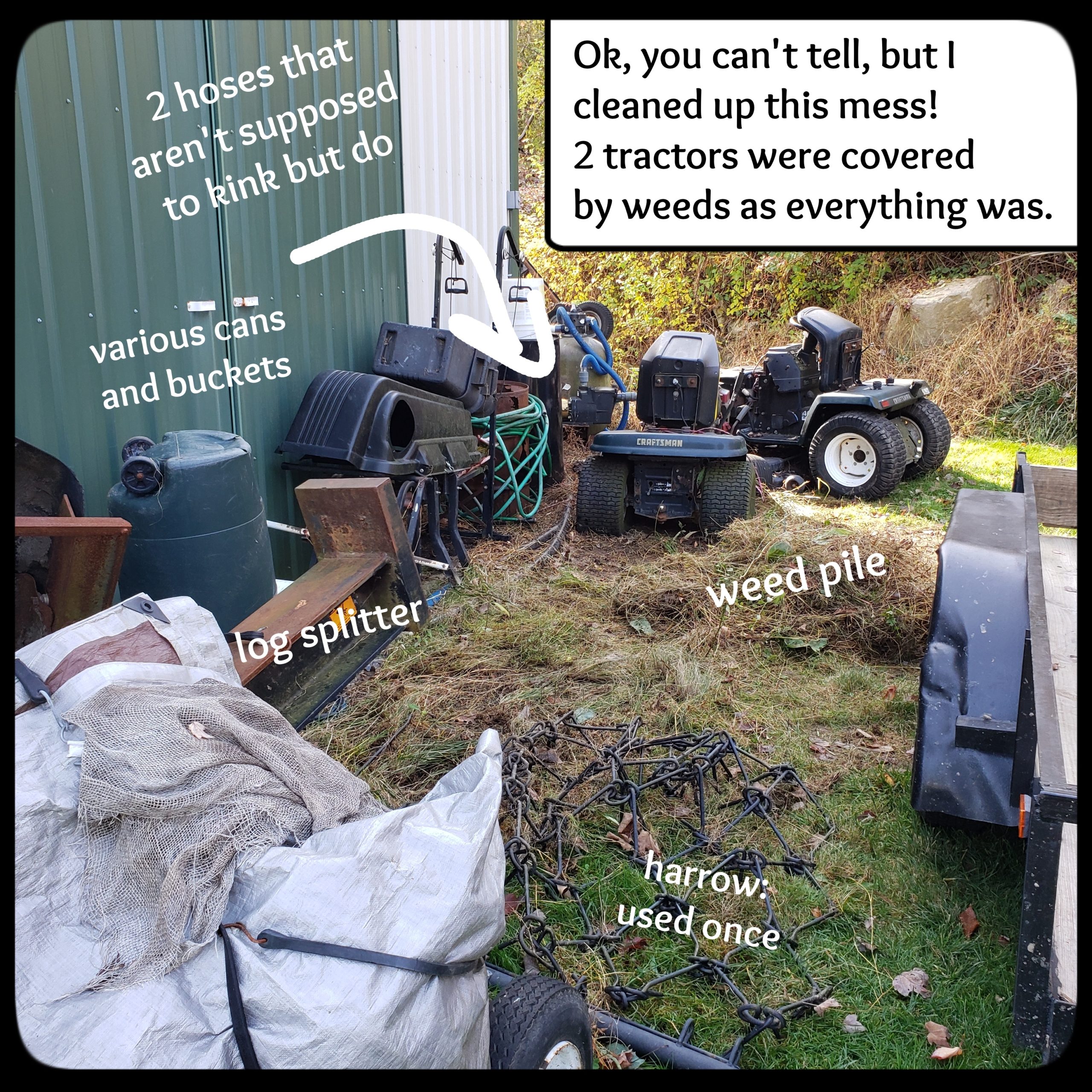 Gus finally joined me. I distributed some critter snacks and then we were ready to get to work. Months ago, I gave this area my best attempt at cleaning it up. You’d never know it. Metal drums—one so rusted and full of holes, I don’t know why we have it. A decrepit weight bench from when I was around 12-years-old. There’s a metal harrow that keeps getting buried by grass. I periodically drag it out and free it, but it just gets covered again. The Grumpy Old Man had said not to hang it up because he would need to get it down. It’s been used once. You get my point. The area is a mess.