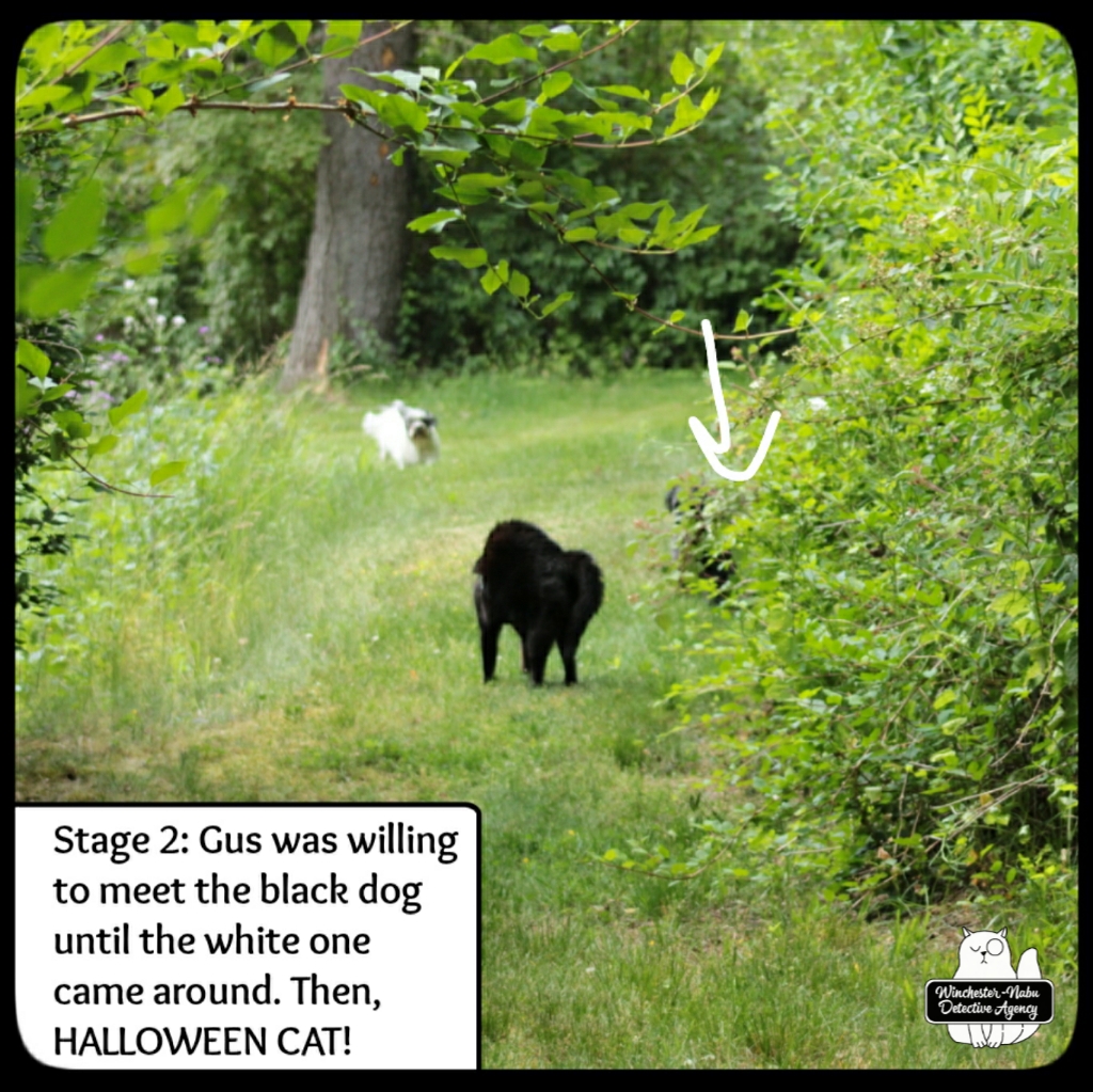 Poor Gus was in panic mode. He arched his back with his hair standing up and his tail huge. He made himself bigger than that black dog from where I was standing. I didn’t want to be mean to the dogs and yell at them. In fact it was the opposite. I’d love for Gus to challenge himself when faced with a stranger (even though he knows who these dogs are).