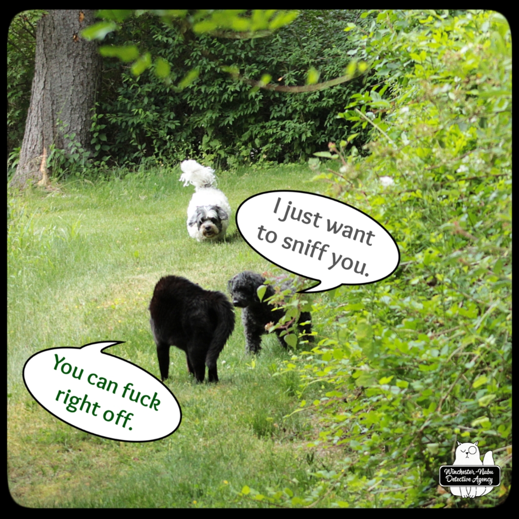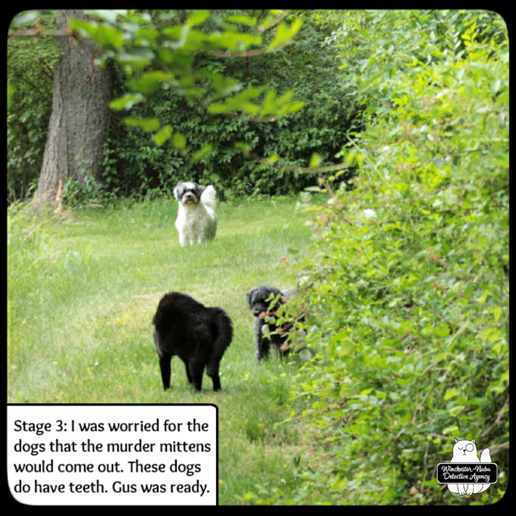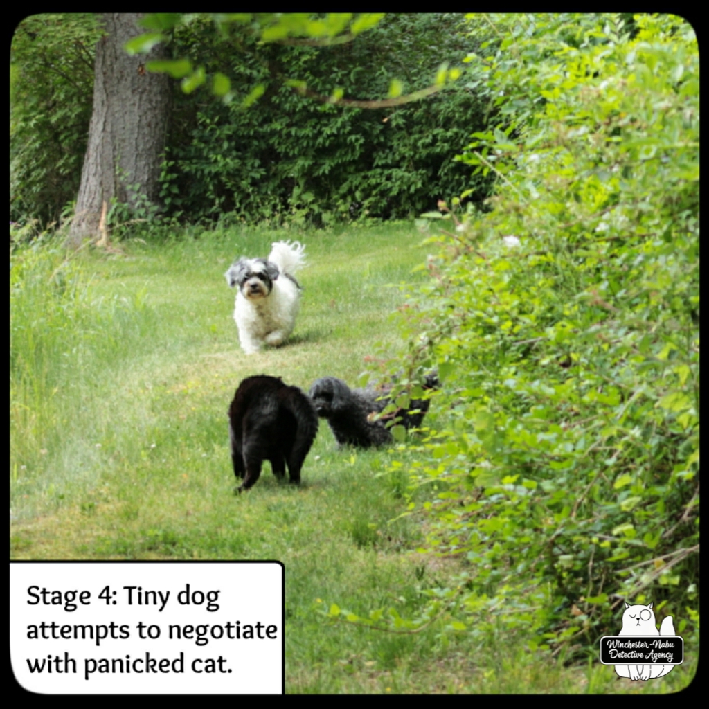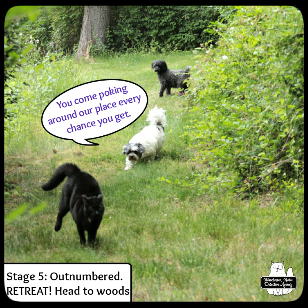 Typically, when training a cat to be an active adventure cat, it’s best to get the feline used to strange humans and other animals slowly and in a controlled way. Not everyone can call in a behaviorist and volunteer dogs to gradually get a cat used to the rambunctiousness of energetic canines. Our next door neighbors have had three dogs for several years. Gus is still nosy enough to escape my supervision and go over there to investigate which antagonizes the dogs into a barking frenzy. Two of them are small (I think possibly Lhasa Apso or Shih Tzu) and the third is a beautiful, large, black standard poodle. The poodle is the only one we’ve seen go through obedience exercises. Gus was shocked and appalled that the small dogs dared to cross their border and come over to our yard.