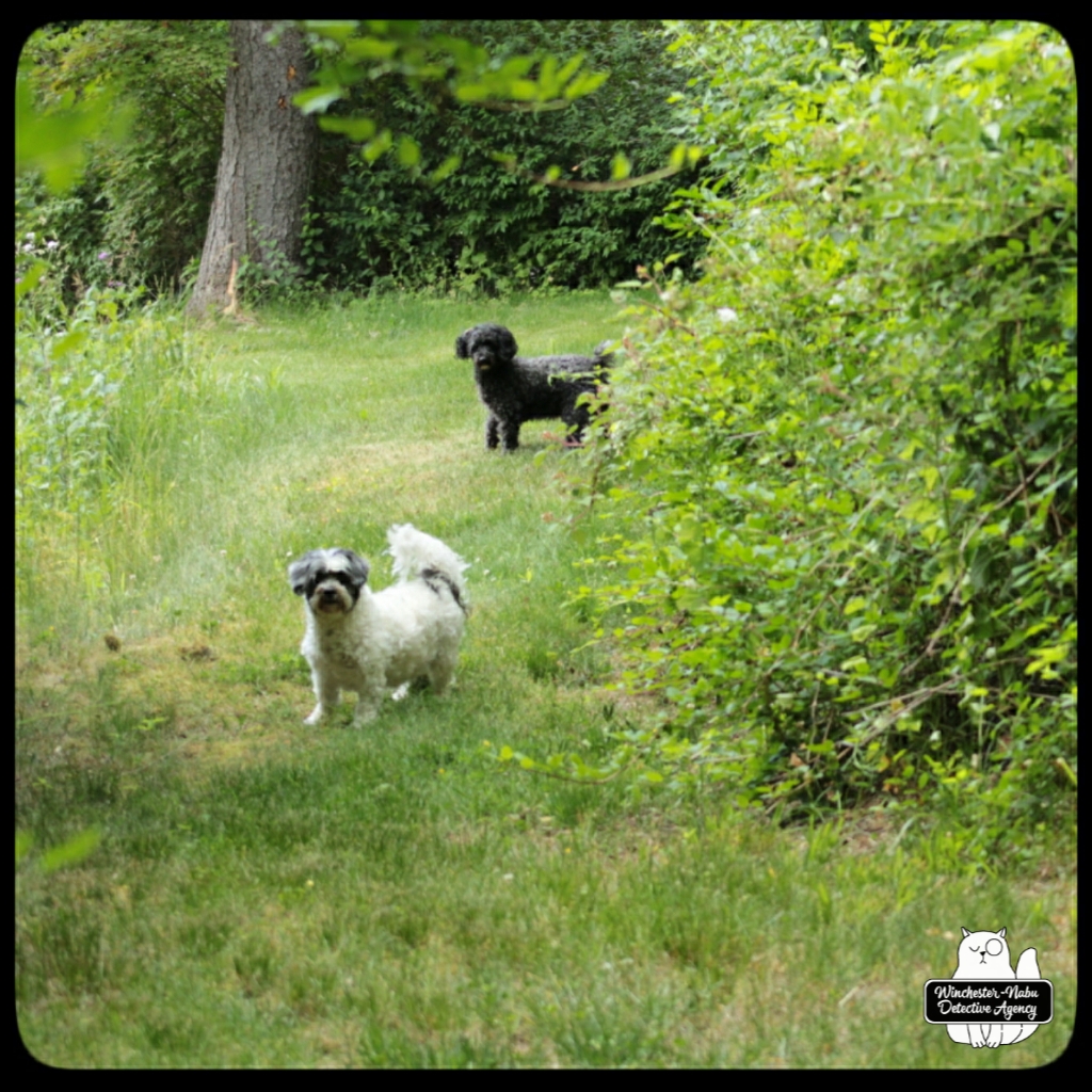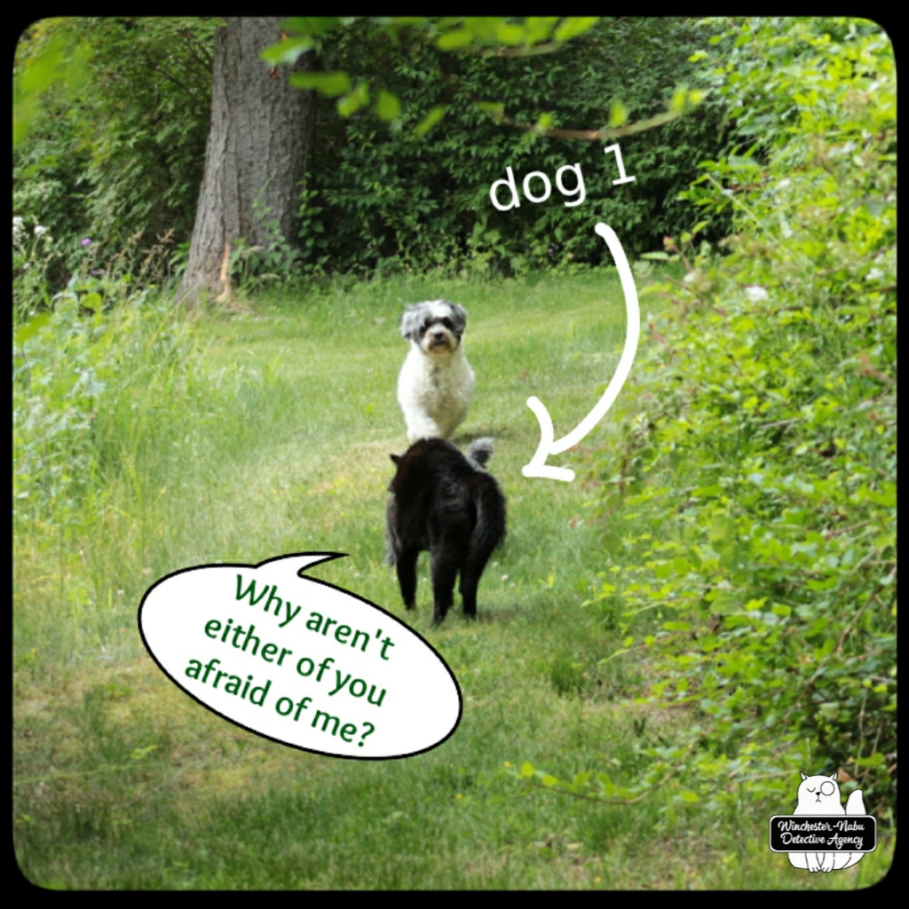 In no time at all, I saw a tiny black dog run up to Gus! I know the dog. It looked a lot smaller than normal due to its summer puppy cut. In a second, the second dog came to the end of the trail and watched.