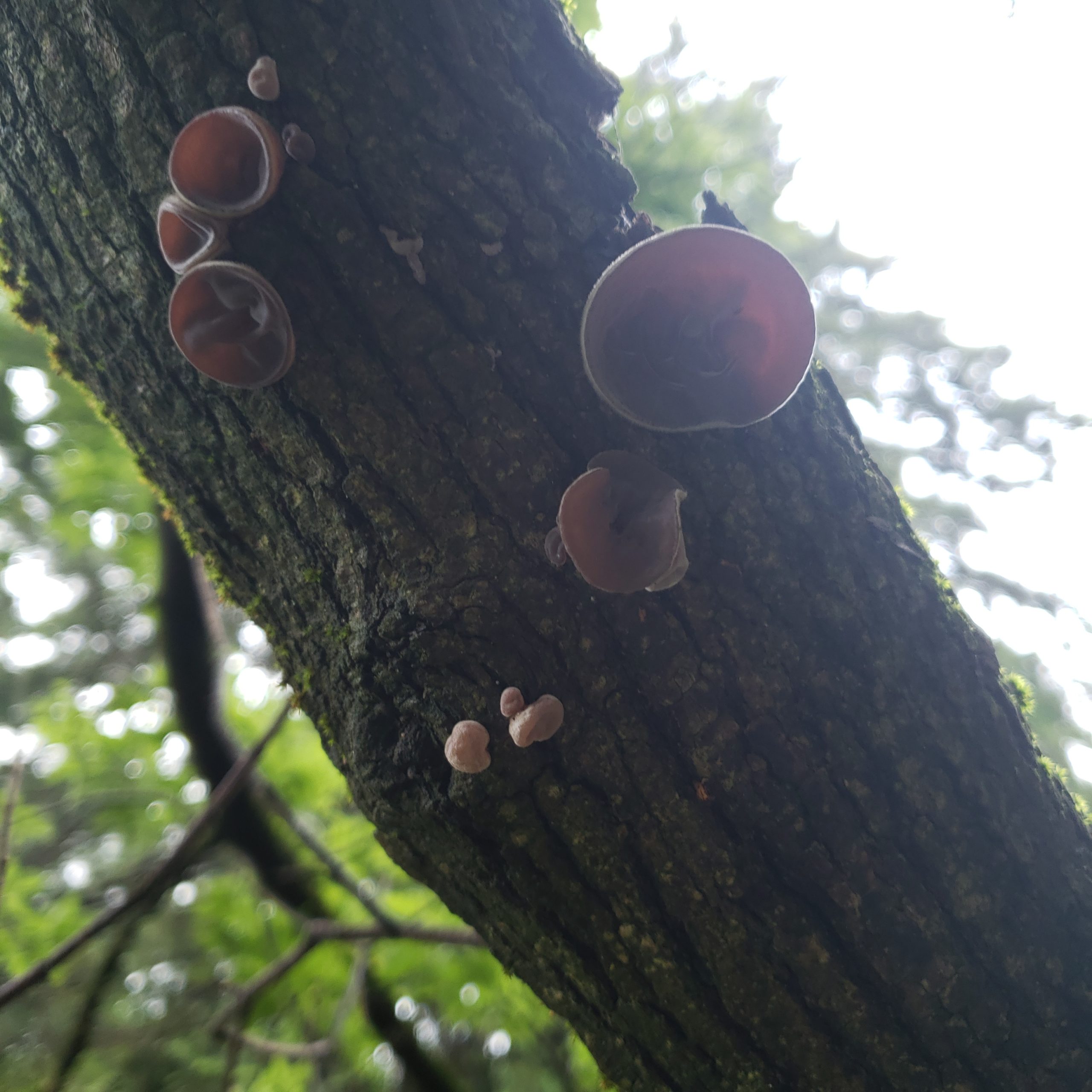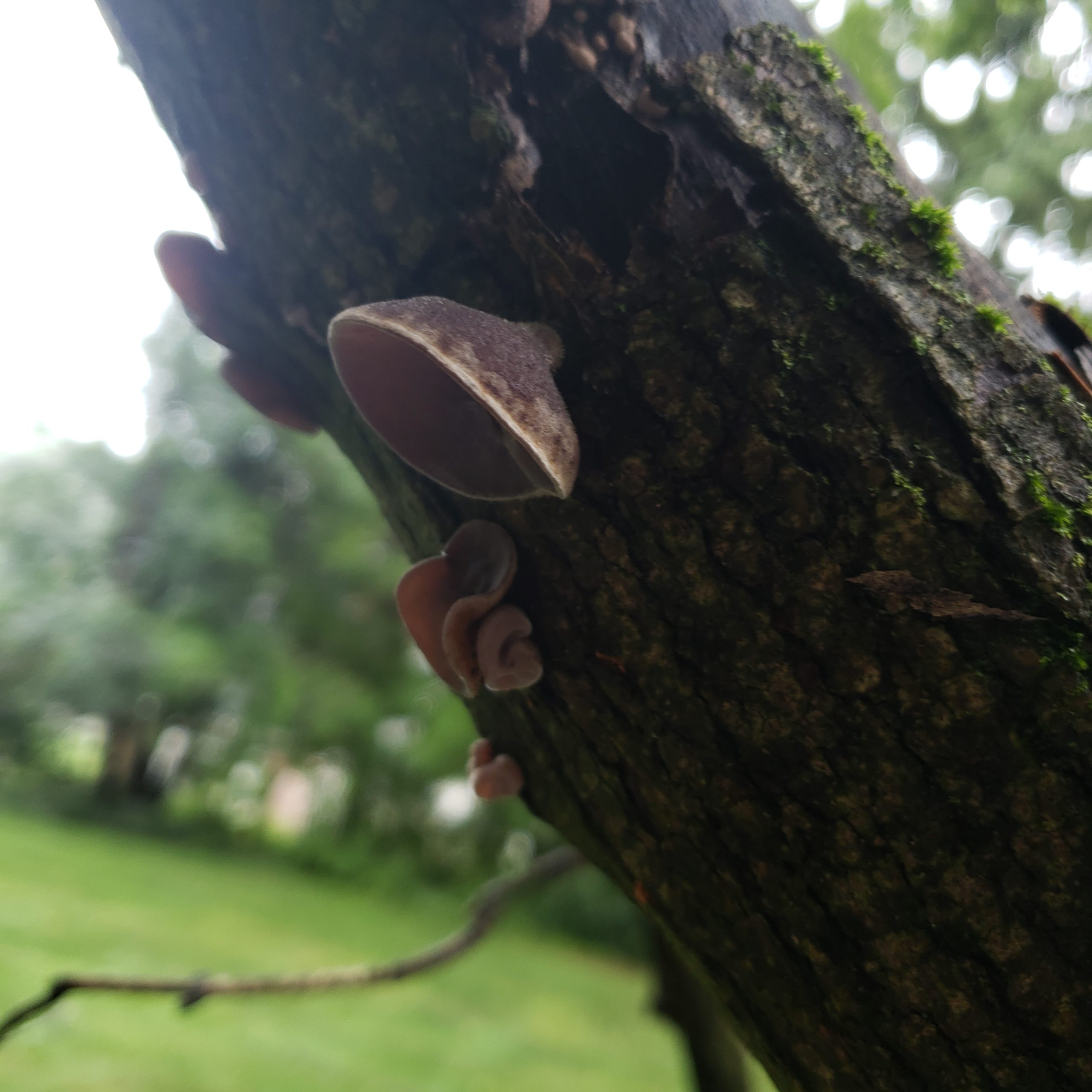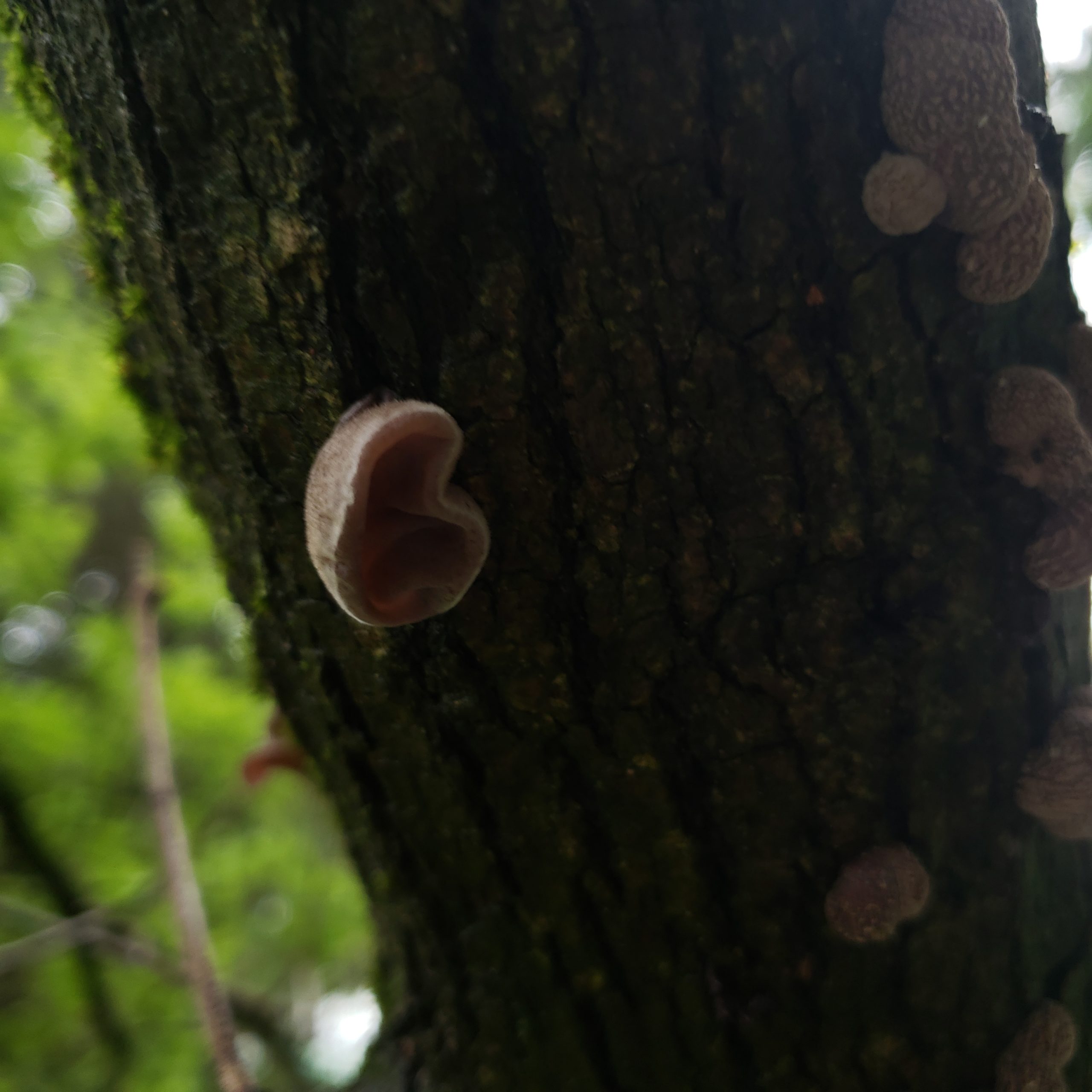 From several feet away, I could tell there were mushrooms growing on the branch along with the verdant moss. I got closer and wasn’t even thinking about the cracks in the trunk I was supposed to investigate. Moss has a hypnotic effect on me, so I was in a bit of a dreamy state. Because I had to bend down slightly to go under the branch, I was in a position for my peripheral vision to catch something that seemed odd. I had that “Spidey Sense” tingling in less than a second. I turned my head back and HOLY SHIT! THERE’S AN EAR!