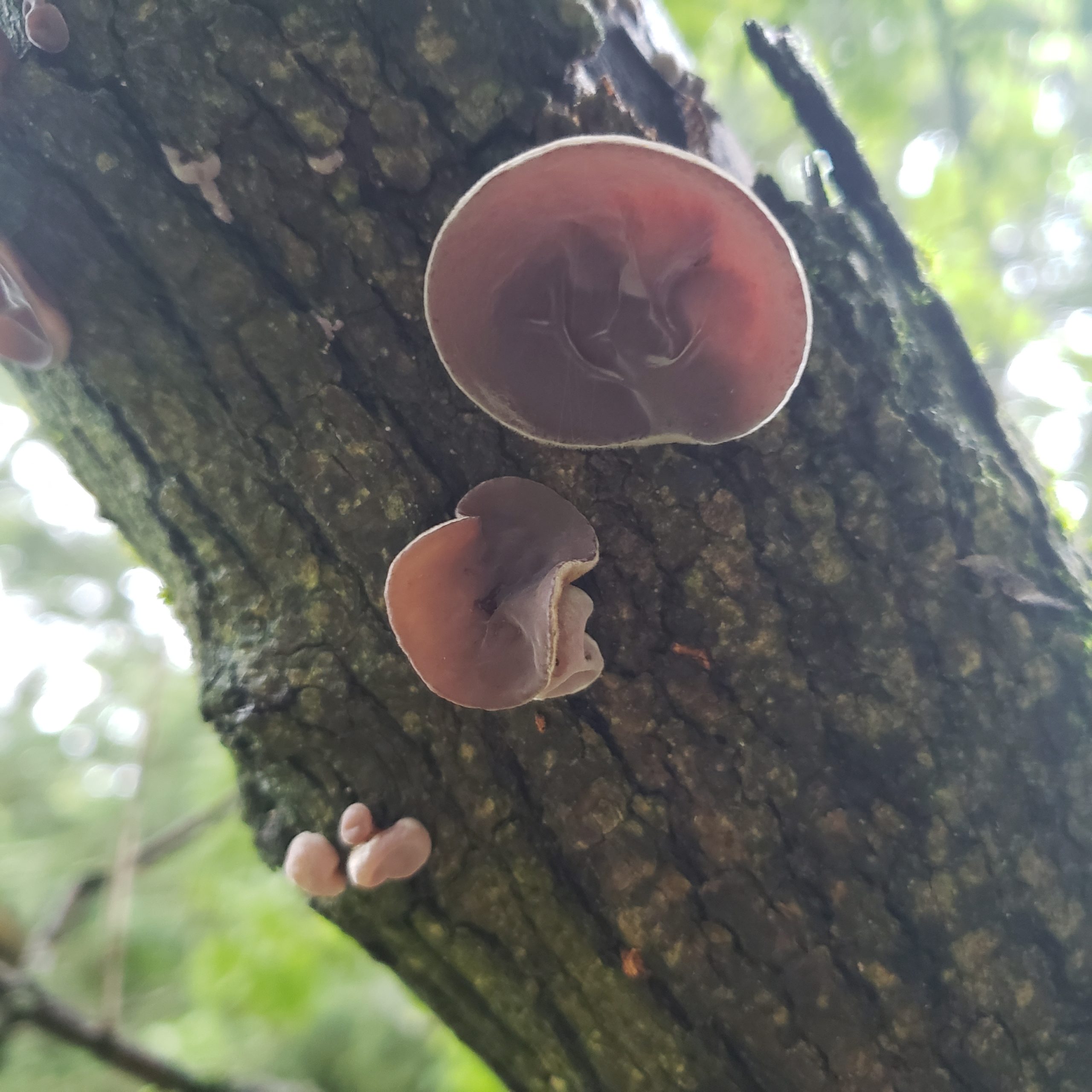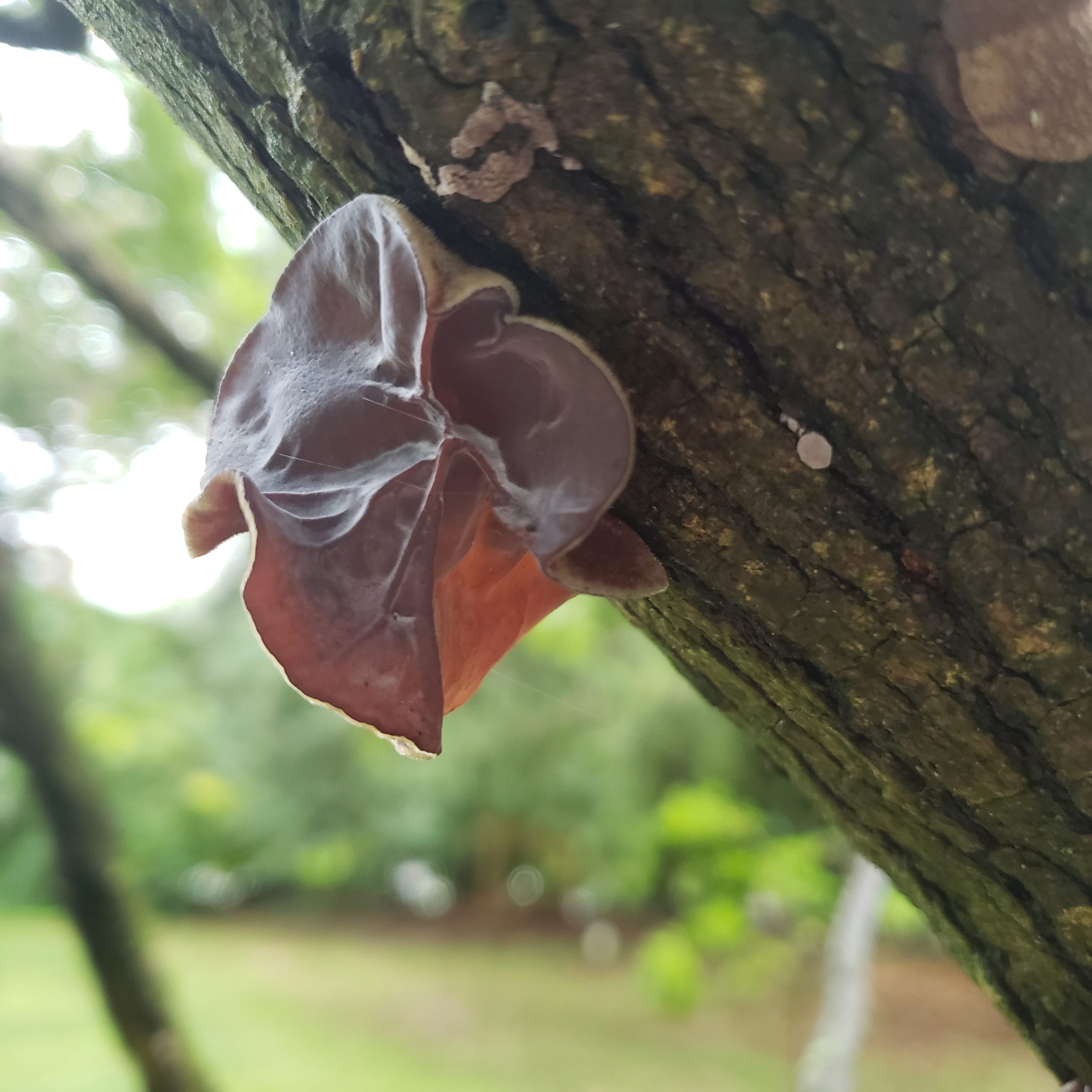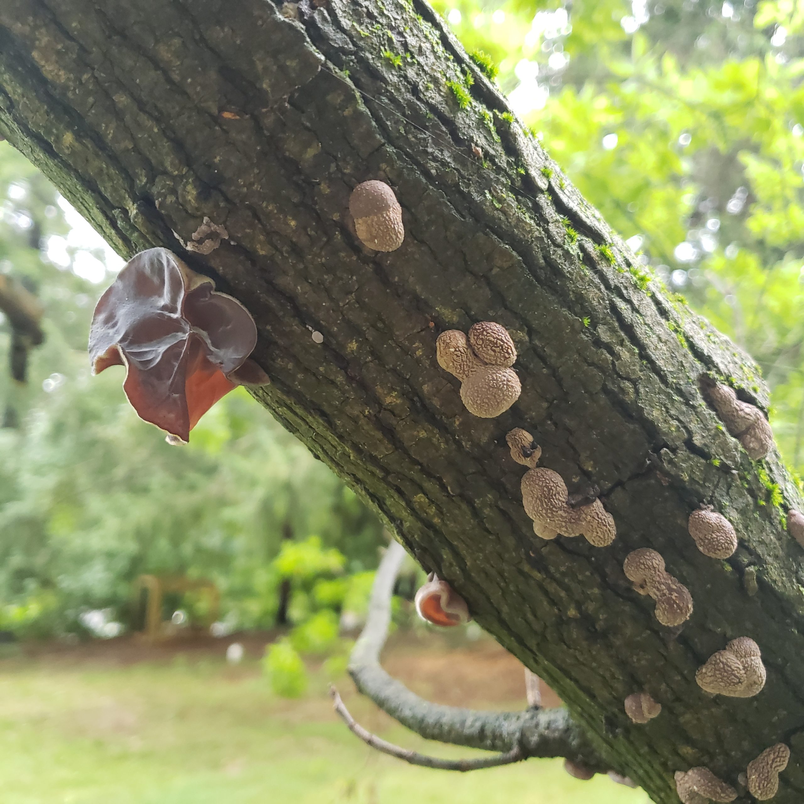 From several feet away, I could tell there were mushrooms growing on the branch along with the verdant moss. I got closer and wasn’t even thinking about the cracks in the trunk I was supposed to investigate. Moss has a hypnotic effect on me, so I was in a bit of a dreamy state. Because I had to bend down slightly to go under the branch, I was in a position for my peripheral vision to catch something that seemed odd. I had that “Spidey Sense” tingling in less than a second. I turned my head back and HOLY SHIT! THERE’S AN EAR!
