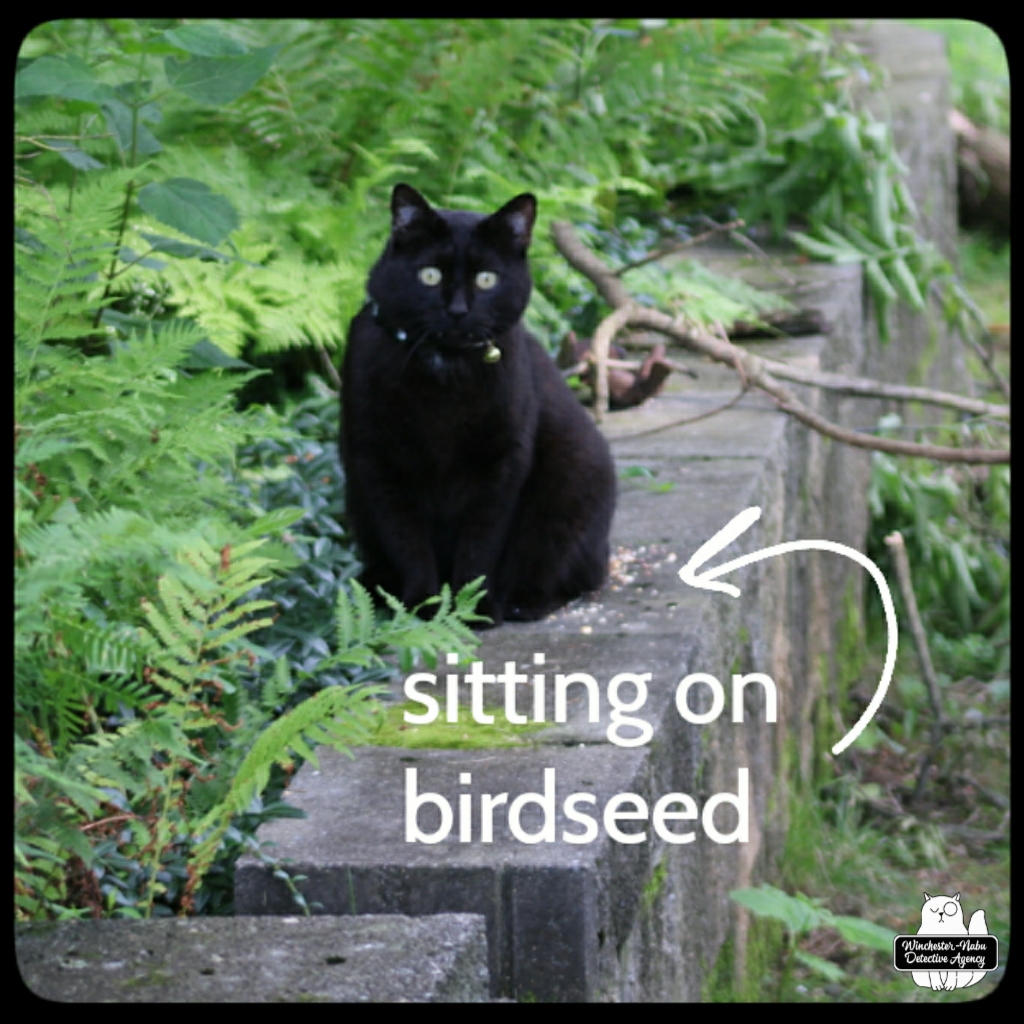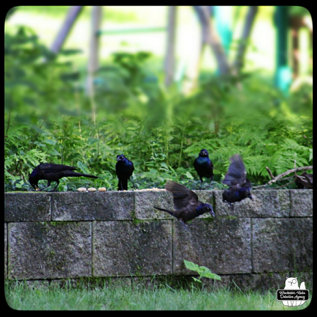 Now that the grackles have discovered the bountiful buffets of the Winchester-Nabu property, they come around more this year than previous years. Fortunately for the Bluejay Gang, they are less afraid of me. If I stand close enough to a tree to throw peanuts, the grackles will take off and look for one of the other birdseed snack bars like the garden wall.