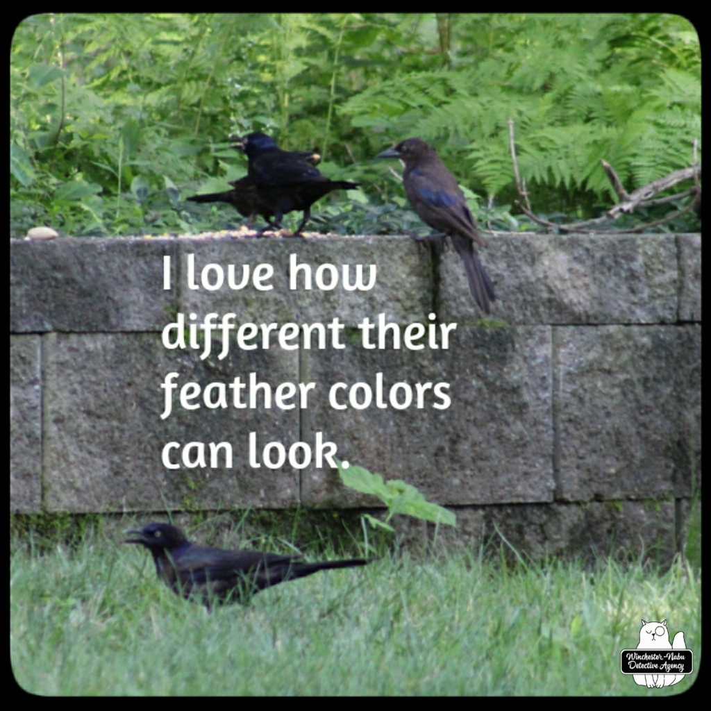 Personally, we love to watch the grackles. Gus and Oliver have enjoyed watching them from the observation platform. I love taking their photos even if the pictures are never in focus because of their remarkable sheen and iridescent coloring of black, brown, blue, purple, and green. They’re gorgeous! The adults also have piercing yellow eyes that stand out in a striking contrast.