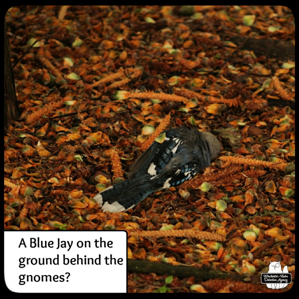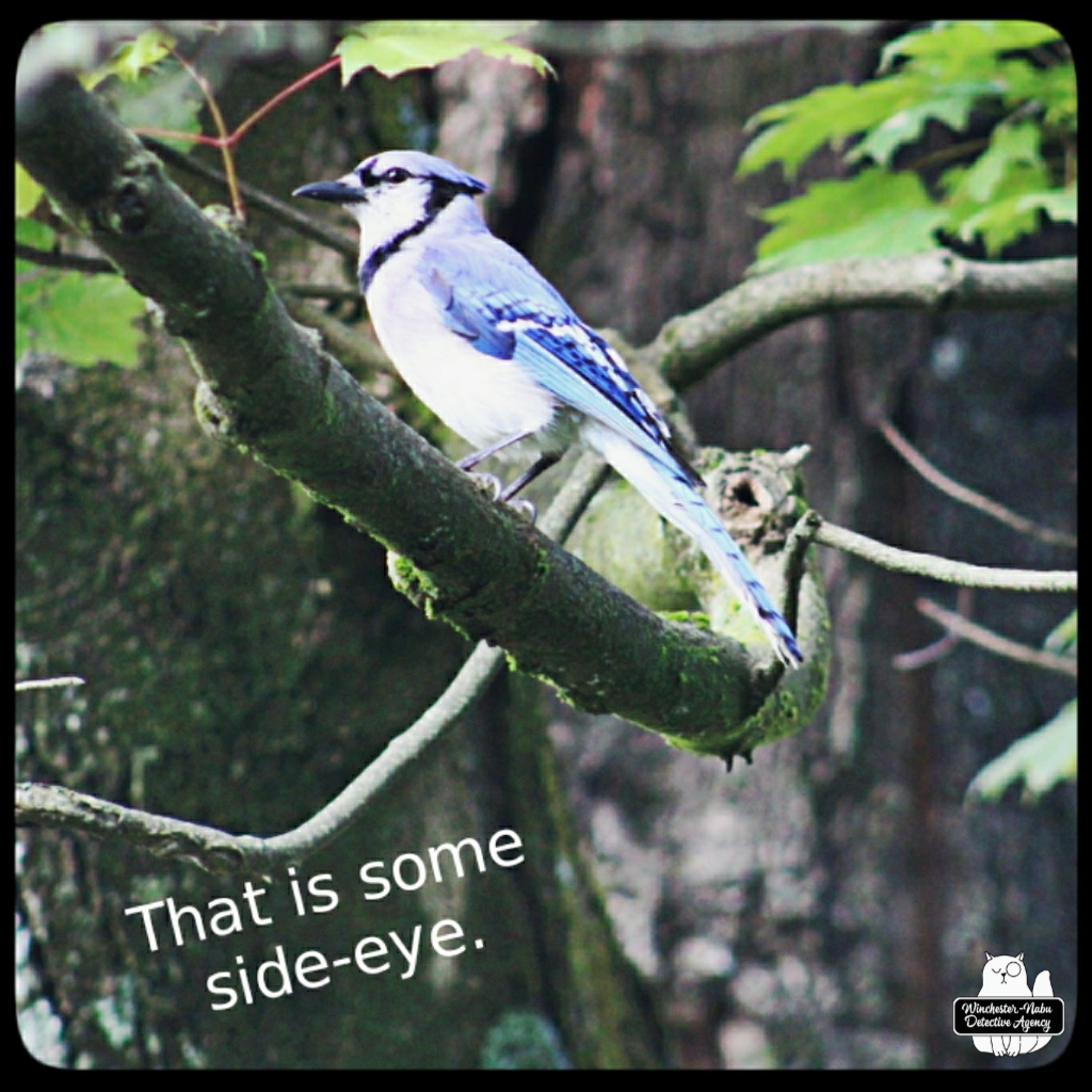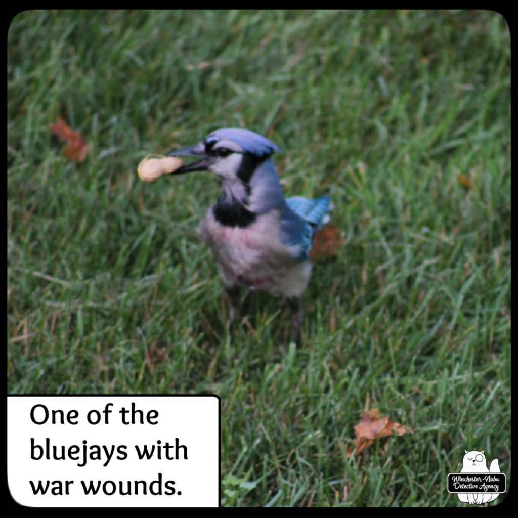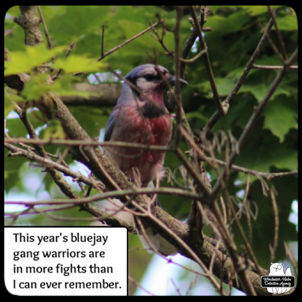We have spent a lot of time observing our local blue jays and consider them a well-organized gang. That is, until it appeared that two rival gangs were on the same turf. Though they may collectively be called a party, a band, or a scold; we refer to these locals as The Bluejay Gang and have written extensively about them. In fact, Louie Eggs appears in the first comic book issue from The Winchester-Nabu Detective Agency.