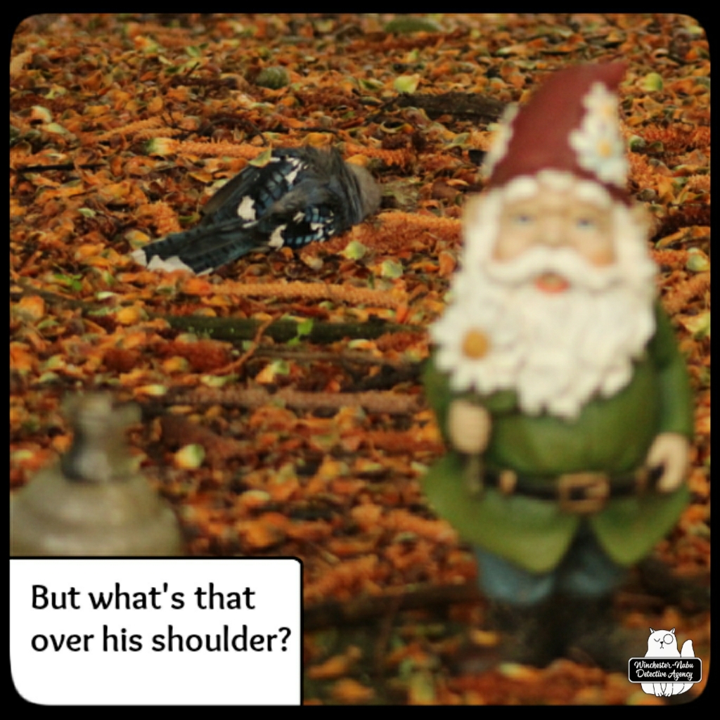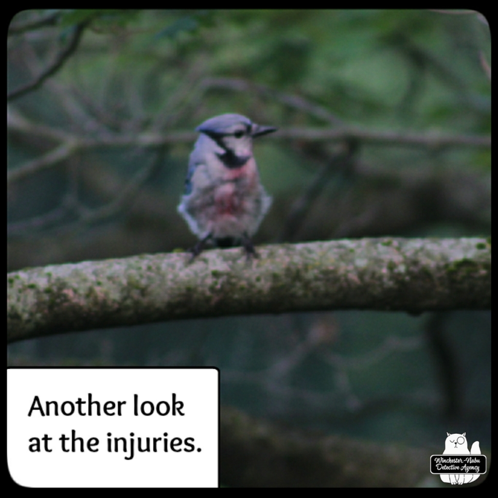 Gus looked around the around where the body lay. “I don’t see any blood. Why isn’t there any blood? The jays have been having bloody fights lately. Just dripping in blood, if ya know what I mean.”